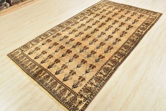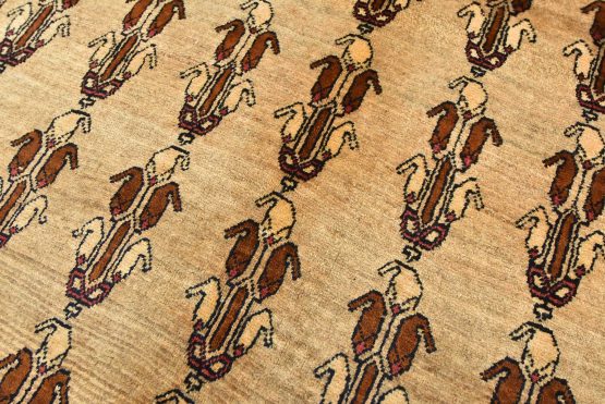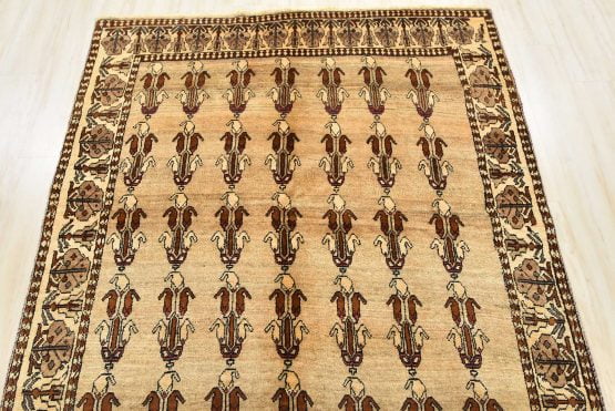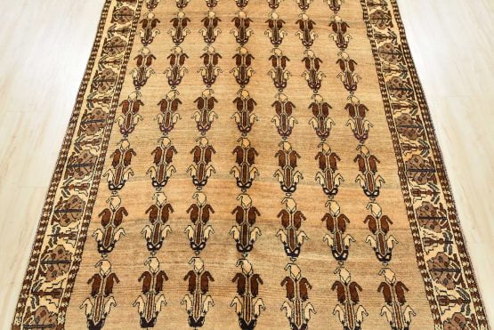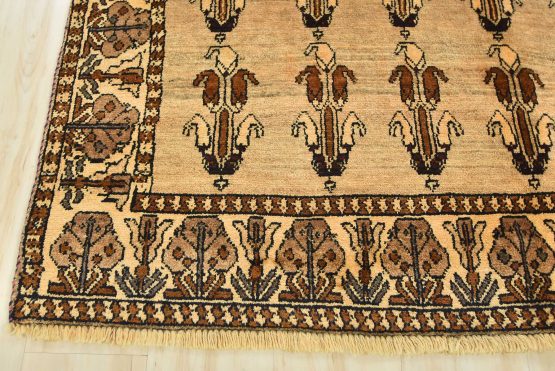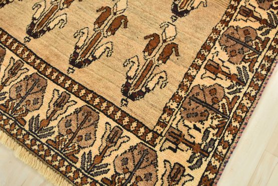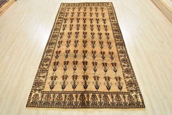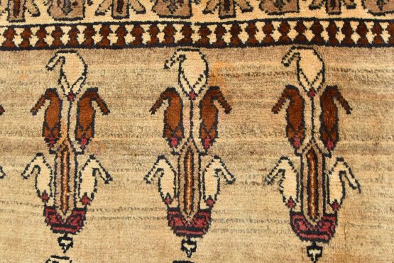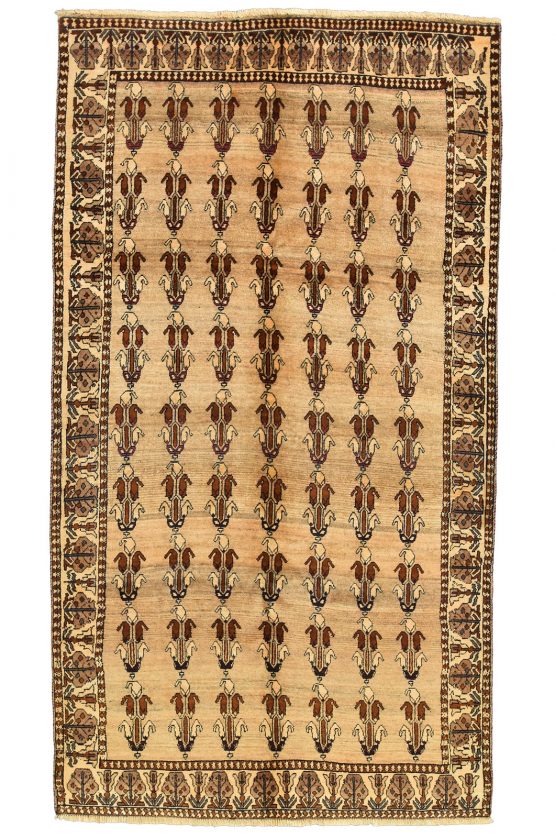 An authentic vintage tribal Gabbeh rug hand-knotted with fine wool and natural dyes. This nomadic oriental rug features an all-over pattern of geometric botanical motifs set against a beige background. There is a small area where the dyes have bled; please refer to the photos. Otherwise, the rug has a full wool pile and is in very good condition.