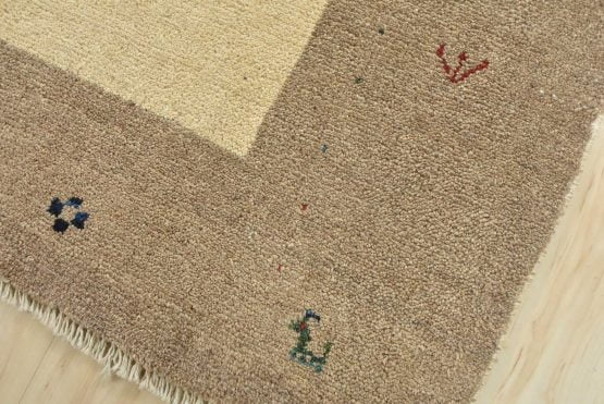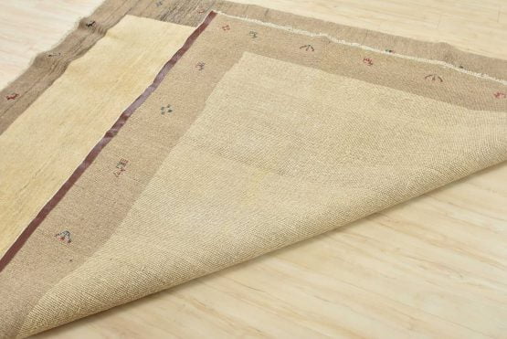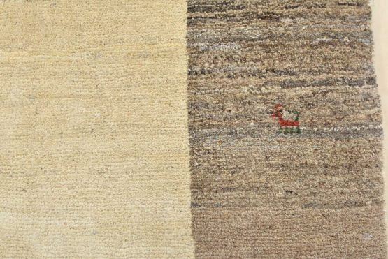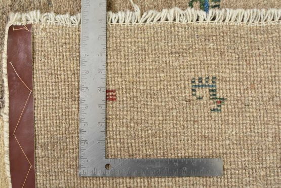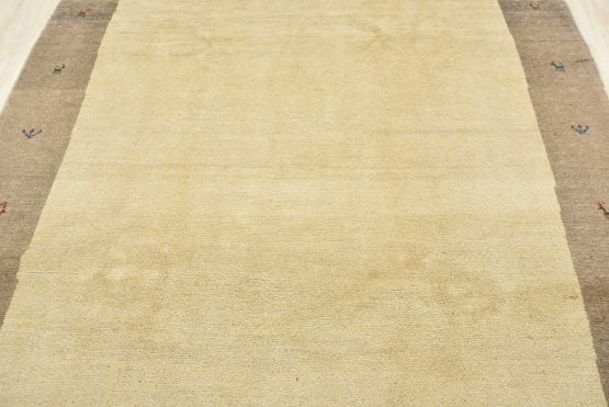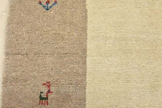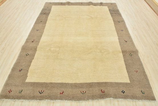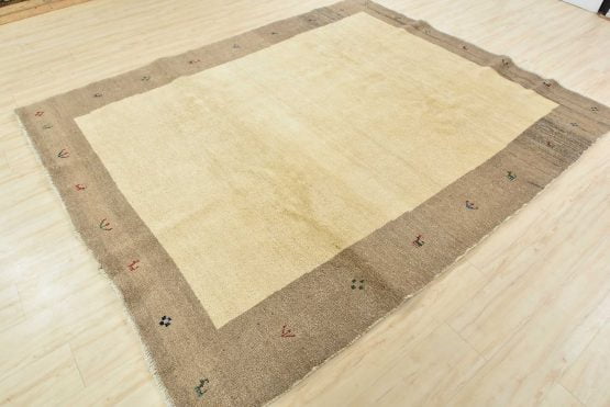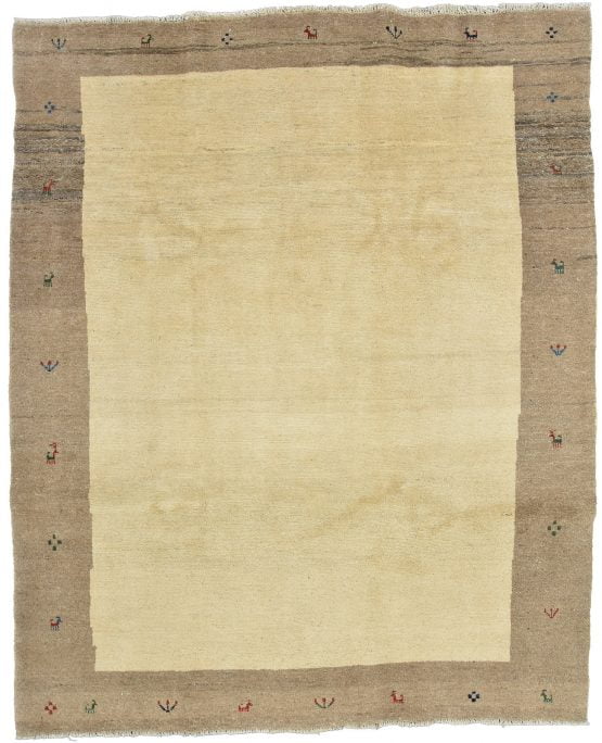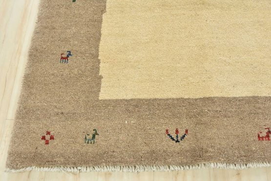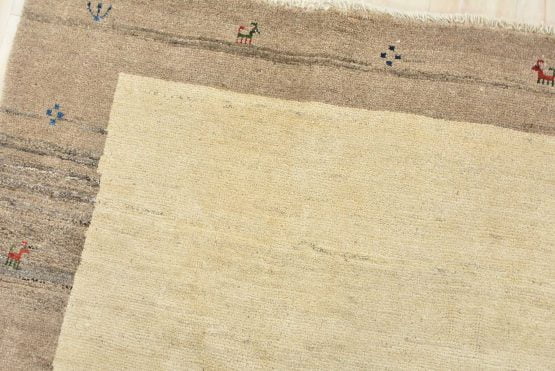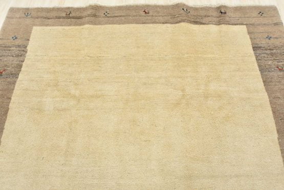 An authentic vintage tribal Gabbeh rug hand-knotted with fine wool and natural dyes. This nomadic oriental rug features a solid ivory background with geometric motifs and animal figures woven into the border. It has a full wool pile with no worn areas and is in very good condition.