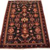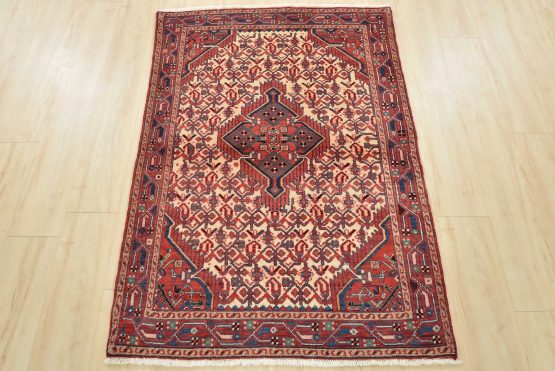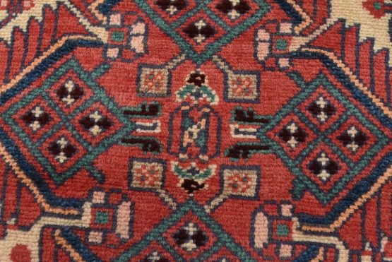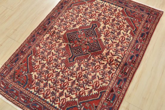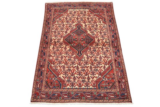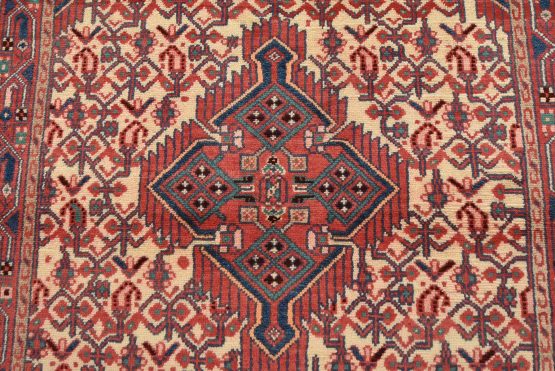 An authentic vintage tribal Hamedan rug hand-knotted with fine wool and natural dyes. This nomadic oriental rug features a geometric central medallion surrounded by a geometric botanical pattern set against an ivory background. It has a full wool pile with no worn areas and is in very good condition.
