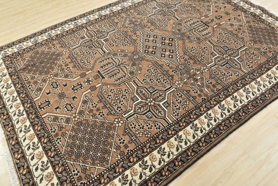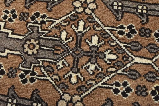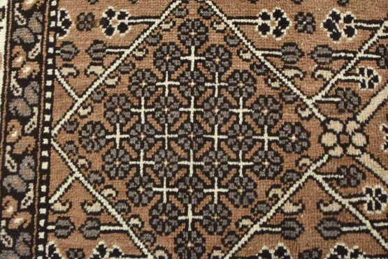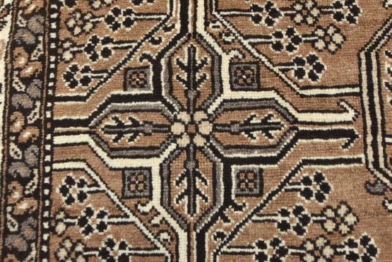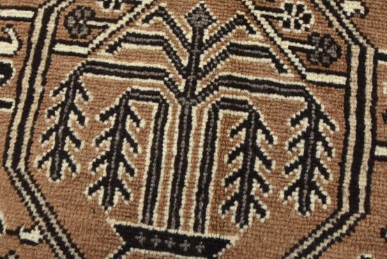 An authentic vintage tribal Baloch rug hand-knotted with an all-wool pile on a cotton foundation. This oriental rug features a small central medallion surrounded by other geometric motifs set against a brown background. It has a full wool pile with no worn areas and is in very good condition.