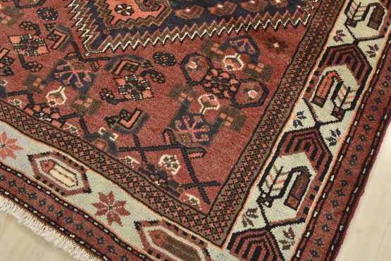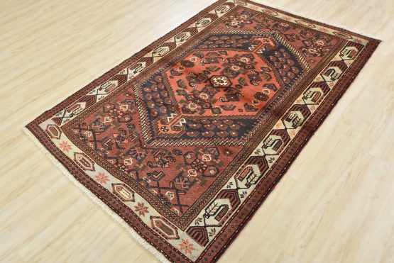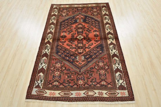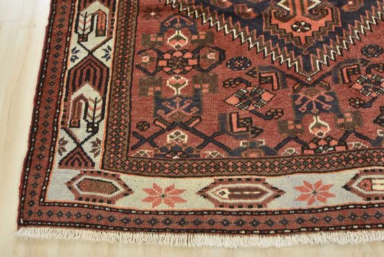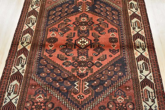 An authentic vintage tribal Hamedan rug hand-knotted with fine wool and natural dyes. This nomadic oriental rug features a central geometric medallion surrounded by geometric motifs. The wool pile shows minor wear; see photos. Otherwise, this rug is in very good condition.