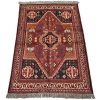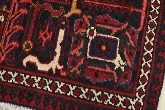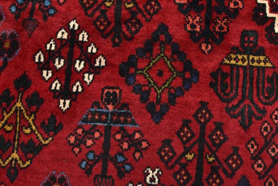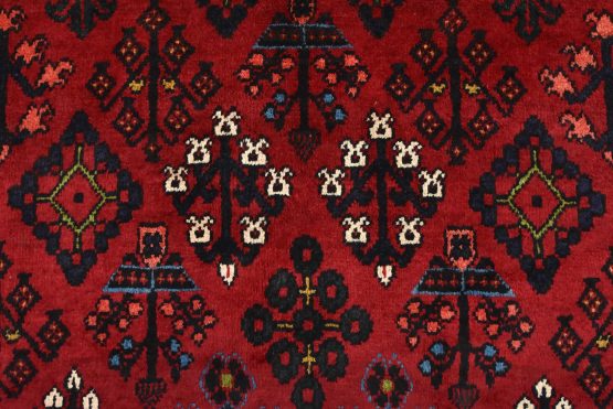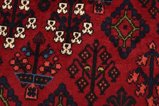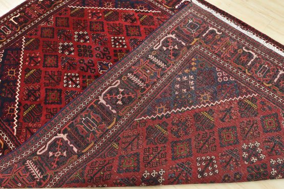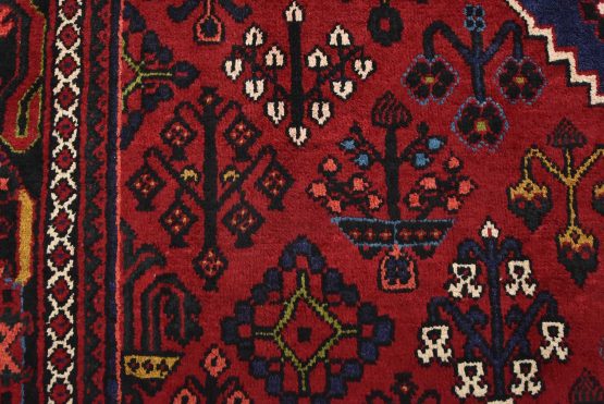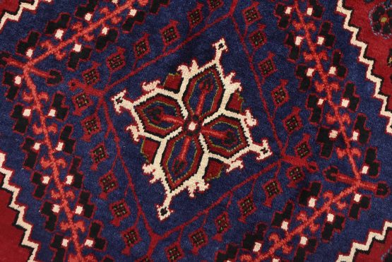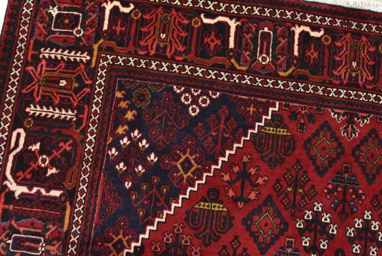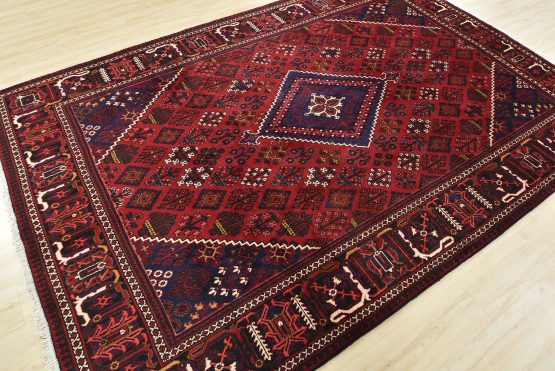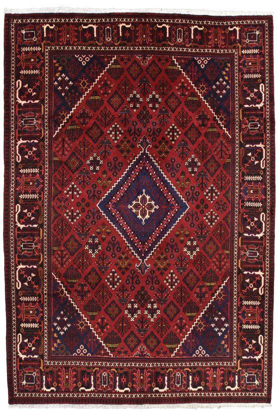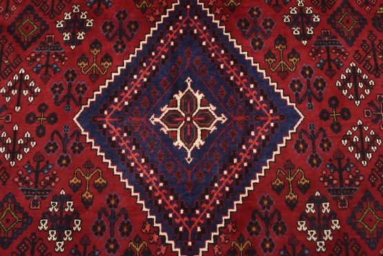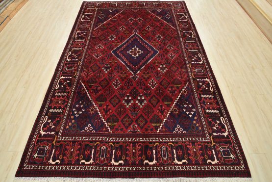 An authentic vintage traditional tribal Joshagan rug hand-knotted with fine wool and natural dyes. This nomadic oriental rug features a diamond-shaped medallion surrounded by geometric motifs set against a red background. It has a full wool pile with no worn areas and is in very good condition.