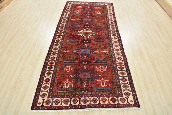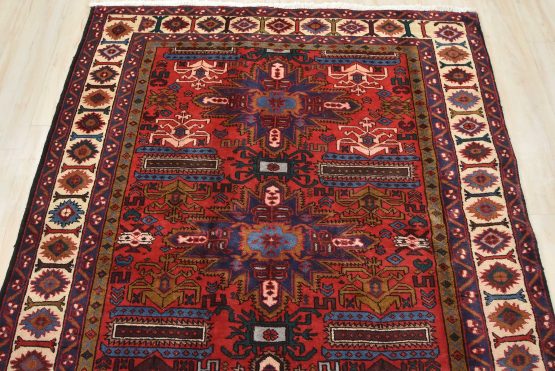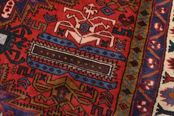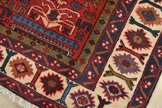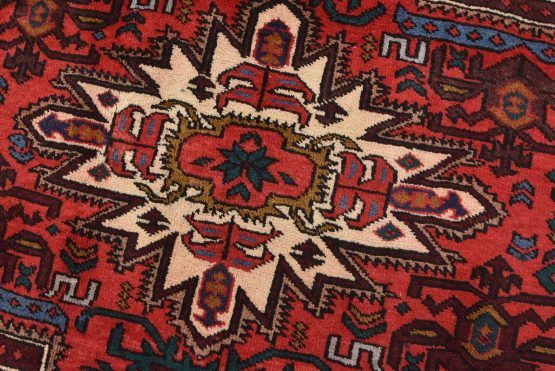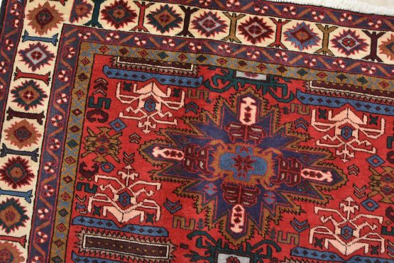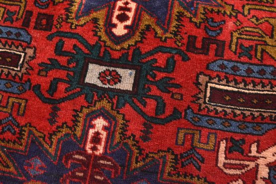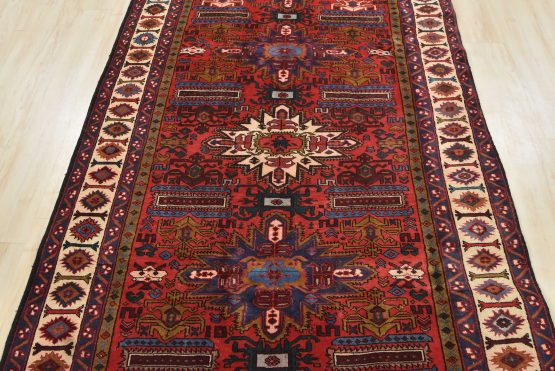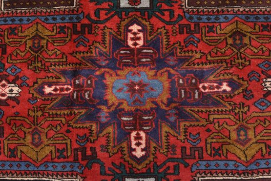 An authentic vintage tribal Karajeh rug hand-knotted with fine wool and natural dyes. This nomadic oriental rug features a row of geometric medallions surrounded by geometric motifs set against a red background. The wool pile shows some minor wear; please refer to the photos. Otherwise, the rug is in very good condition.