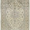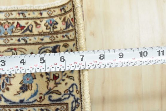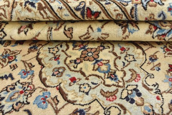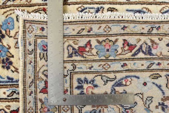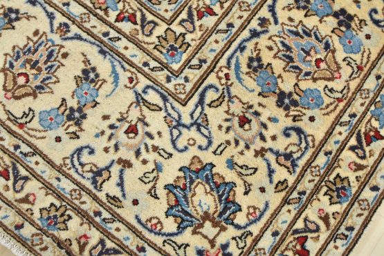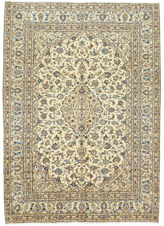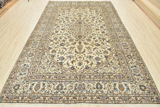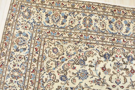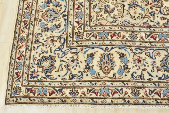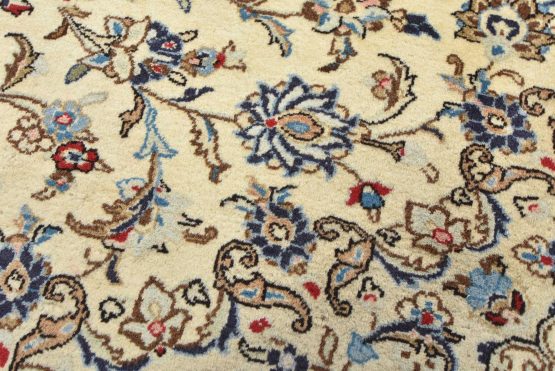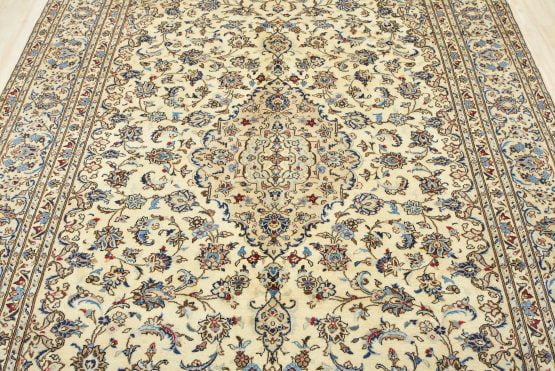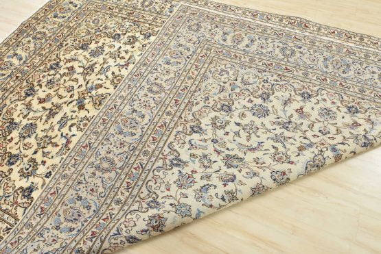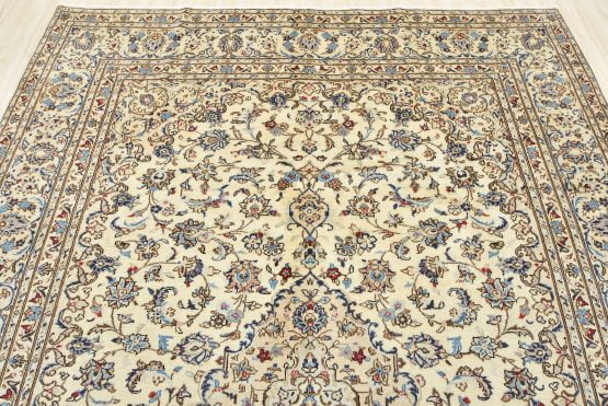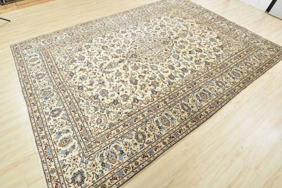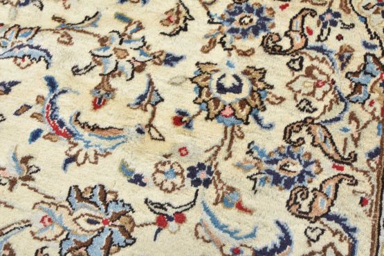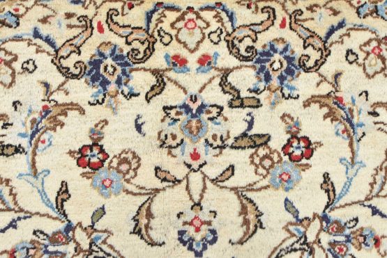 An authentic vintage traditional Kashan rug hand-knotted with fine wool and natural dyes. This oriental rug features a central medallion surrounded by a floral design set against an ivory background. It has a full wool pile with no worn areas and is in very good condition.