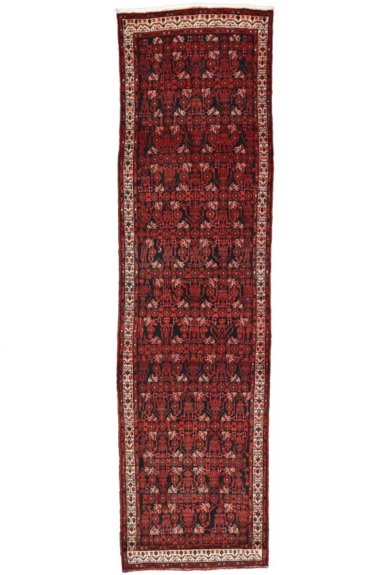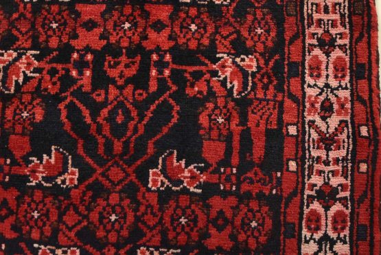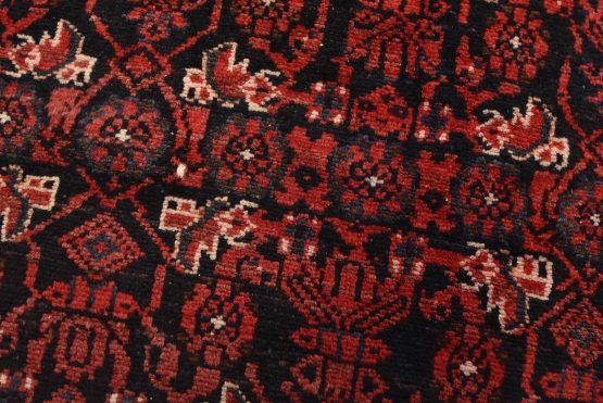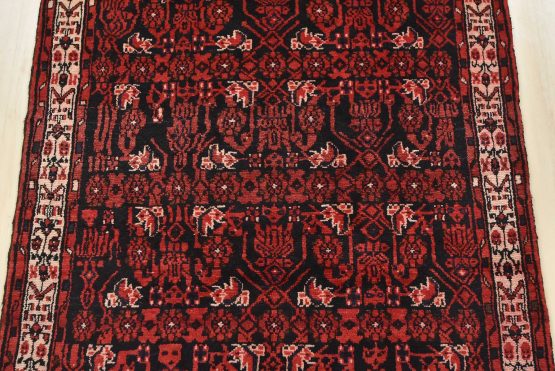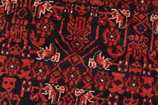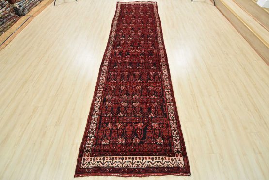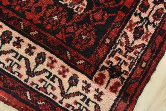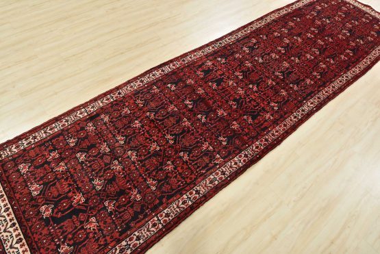 An authentic semi-antique tribal Hamedan runner hand-knotted with fine wool and natural dyes. This nomadic oriental rug features an all-over geometric botanical pattern set against a black background. The wool pile does show some minor wear, and some dyes have bled through the border; please refer to the photos. Otherwise, this rug is in very good condition.