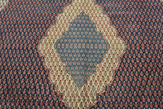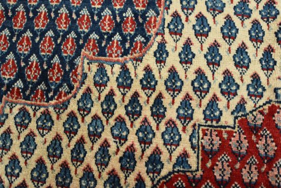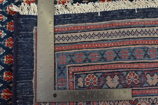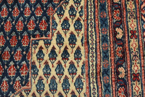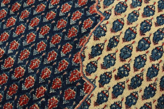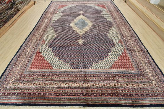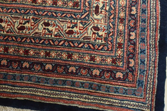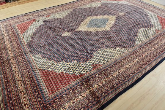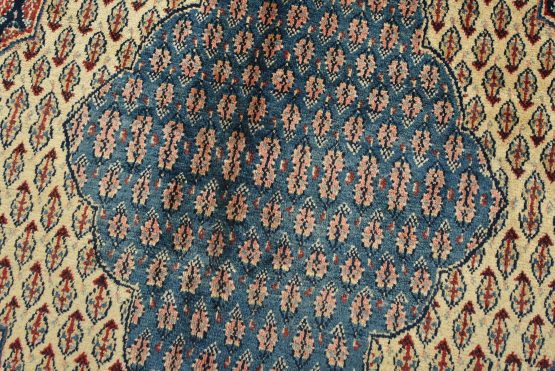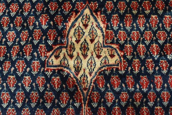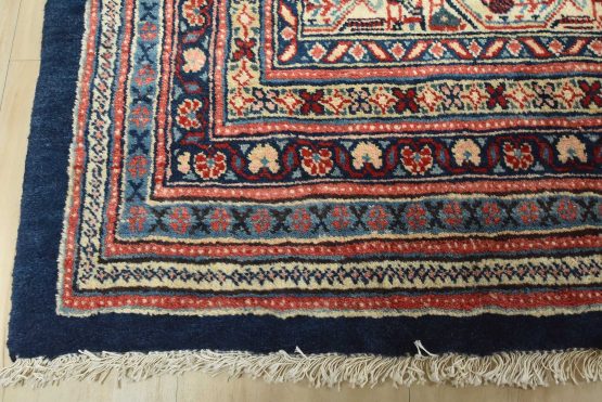 An authentic vintage traditional Mir rug hand-knotted with fine wool and natural dyes. This oriental rug features a central medallion surrounded by a small-scale geometric Boteh pattern set against a dark blue background. It has a full wool pile with no worn areas and is in very good condition.