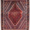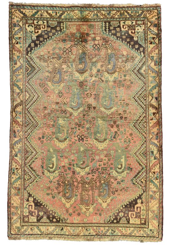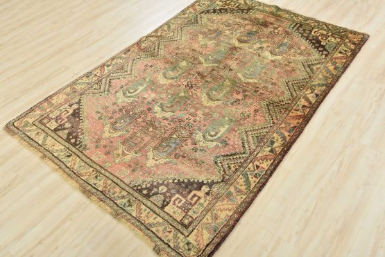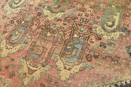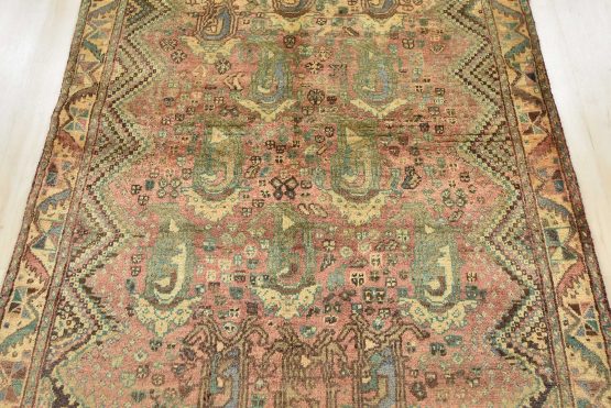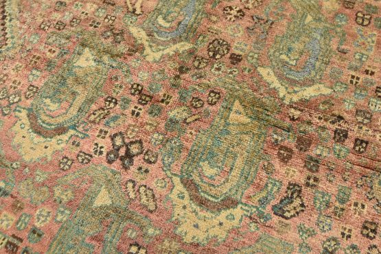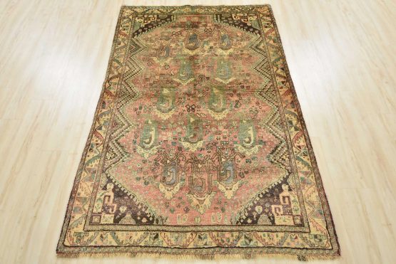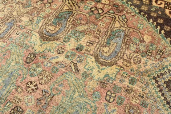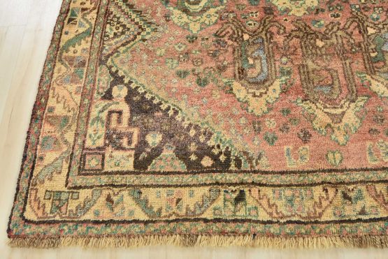 An authentic vintage tribal Qashqai rug hand-knotted with fine wool and natural dyes. This nomadic oriental rug features an all-over paisley design set against a pink background. The wool pile shows some minor wear; please refer to the photos. Otherwise, this rug is in very good condition.