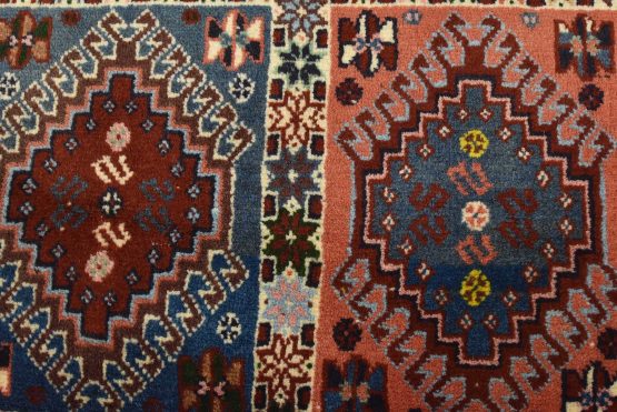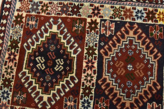An authentic vintage tribal Yalameh rug hand-knotted with fine wool and natural dyes. This finely woven nomadic rug features a panel design composed of geometric motifs. It has a full wool pile with no worn areas and is in very good condition.
