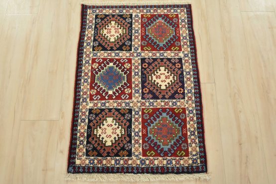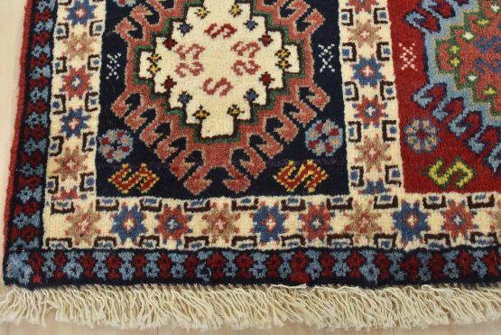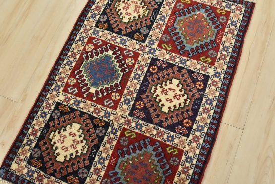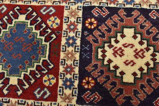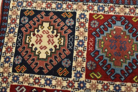 An authentic vintage tribal Yalameh rug hand-knotted with fine wool and natural dyes. This finely woven nomadic rug features a panel pattern of geometric motifs. It has a full wool pile with no worn areas and is in very good condition.
