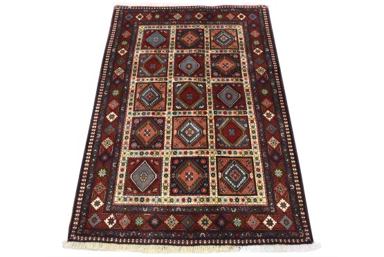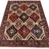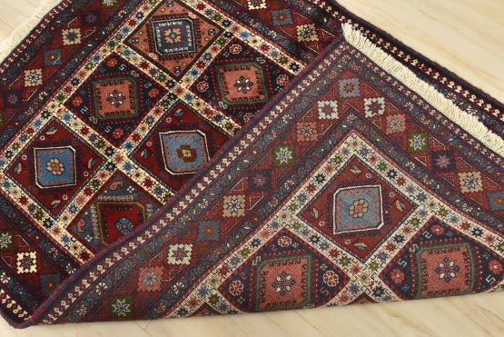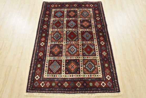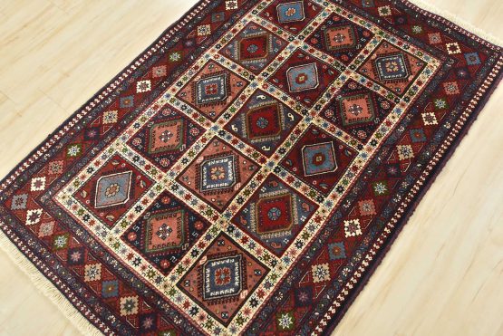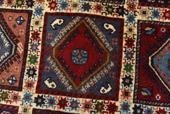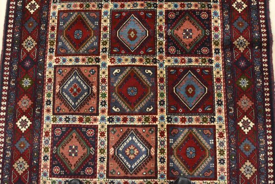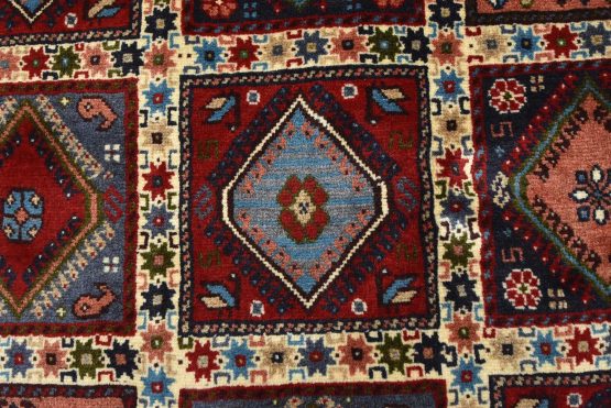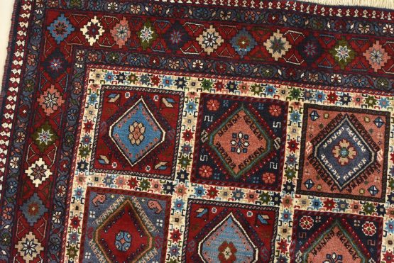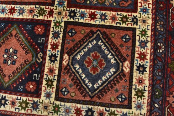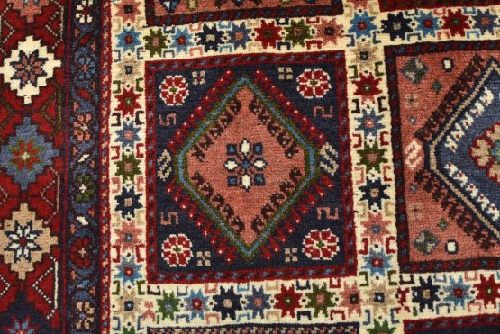 An authentic vintage tribal Yalameh rug hand-knotted with fine wool and natural dyes. This finely woven nomadic rug features an all-over panel design composed of geometric motifs. It has a full wool pile with no worn areas and is in very good condition.