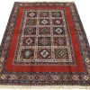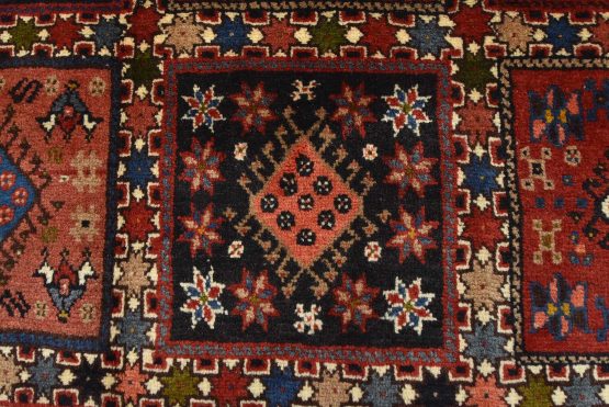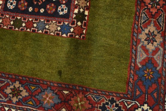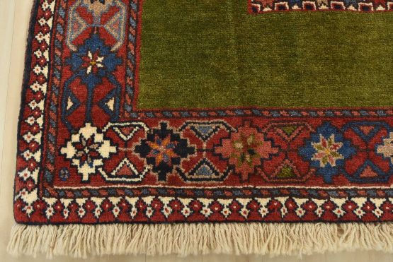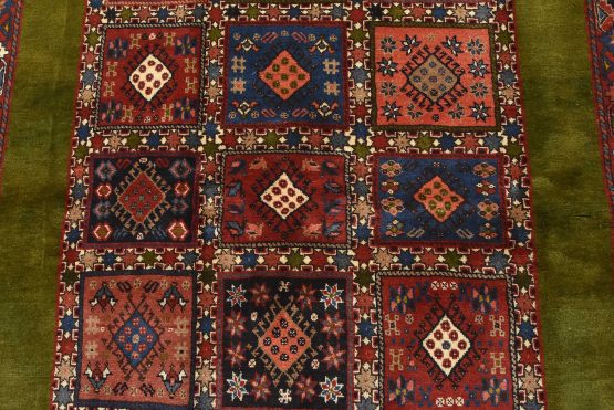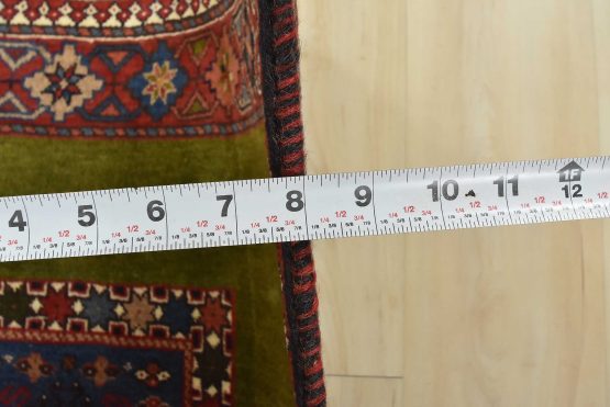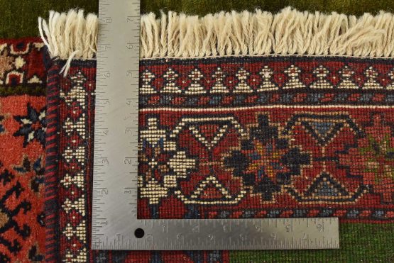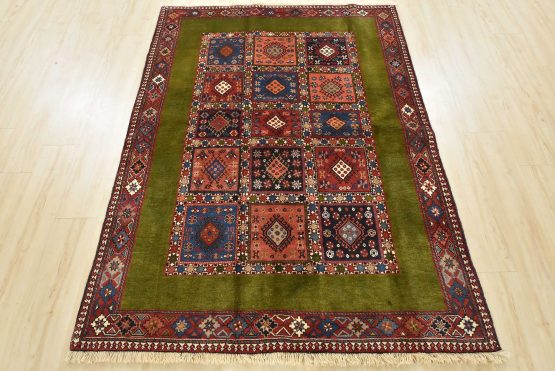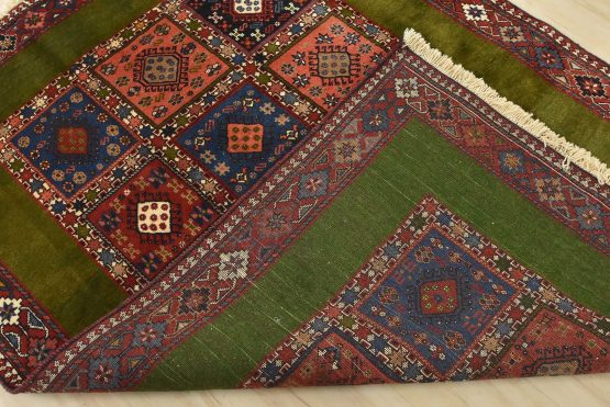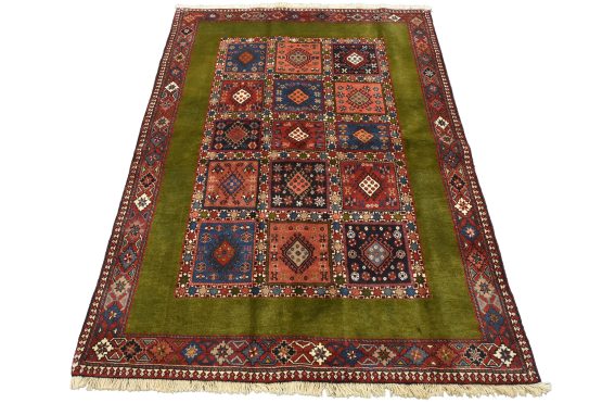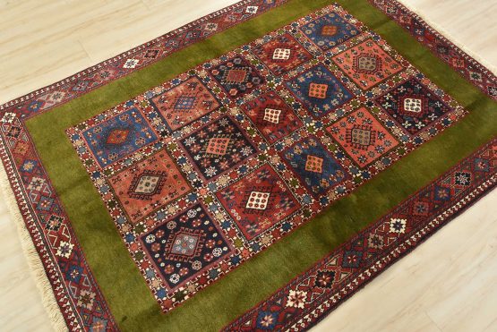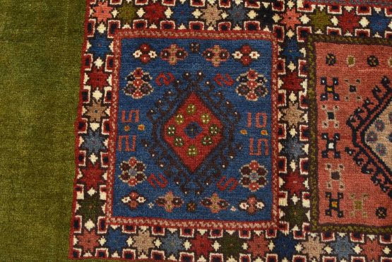 An authentic vintage tribal Yalameh rug hand-knotted with fine wool and natural dyes. This finely woven nomadic rug features a panel design of geometric motifs set against a green background. It has a full wool pile with no worn areas and is in very good condition.