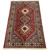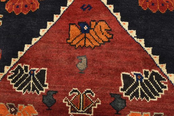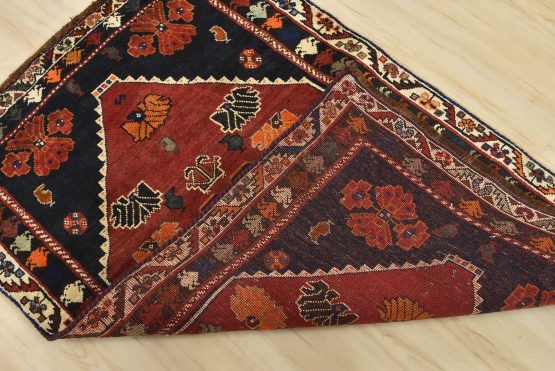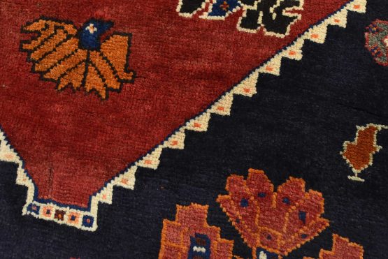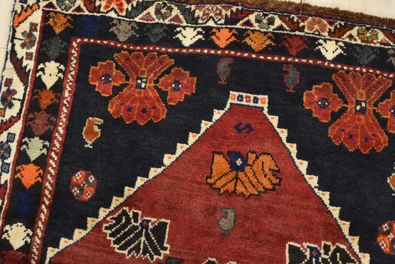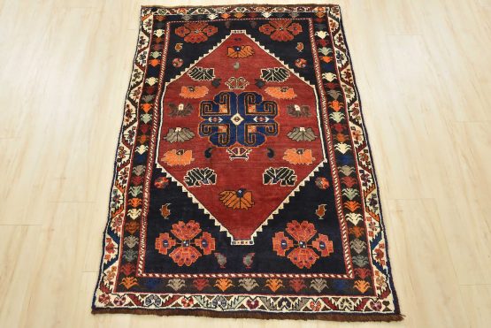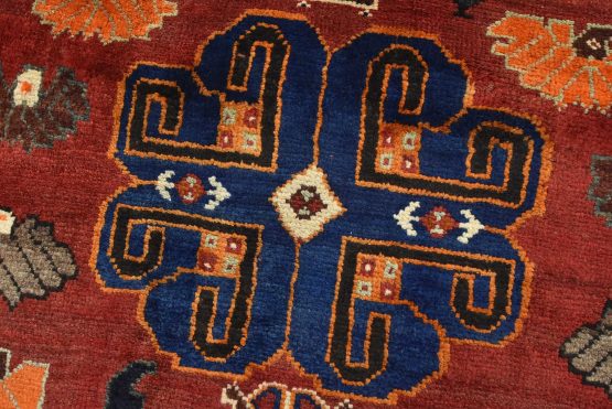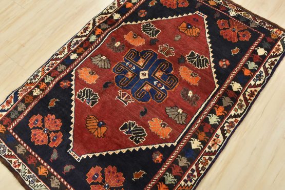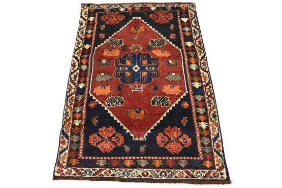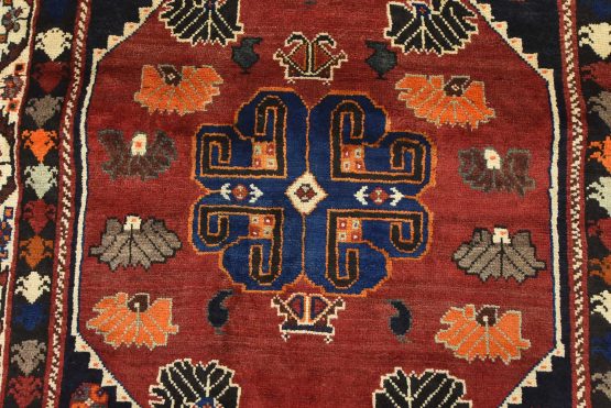 An authentic vintage tribal Qashqai rug hand-knotted with fine wool and natural dyes. This nomadic oriental rug features a central medallion surrounded by geometric motifs set against a red background. It has a full wool pile with no worn areas and is in very good condition.