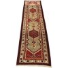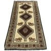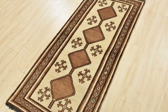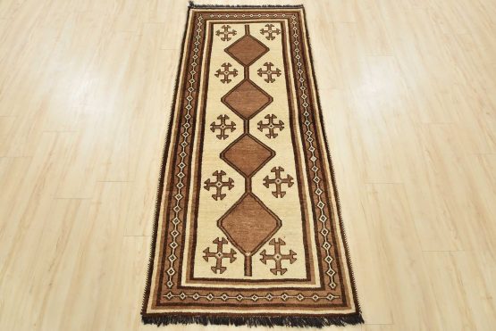 An authentic vintage tribal Qashqai runner hand-knotted with fine wool and natural dyes. This nomadic oriental rug features a row of geometric medallions surrounded by geometric motifs set against an ivory background. The wool pile does show some minor wear; please refer to the photos. Otherwise, this rug is in very good condition.