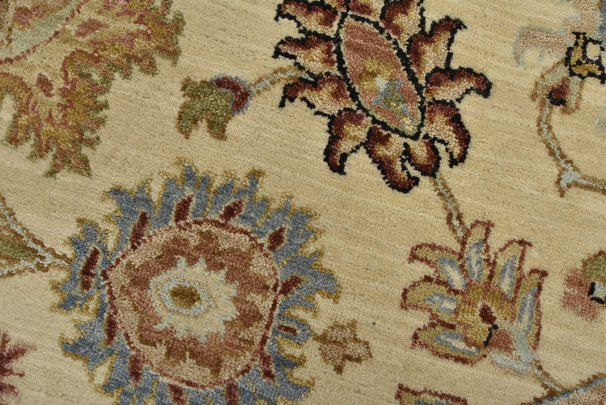 A traditional Tabriz rug hand-knotted with an all-wool pile on a cotton foundation. This oriental rug features an all-over floral design set against a beige background. It is new and in excellent condition.