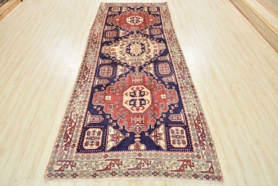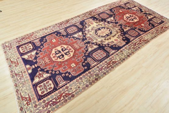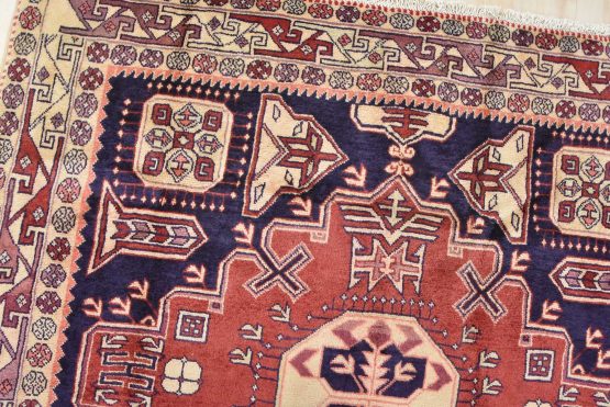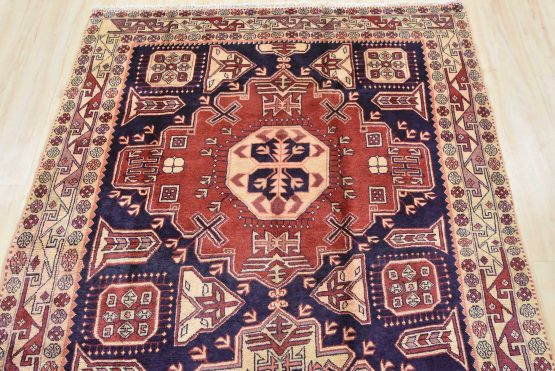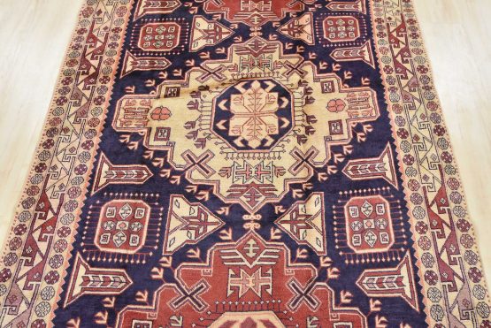 An authentic vintage tribal Sarab rug hand-knotted with fine wool and natural dyes. This rug features three large geometric medallions, set against a blue background, with other geometric shapes surrounding them. The wool pile shows some minor wear; see photos. Otherwise, this rug is in very good condition.