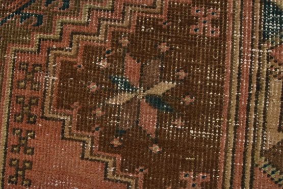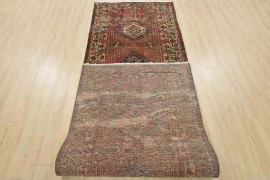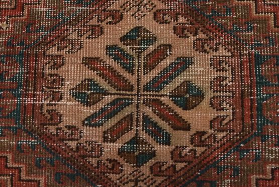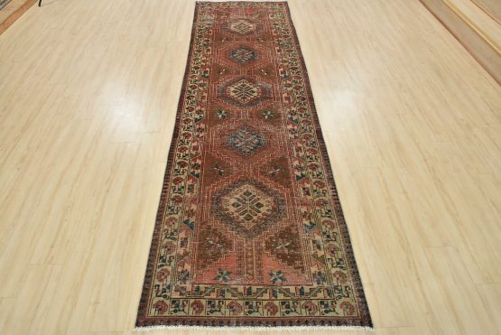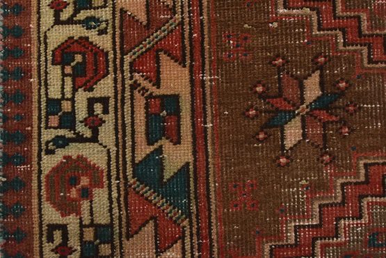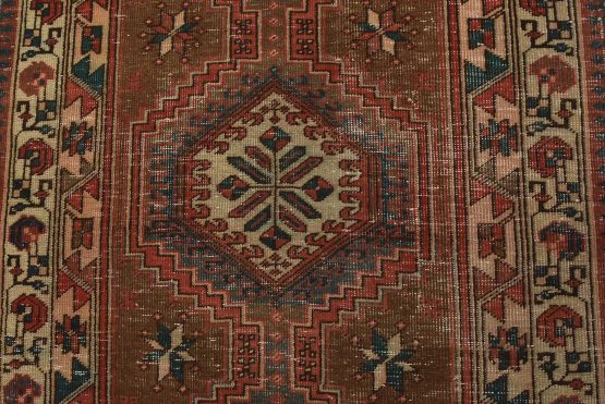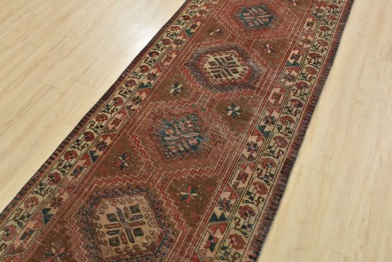 An authentic vintage tribal Sarab runner hand-knotted with fine wool and natural dyes. This rug features a row of geometric medallions set against a brown background. It has a low wool pile, is worn and distressed, and has minor imperfections (see photos). However, it is in very good condition.