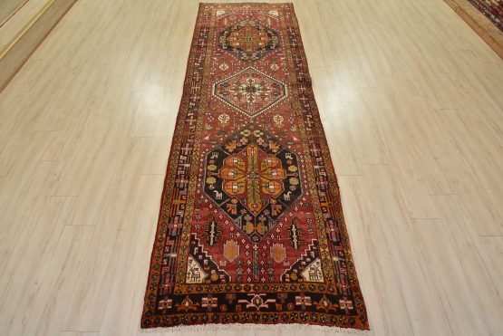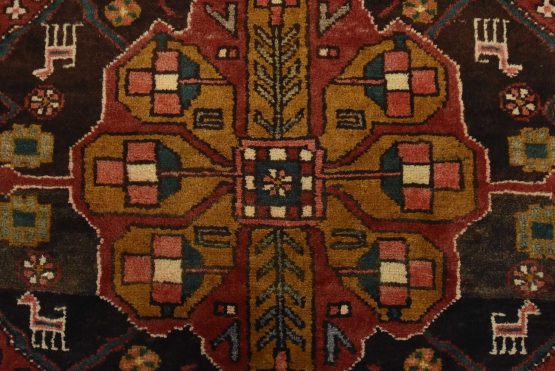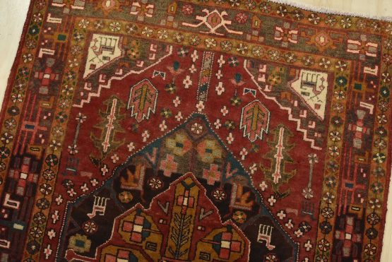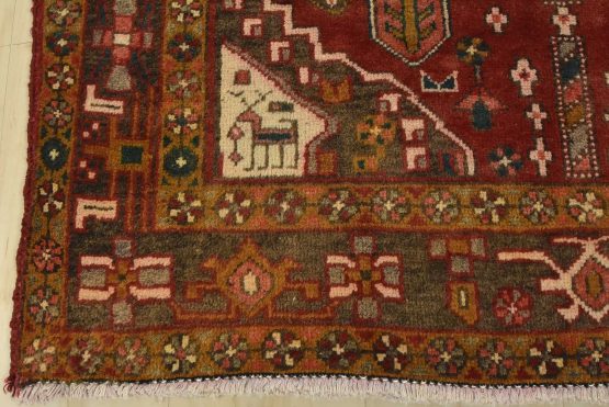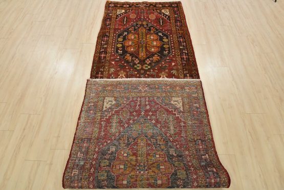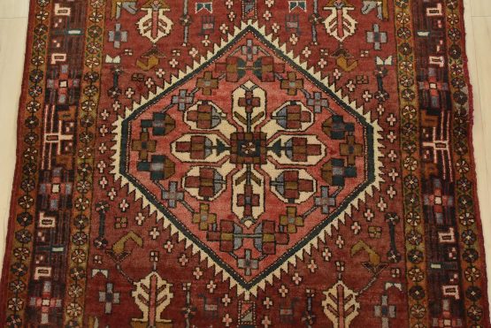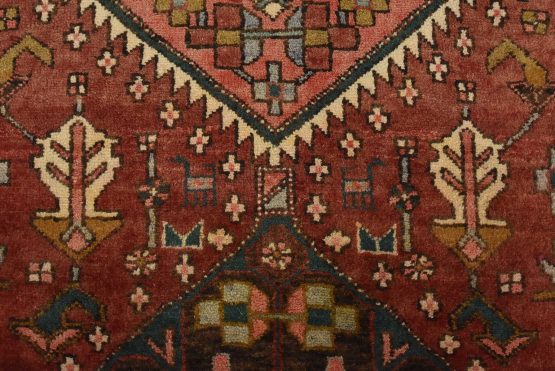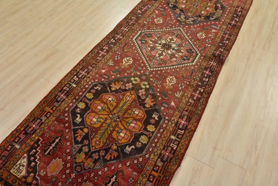 An authentic semi-antique tribal Sarab runner hand-knotted with fine wool and natural dyes. This nomadic oriental rug features geometric medallions surrounded by geometric motifs and animal figures set against a red background. The wool pile shows some minor wear; please refer to the photos. Otherwise, the rug is in very good condition.