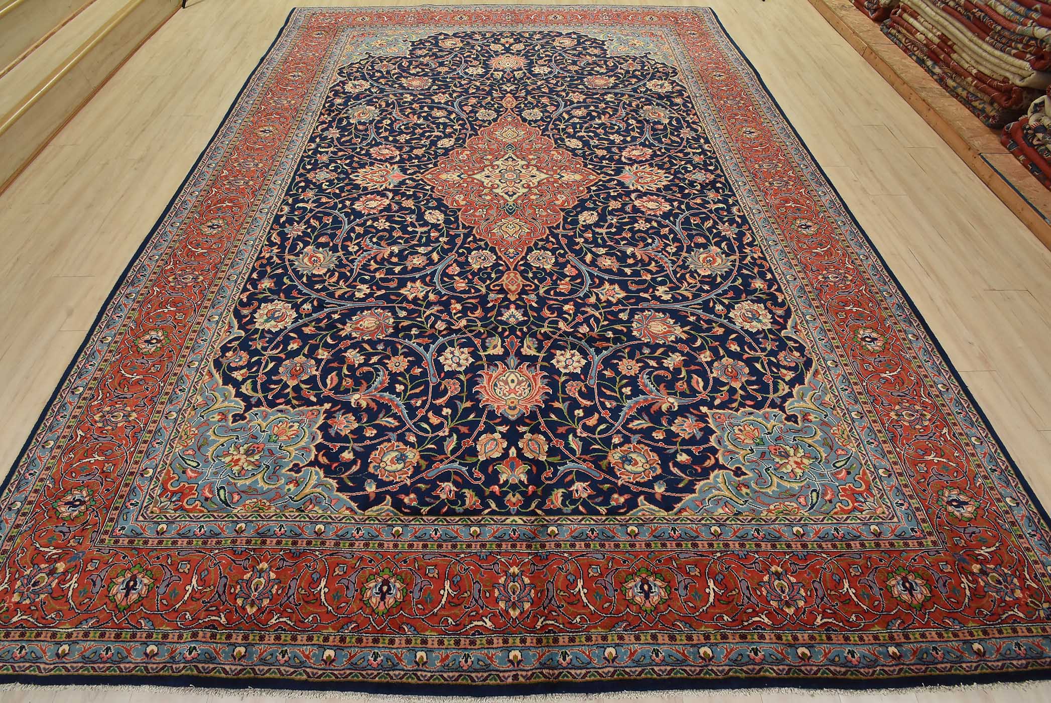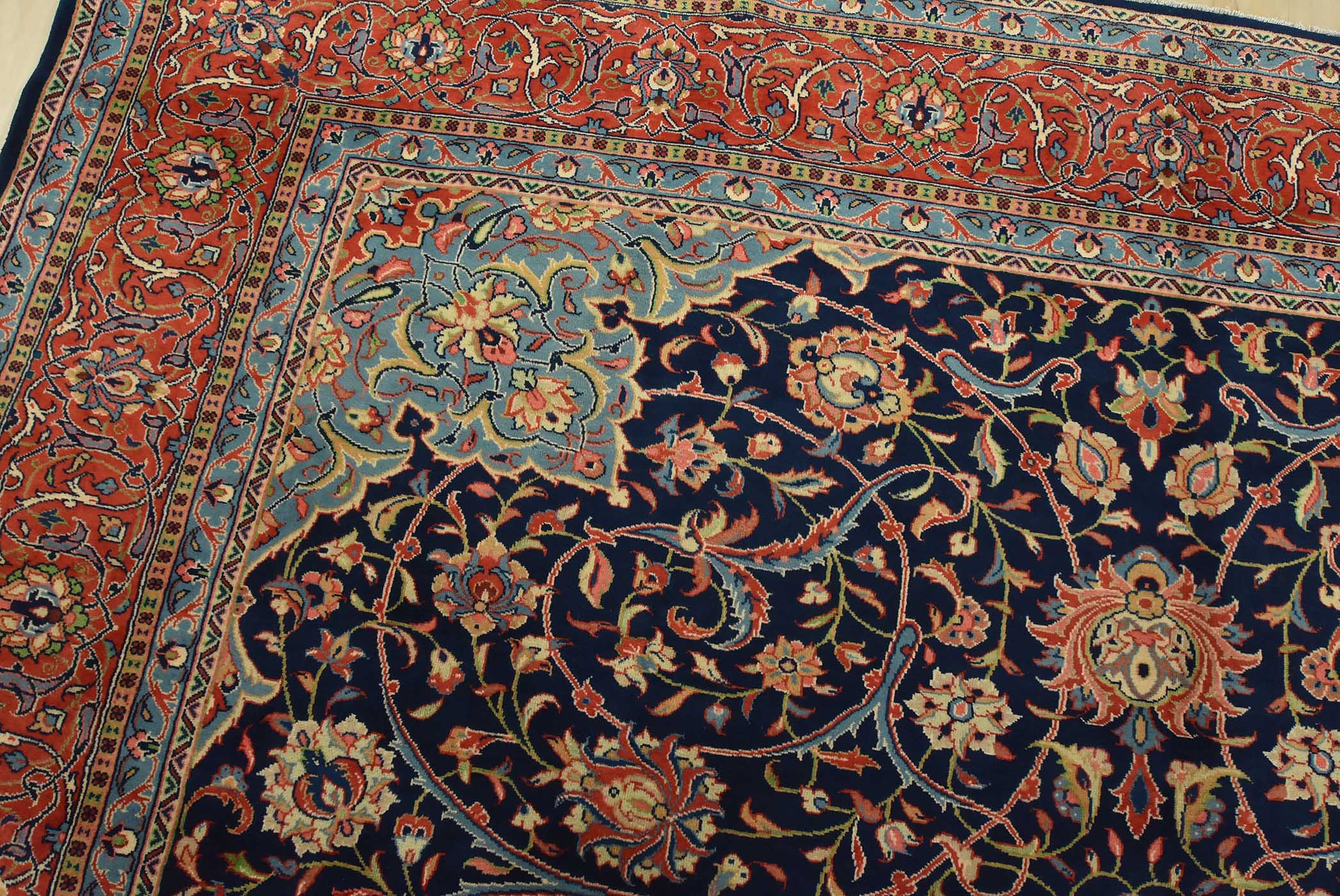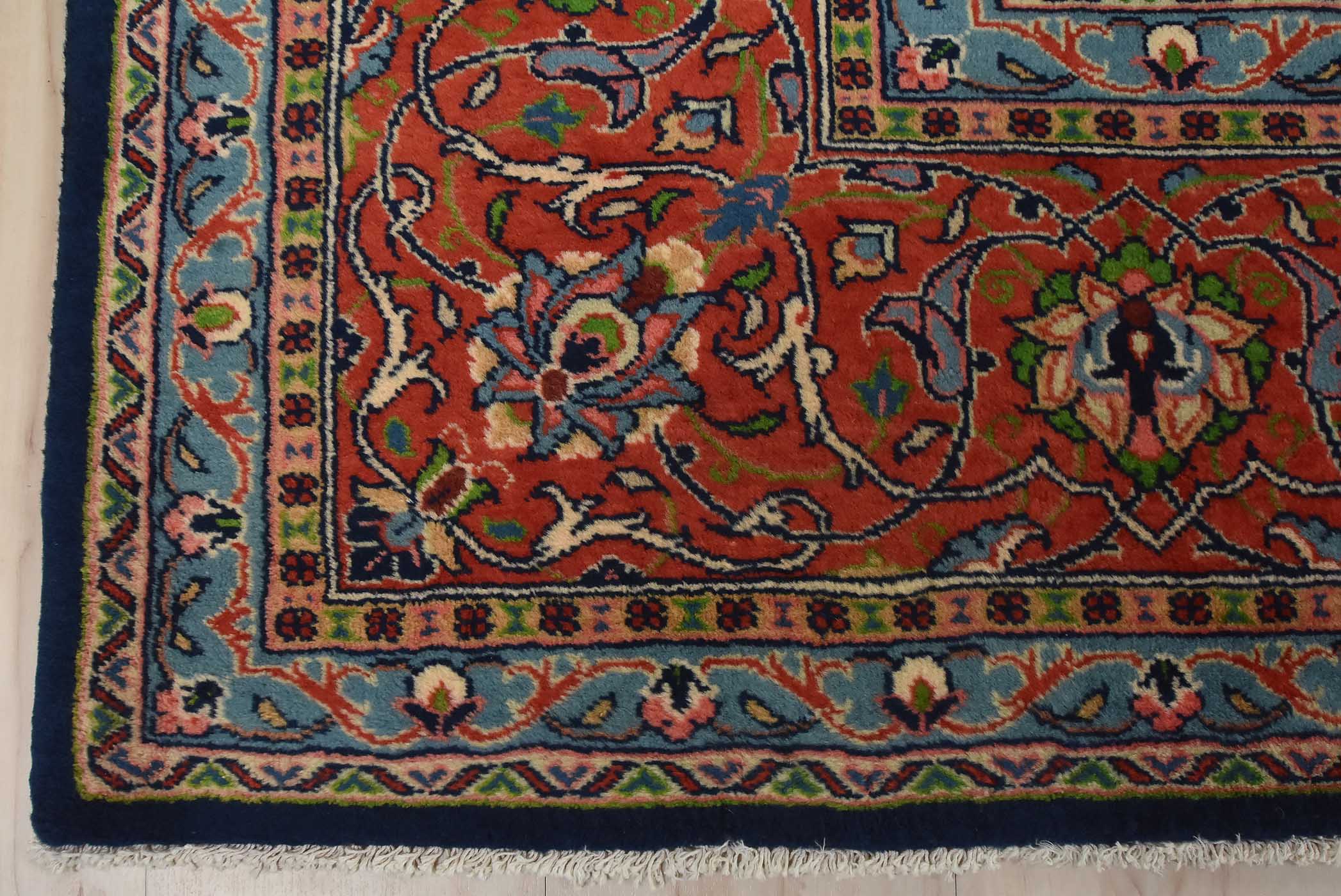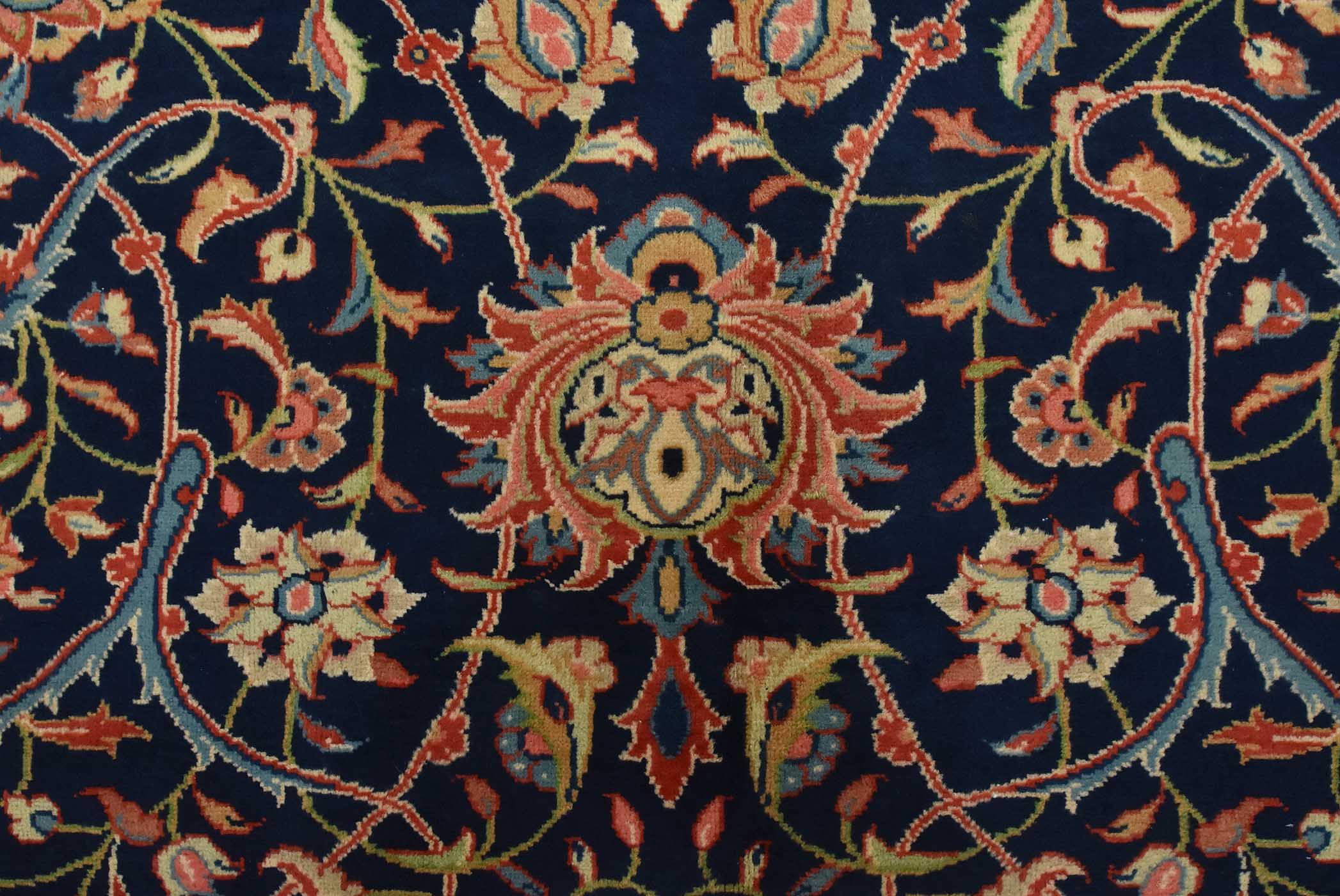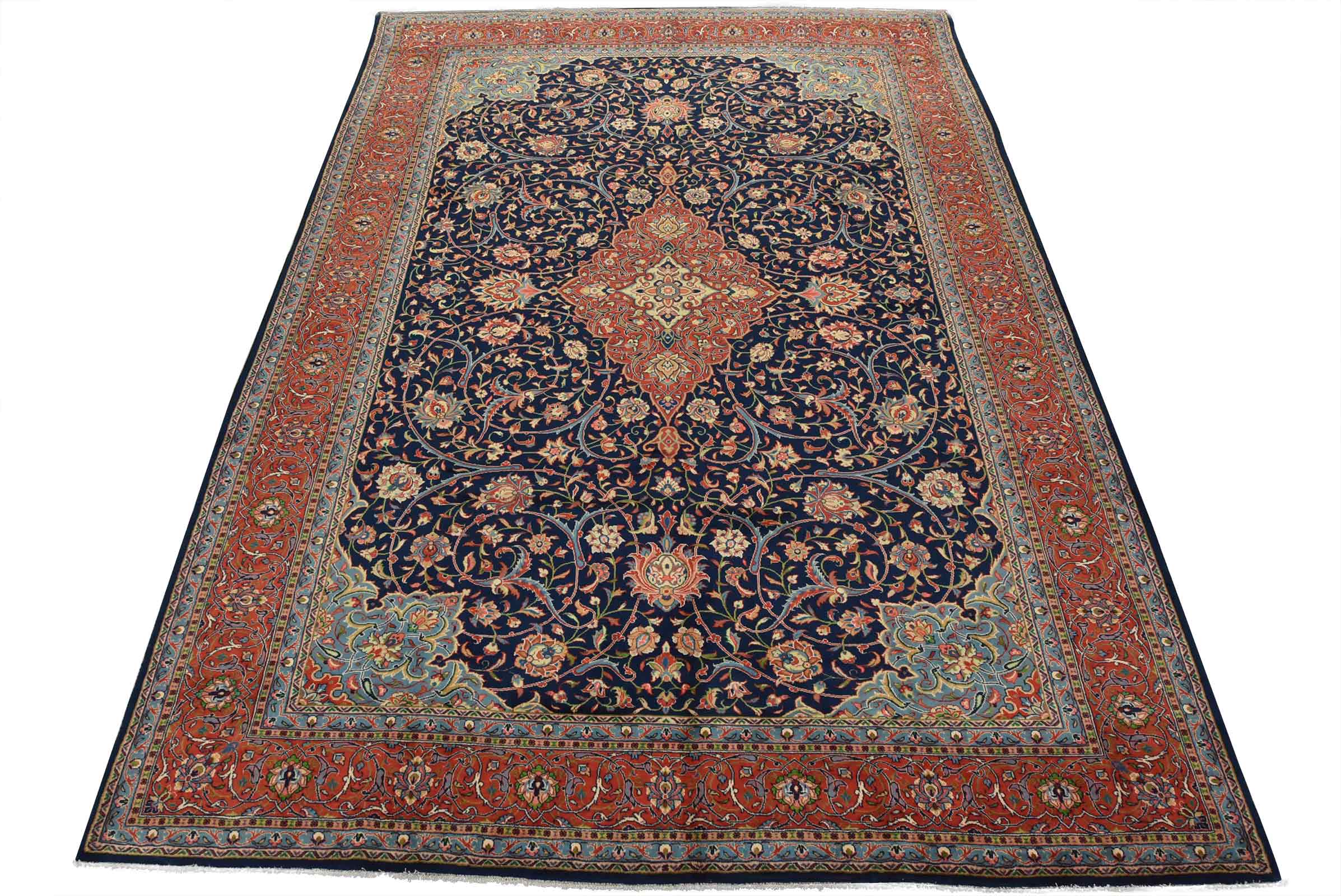 An authentic vintage traditional Sarouk rug hand-knotted with fine wool and natural dyes. This beautiful rug features a central medallion surrounded by a botanical design with flowers set against a blue background. It has a full wool pile with no worn areas and is in very good condition.