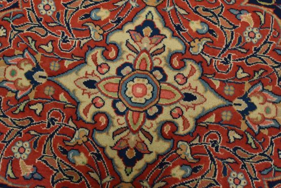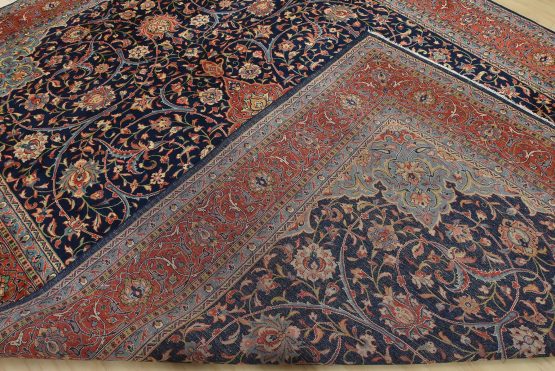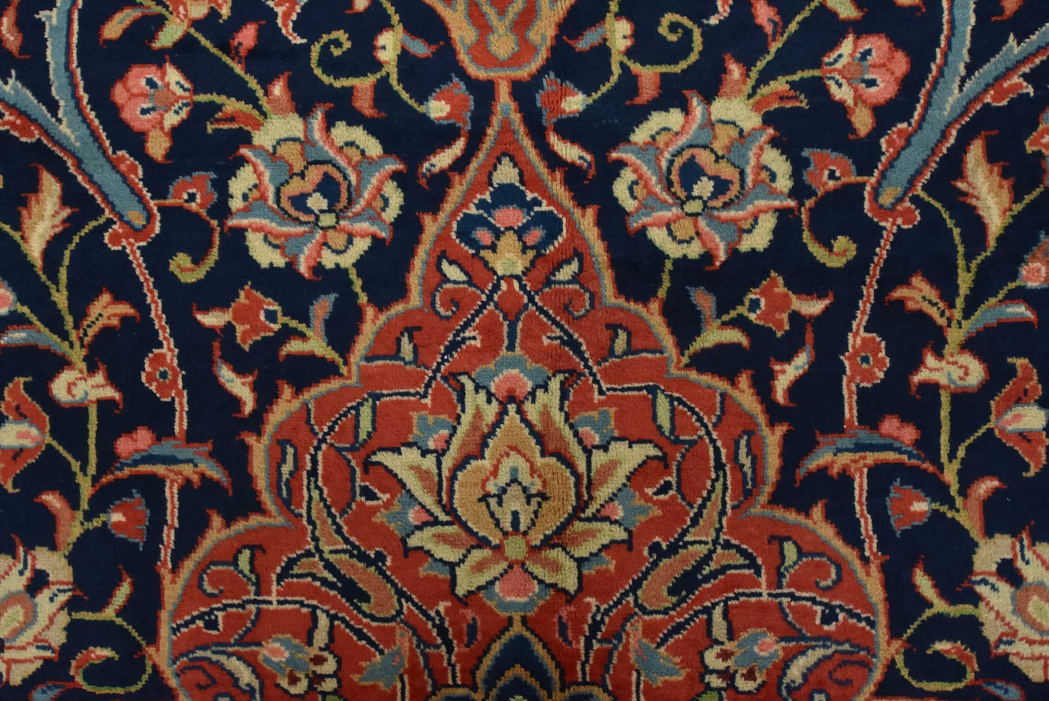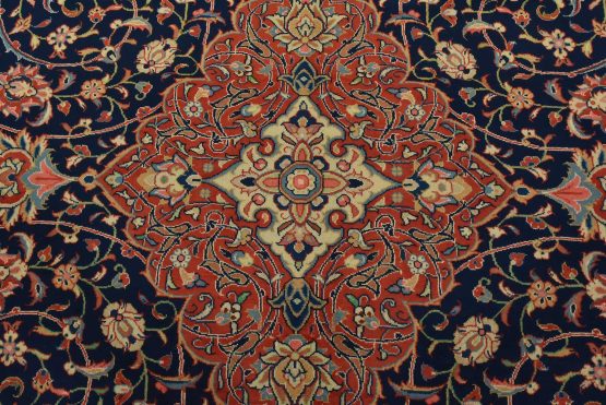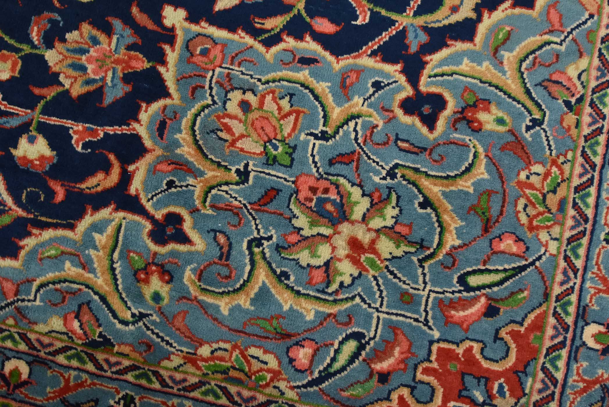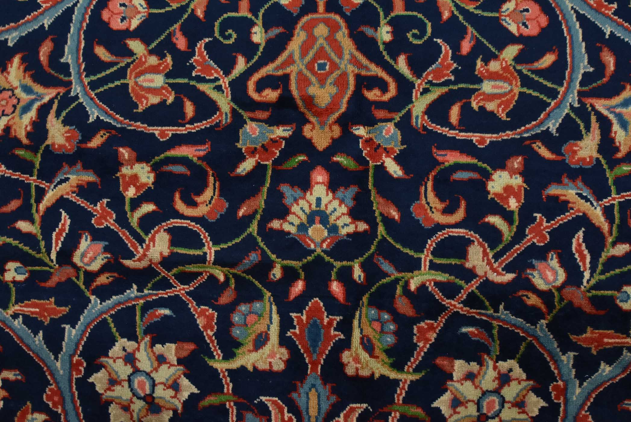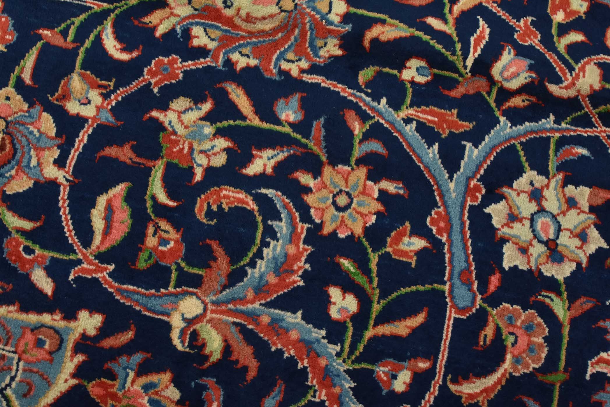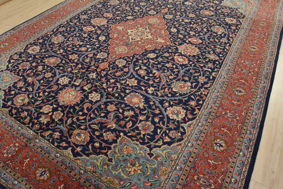An authentic vintage traditional Sarouk rug hand-knotted with fine wool and natural dyes. This beautiful rug features a central medallion surrounded by a botanical design with flowers set against a blue background. It has a full wool pile with no worn areas and is in very good condition.