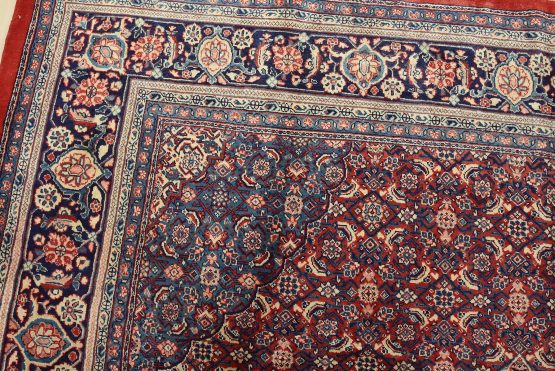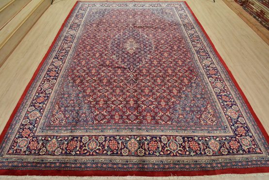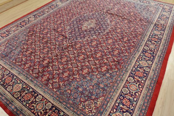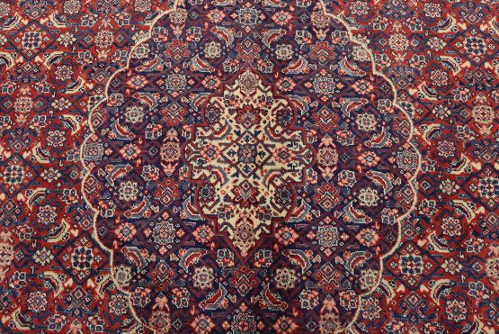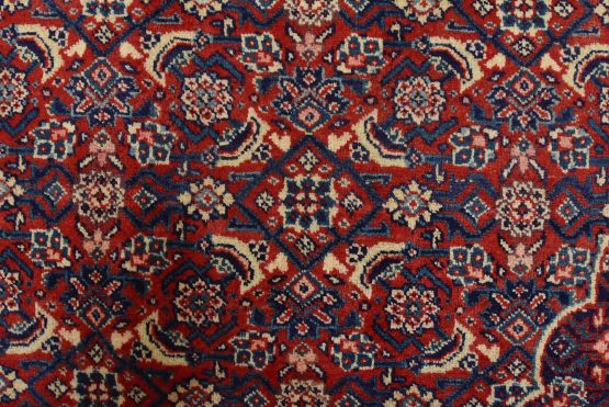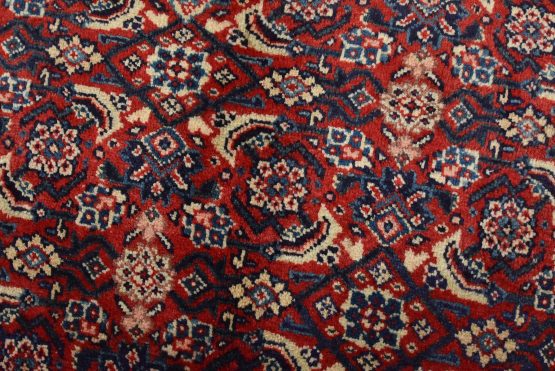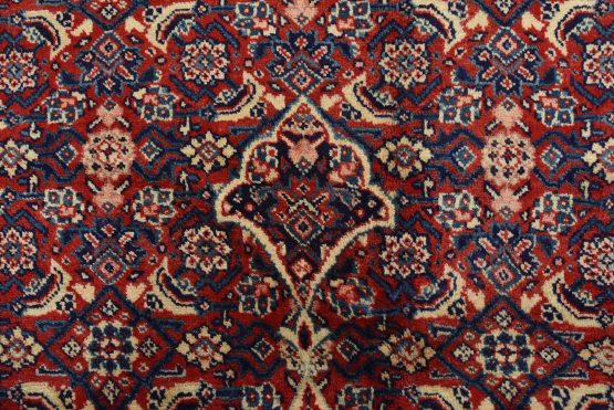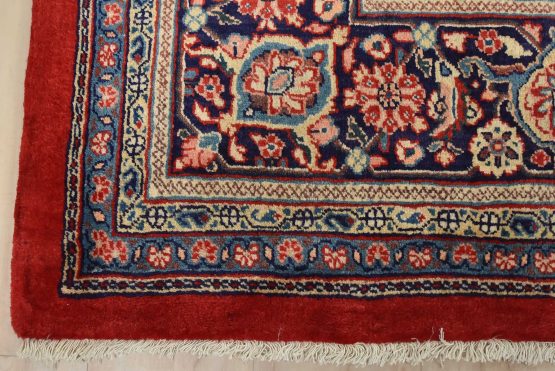 An authentic vintage traditional Sarouk rug hand-knotted with fine wool and natural dyes. This oriental rug features an oval-shaped central medallion surrounded by an intricate Herati pattern set against a red background. It has a full wool pile with no worn areas and is in very good condition.
