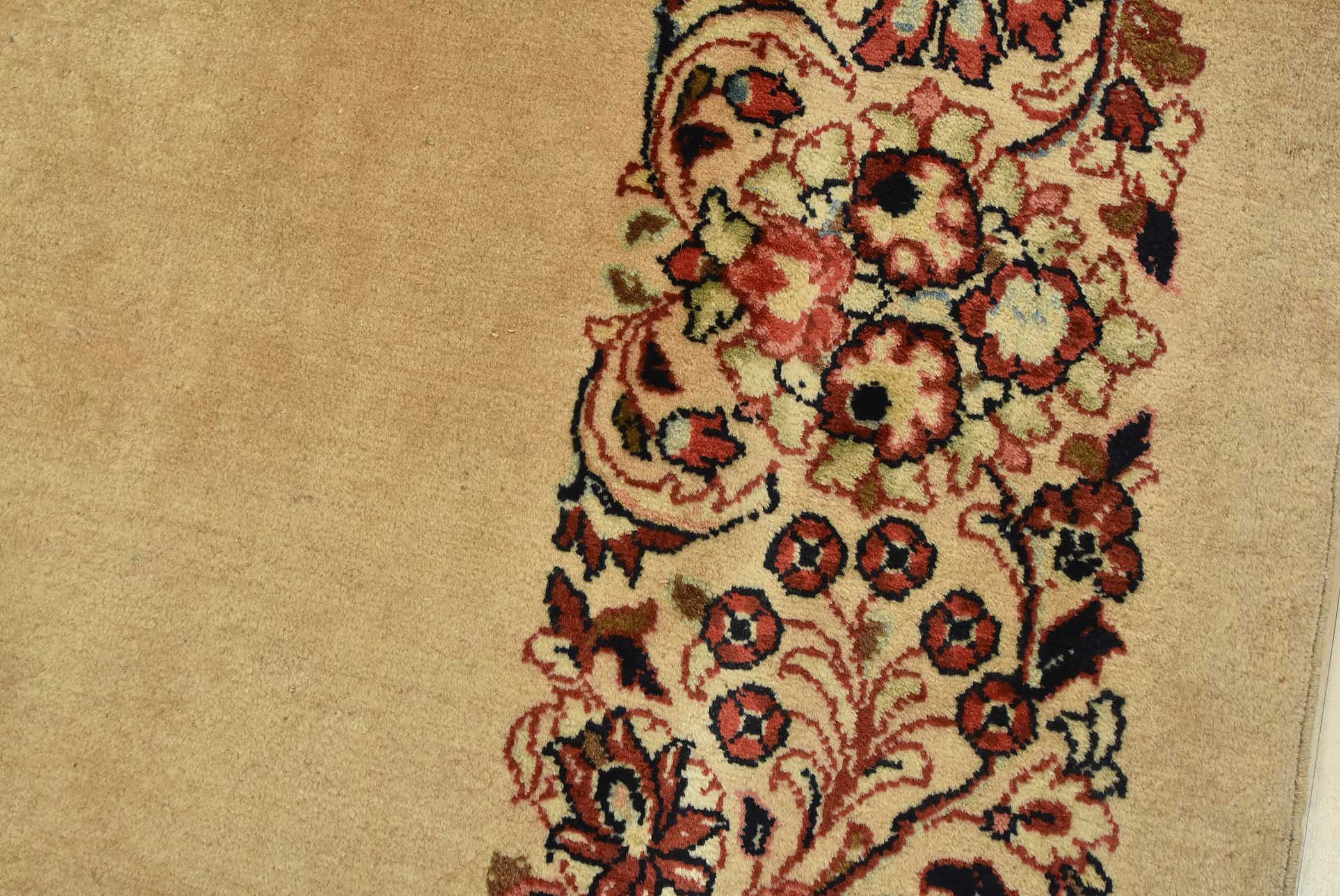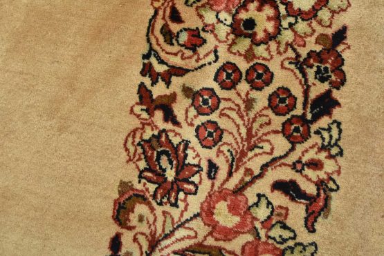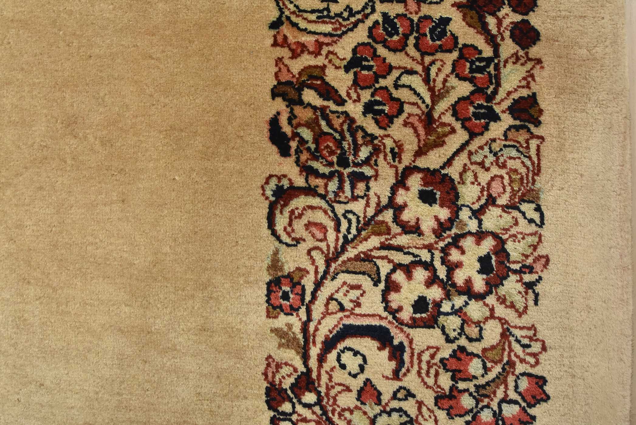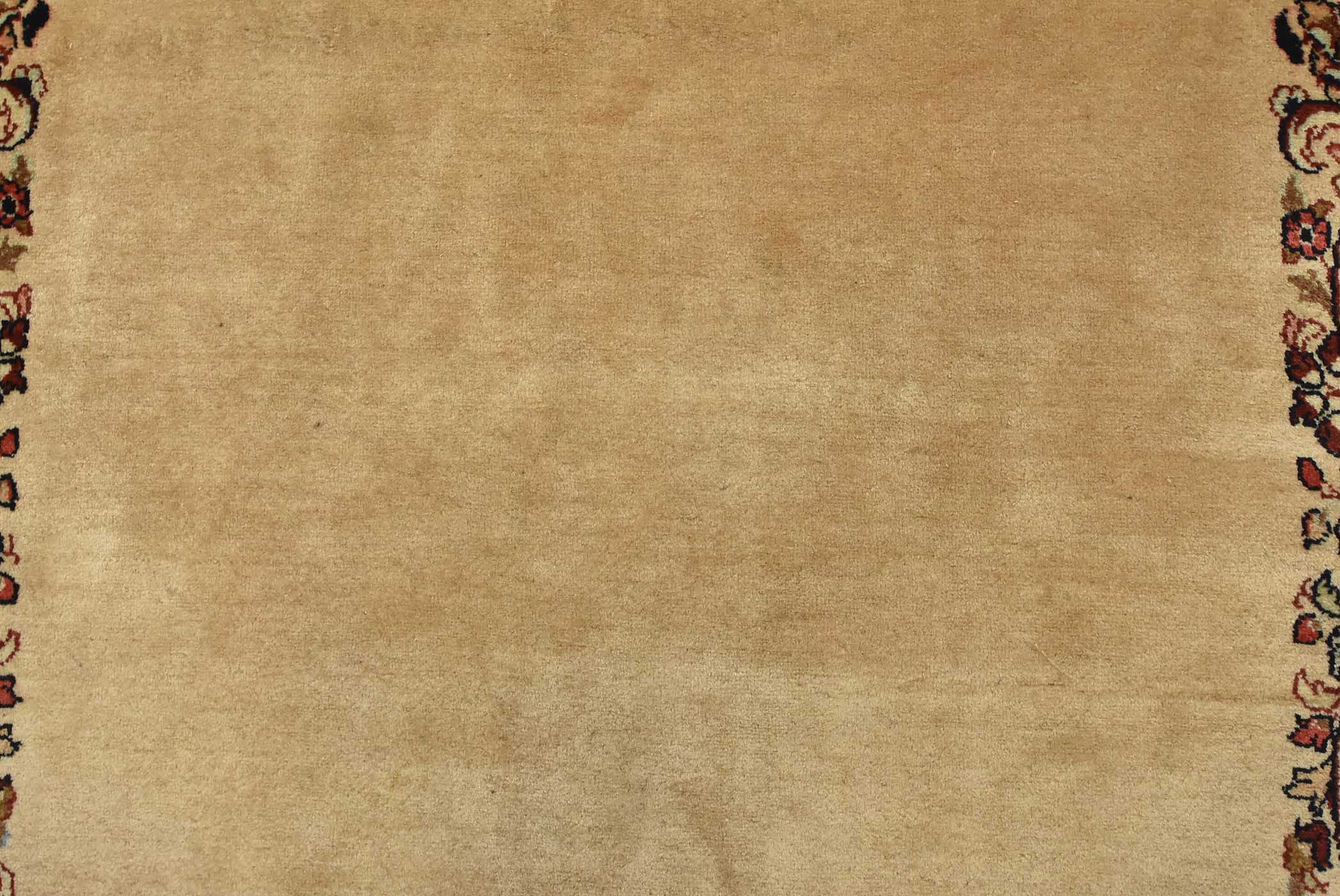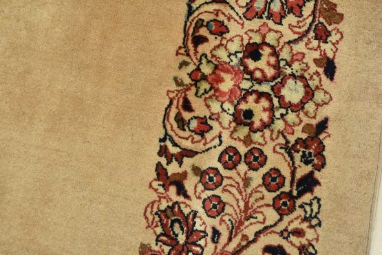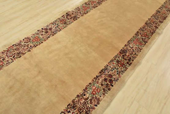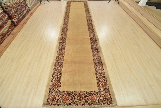 An authentic vintage traditional Sarouk runner hand-knotted with fine wool and natural dyes. This intricately woven rug features a solid beige background adorned with a floral border design. It has a full wool pile with no worn areas and is in very good condition.