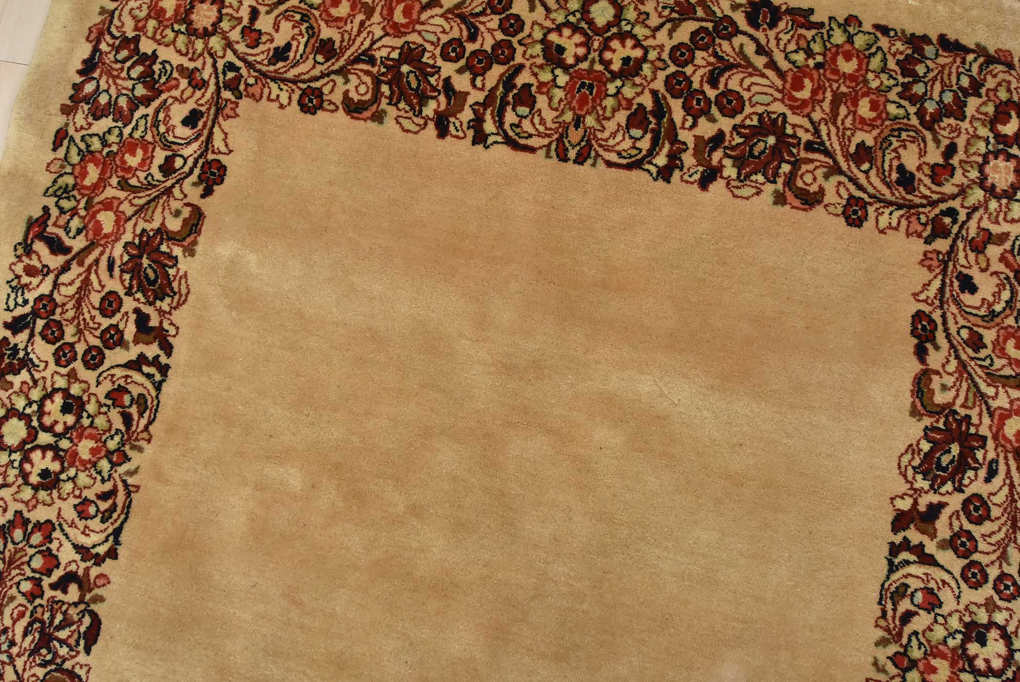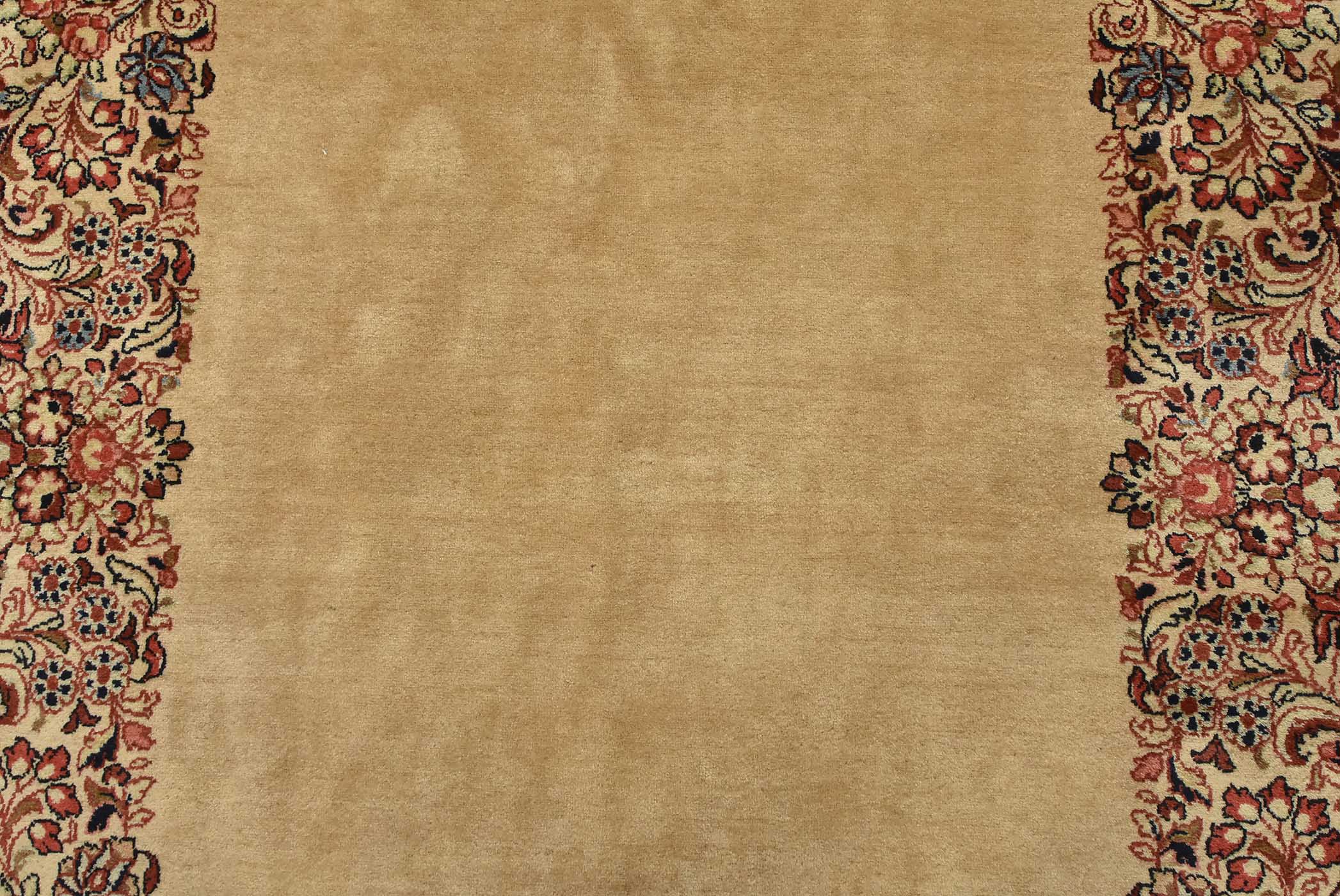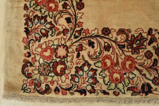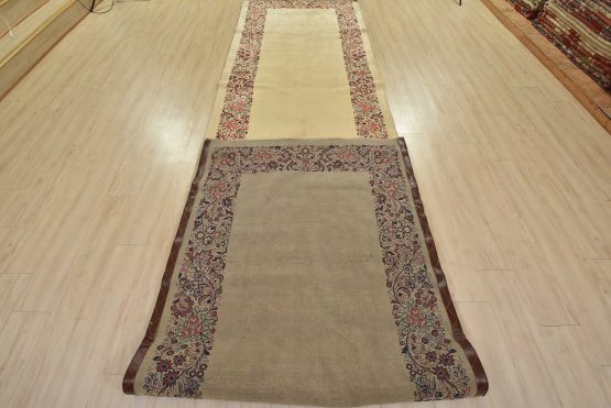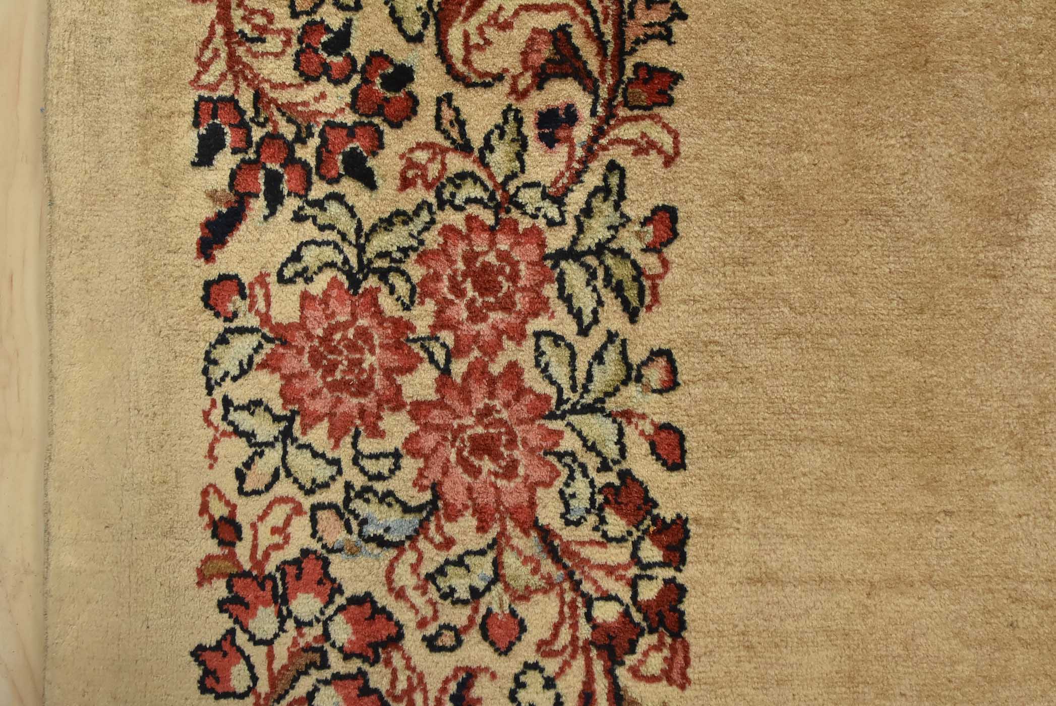 An authentic vintage traditional Sarouk runner hand-knotted with fine wool and natural dyes. This intricately woven rug features a solid beige background adorned with a floral border design. It has a full wool pile with no worn areas and is in very good condition.
