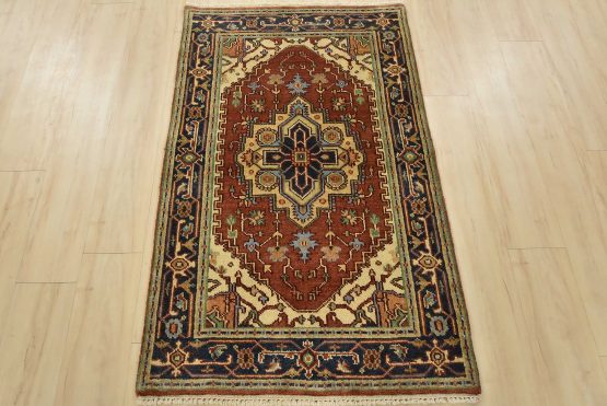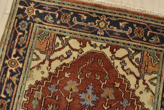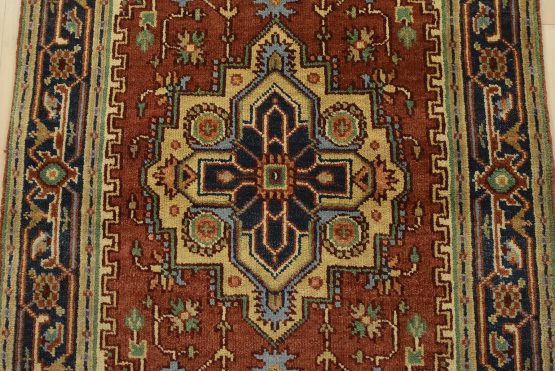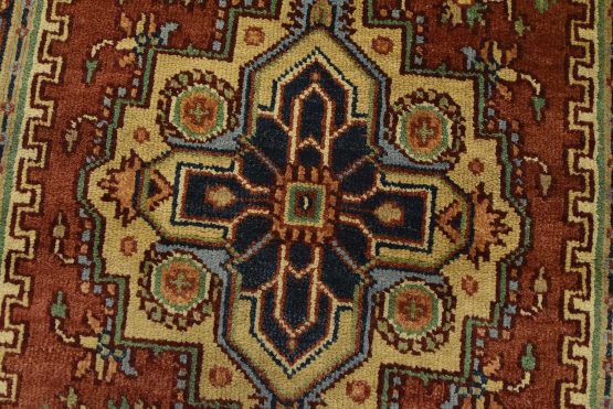 A traditional tribal Heriz rug hand-knotted with an all-wool pile on a cotton foundation. This oriental rug features a central geometric medallion surrounded by a botanical design set against a rust-red background. It is new and in excellent condition.