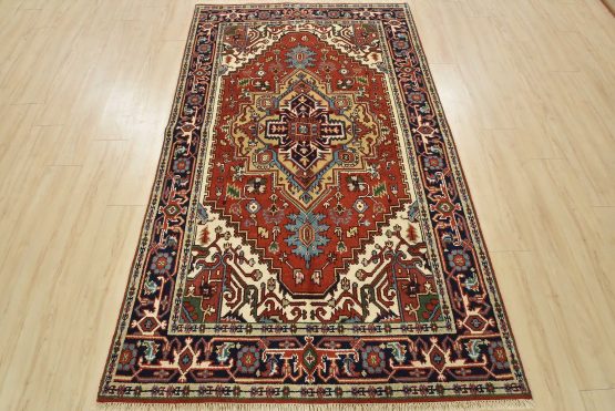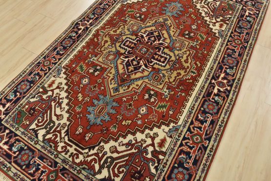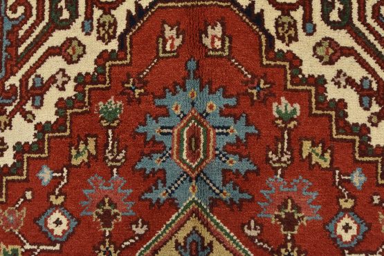 A traditional tribal Heriz rug hand-knotted with an all-wool pile on a cotton foundation. This oriental rug features a central geometric medallion surrounded by a botanical design set against a red background. It is new and in excellent condition.