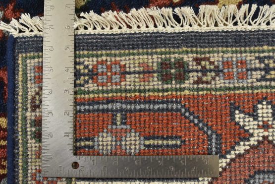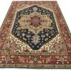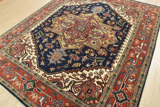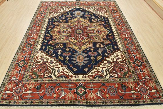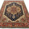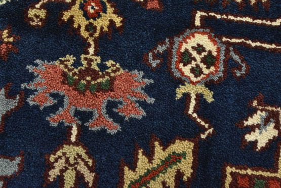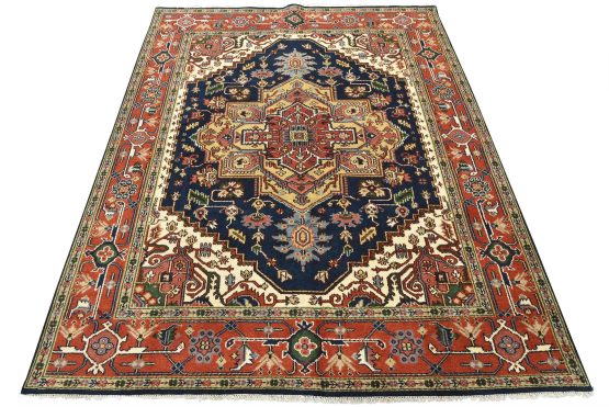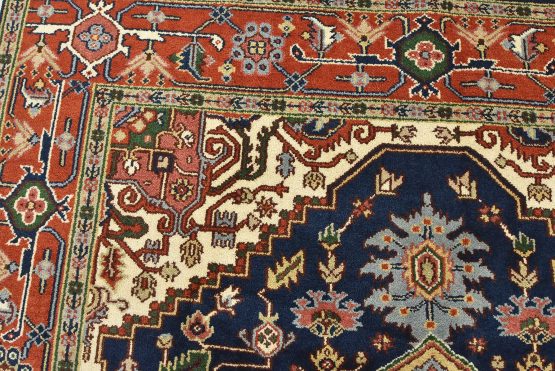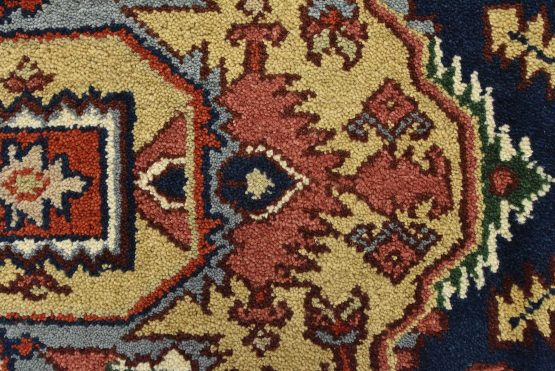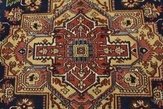 A traditional tribal Heriz rug hand-knotted with an all-wool pile on a cotton foundation. This oriental rug features a large central medallion surrounded by geometric botanical designs set against a dark blue background. It is new and in excellent condition.