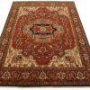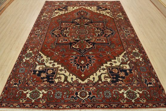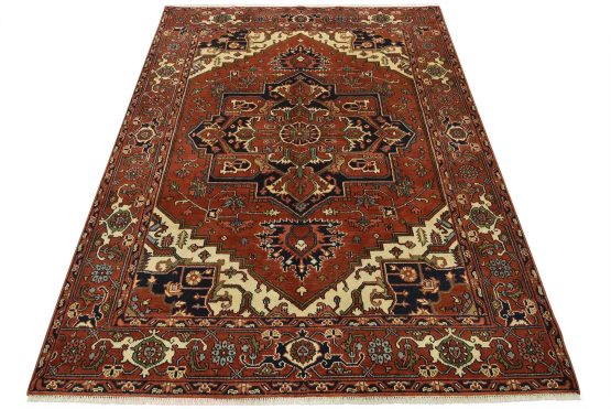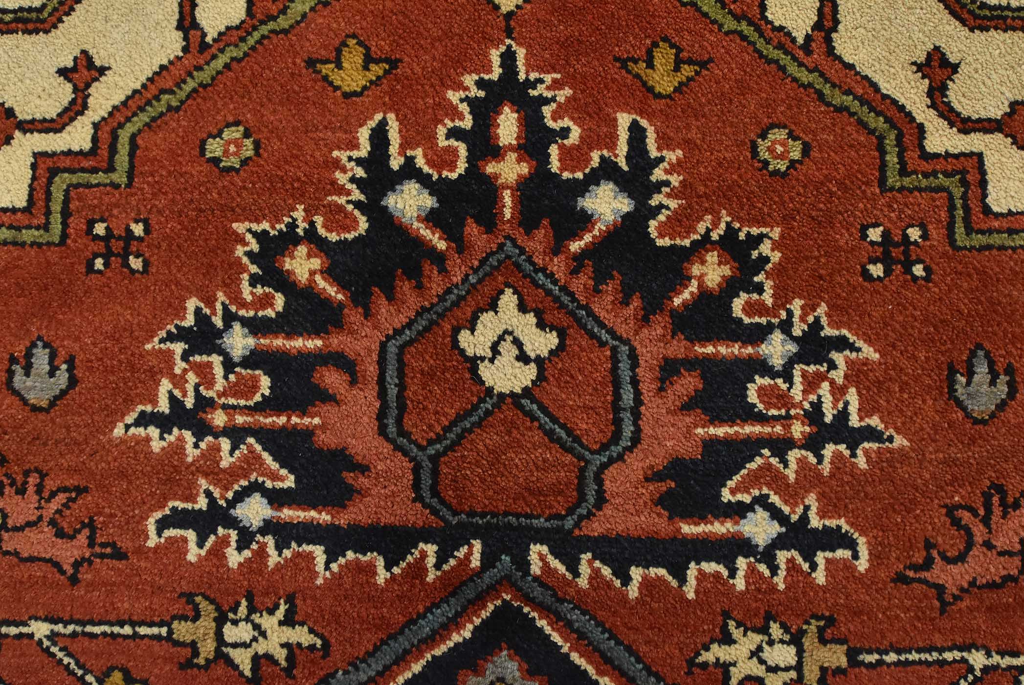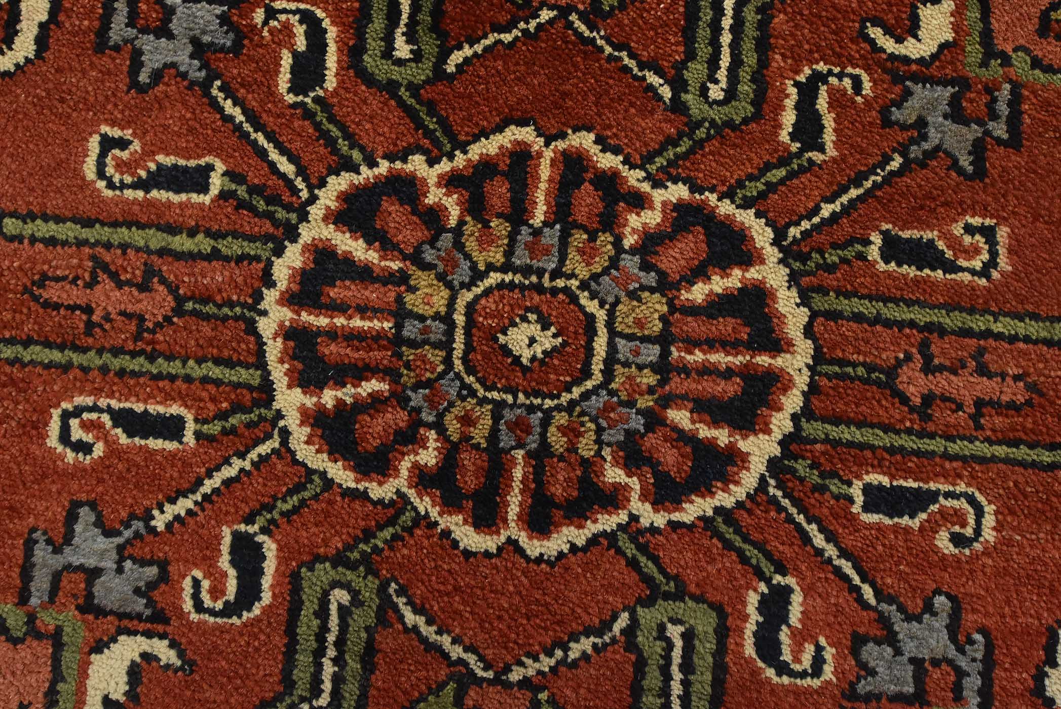 A traditional tribal Heriz rug hand-knotted with an all-wool pile on a cotton foundation. This oriental rug features a central geometric medallion surrounded by a botanical design set against a rust-colored background. It is new and in excellent condition.
