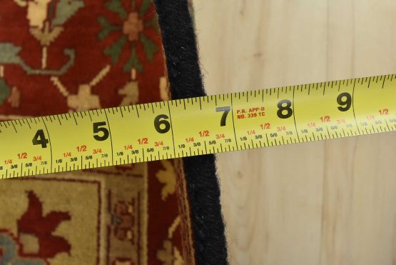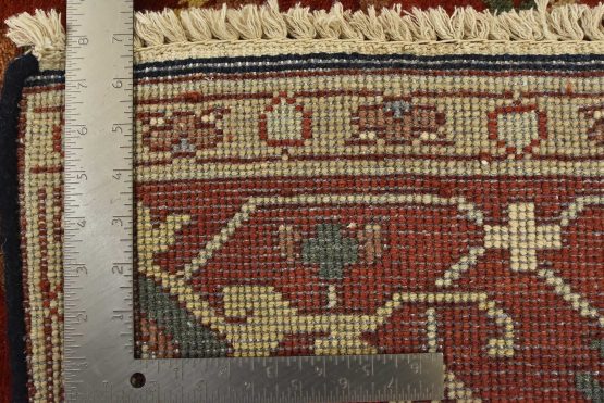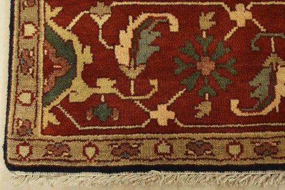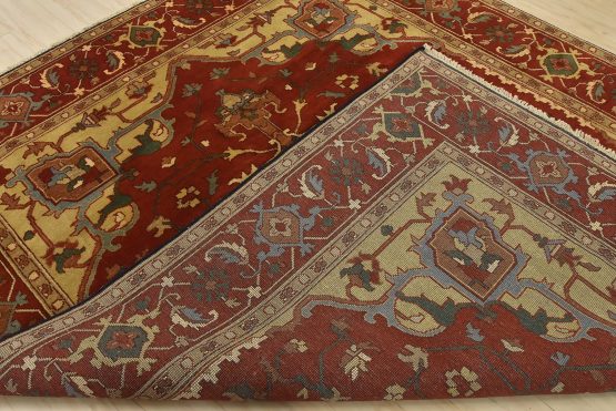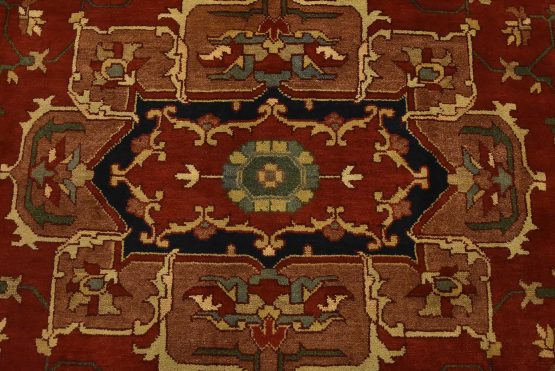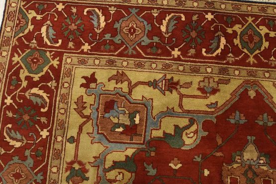A traditional Heriz rug hand-knotted with an all-wool pile on a cotton foundation. This oriental rug features a central medallion surrounded by a botanical design set against a red background. It is new and in excellent condition.