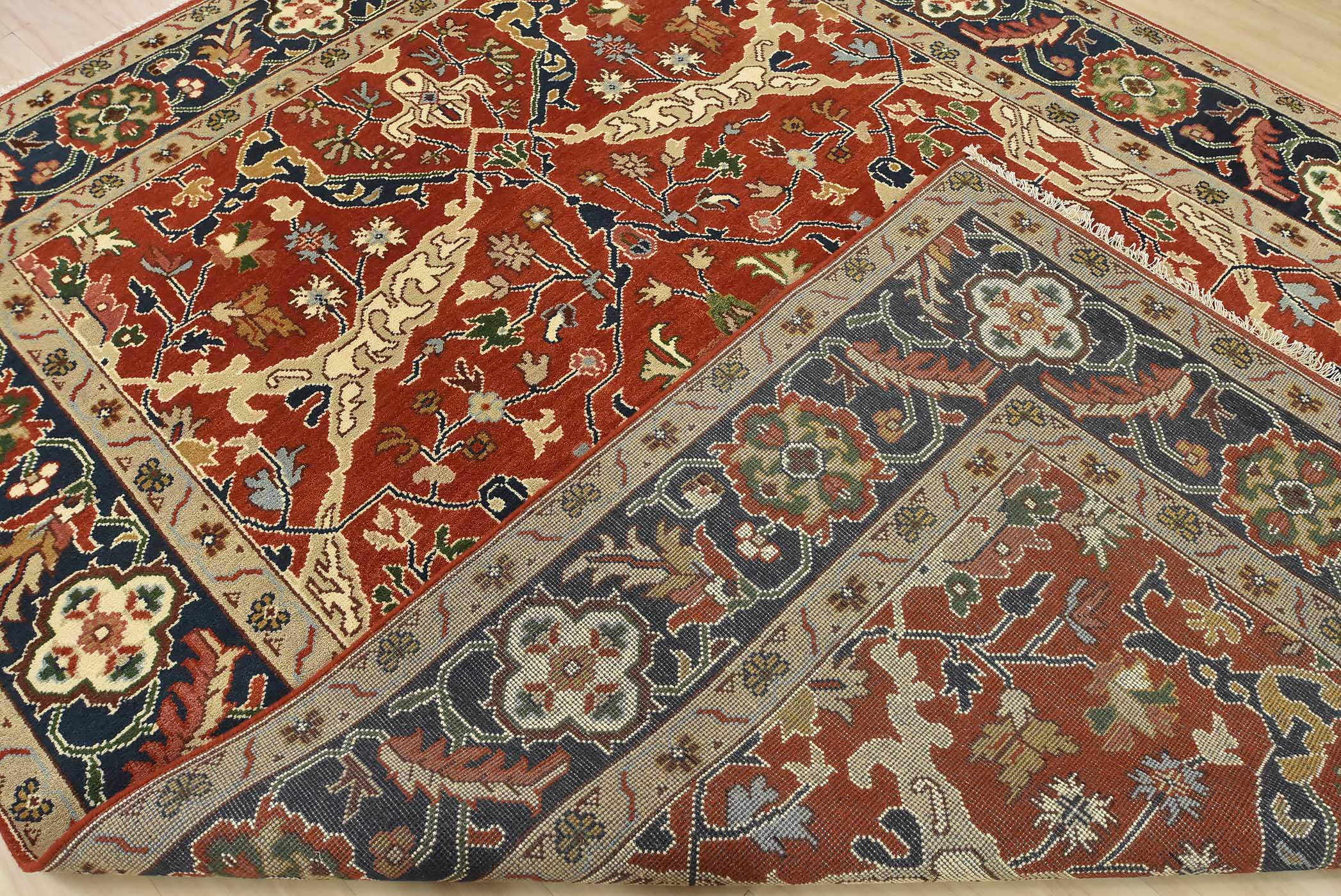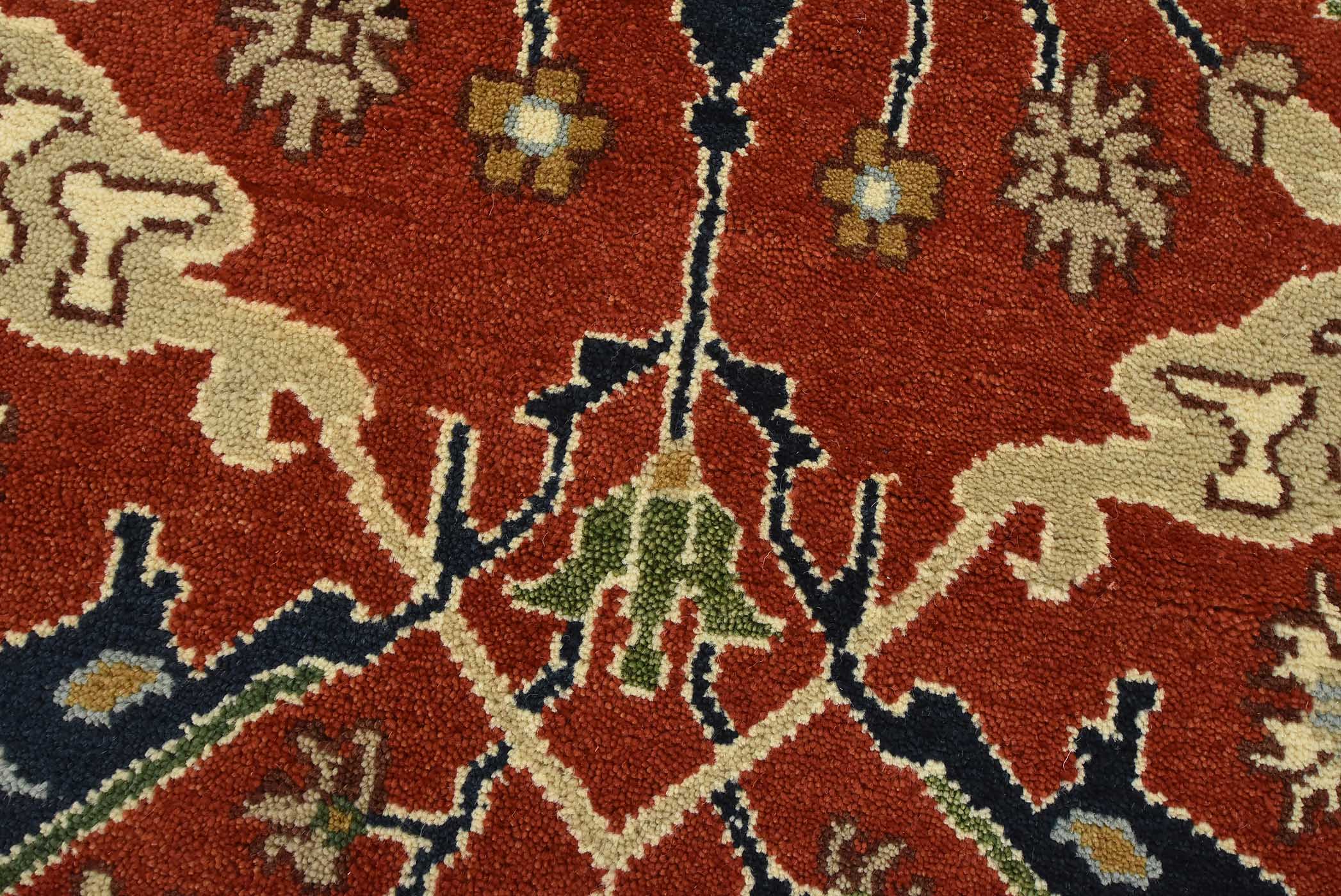 A traditional Heriz rug hand-knotted with an all-wool pile on a cotton foundation. This oriental rug features a central medallion surrounded by botanical designs set against a red background. It is new and in excellent condition.