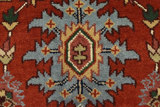 A traditional tribal Heriz rug hand-knotted with an all-wool pile on a cotton foundation. This oriental rug features a large central medallion surrounded by a geometric botanical design set against a red background. It is new and in excellent condition.