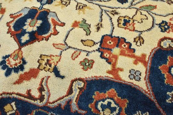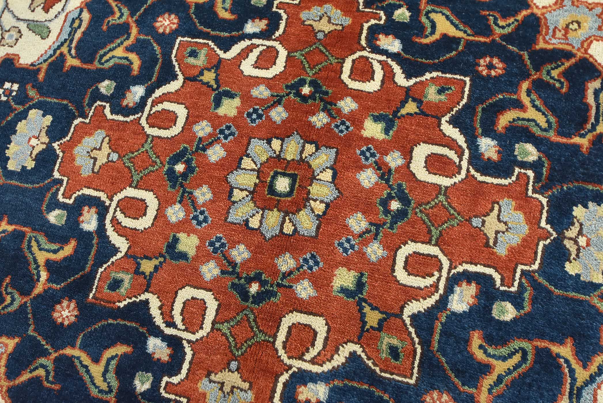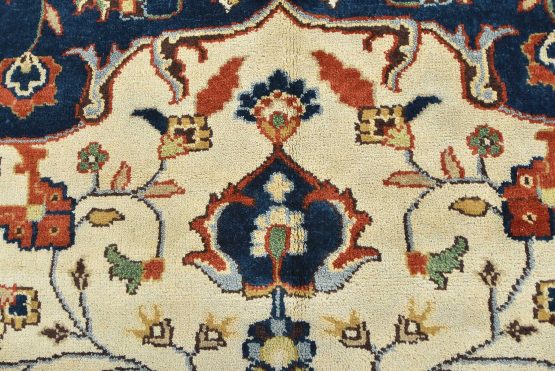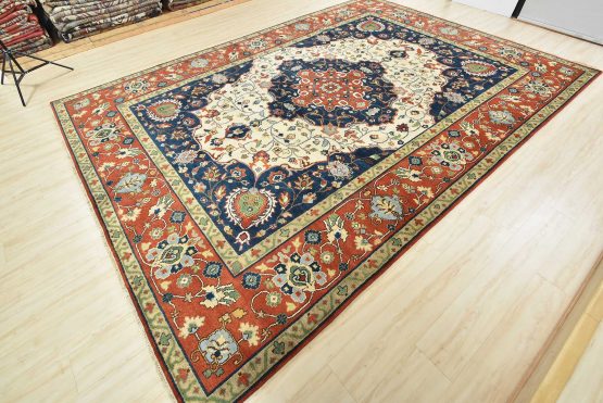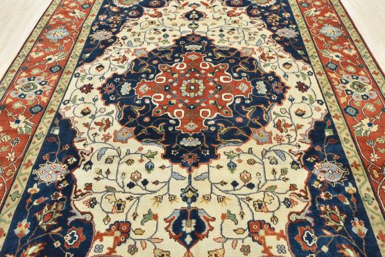 A traditional Heriz rug hand-knotted with an all-wool pile on a cotton foundation. This oriental rug features a central curvilinear medallion surrounded by a botanical design set against an ivory background. It is new and in excellent condition.
