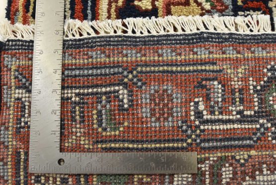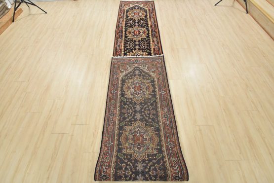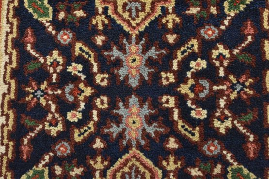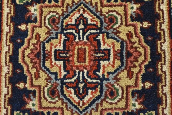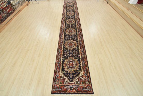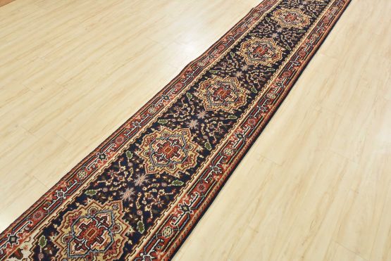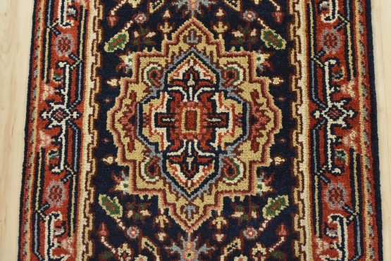 A traditional tribal Heriz runner hand-knotted with an all-wool pile on a cotton foundation. This oriental rug features a row of geometric medallions surrounded by botanical designs set against a dark blue background. It is new and in excellent condition.