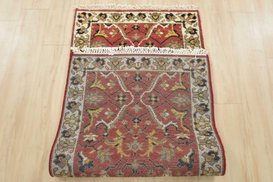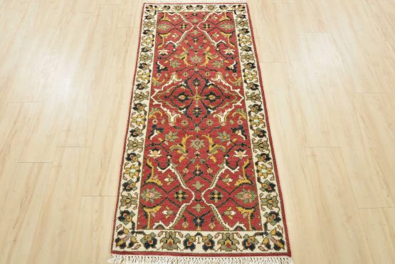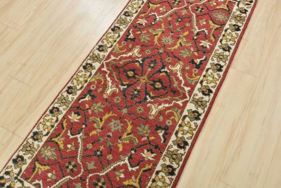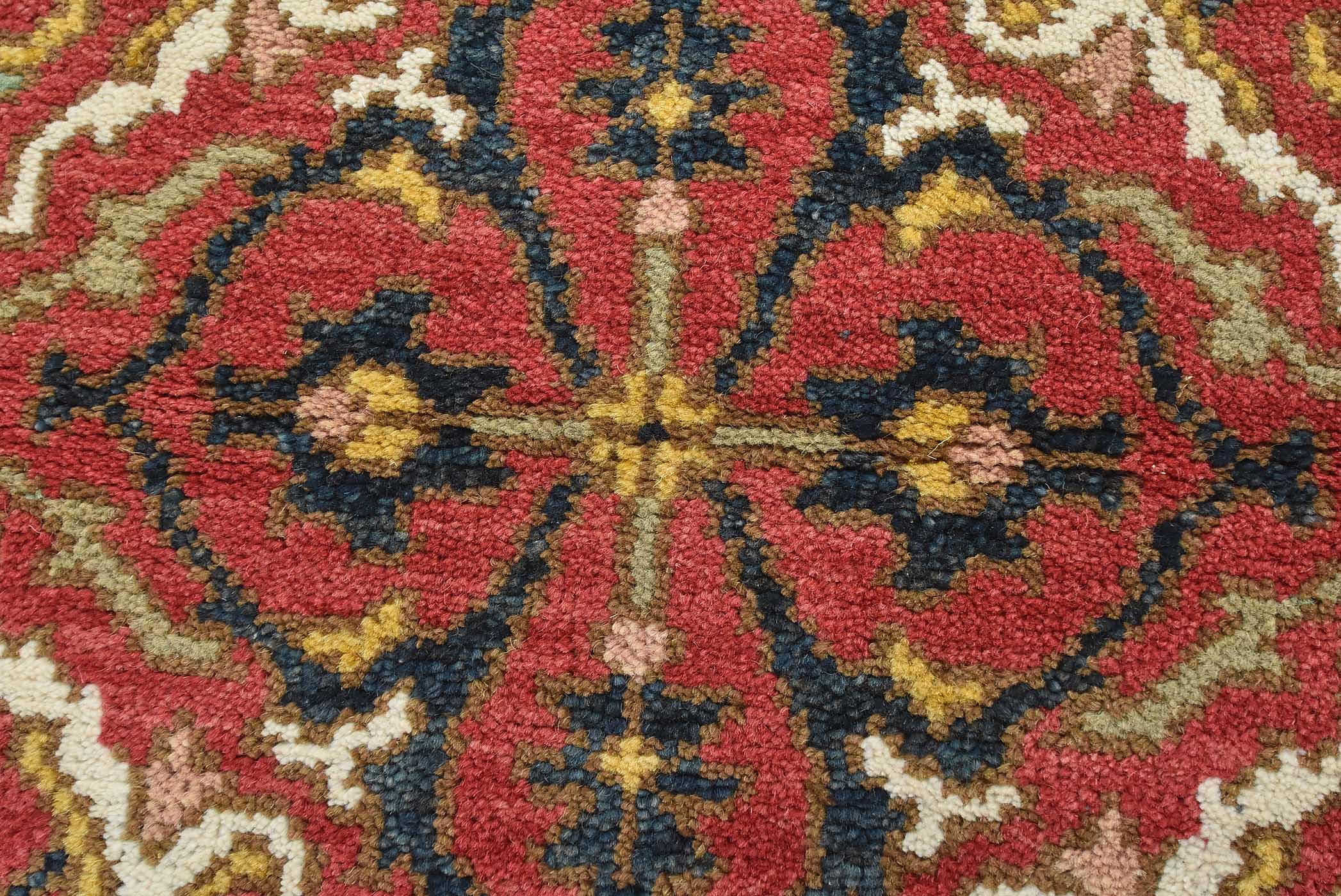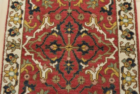 A traditional Heriz runner hand-knotted with an all-wool pile on a cotton foundation. This oriental rug features a central medallion surrounded by a botanical design set against a red background. It is new and in excellent condition.