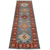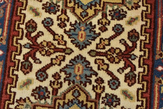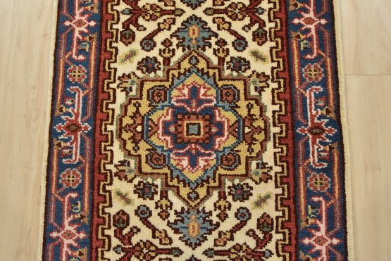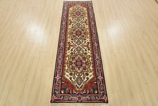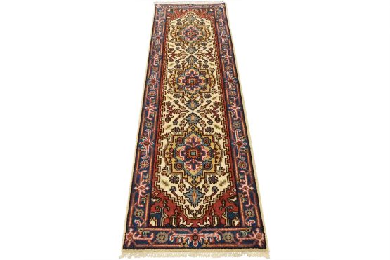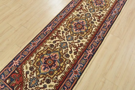 A traditional tribal Heriz runner hand-knotted with an all-wool pile on a cotton foundation. This oriental rug features a row of geometric medallions surrounded by a botanical design set against an ivory background. It is new and in excellent condition.