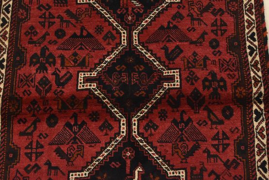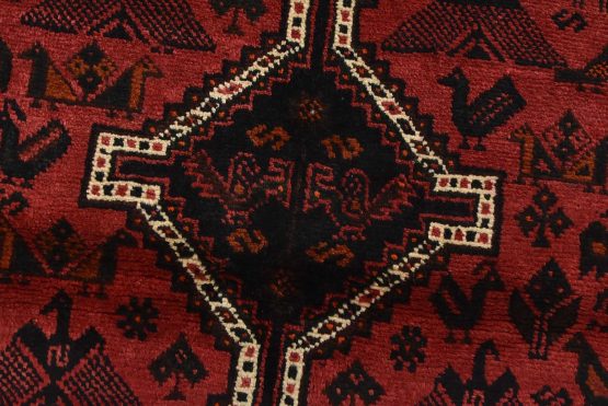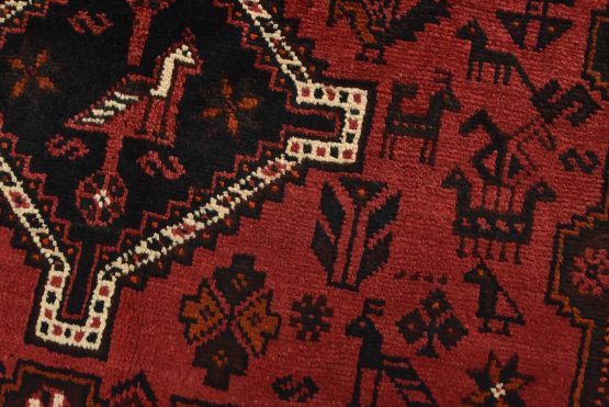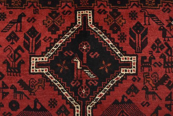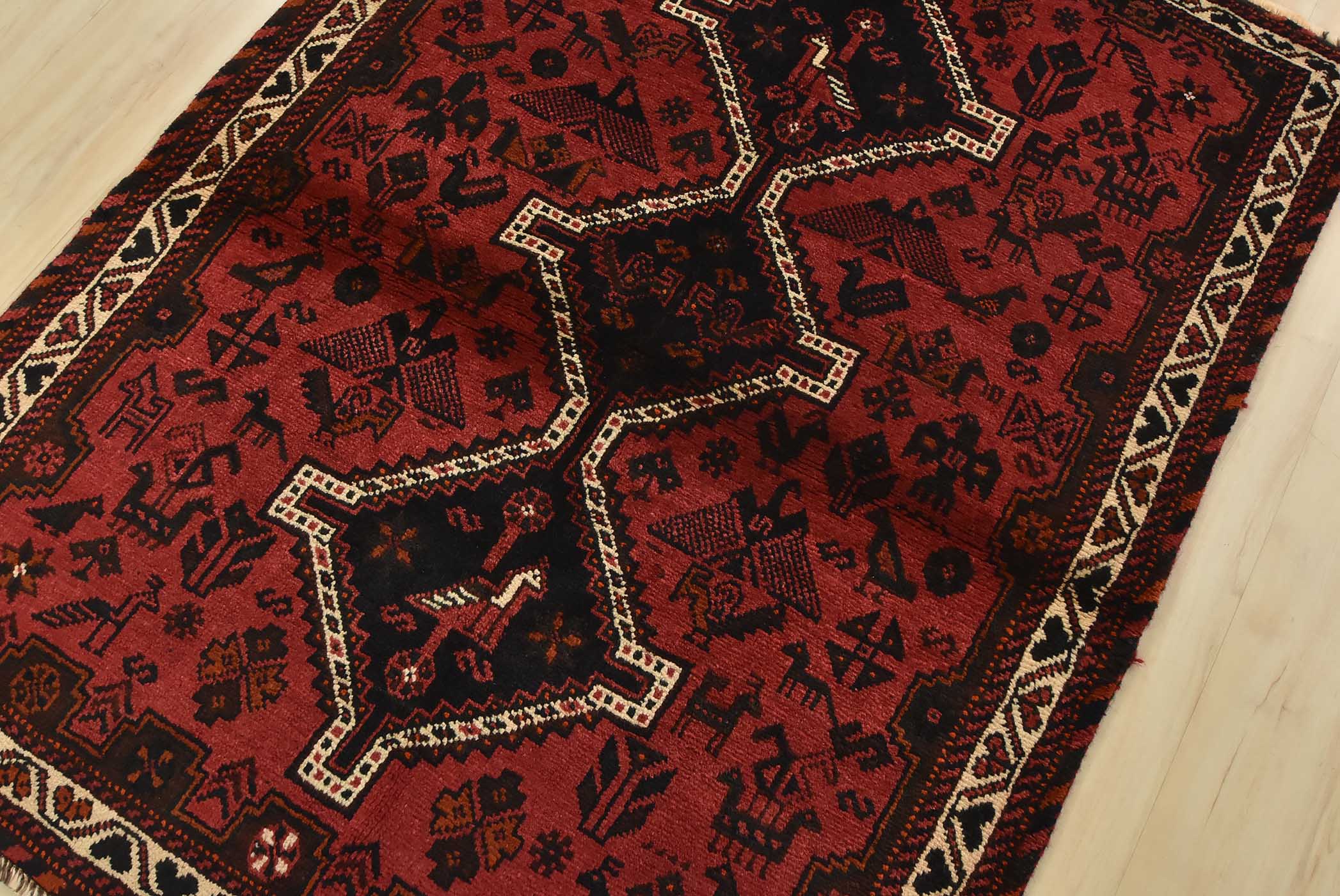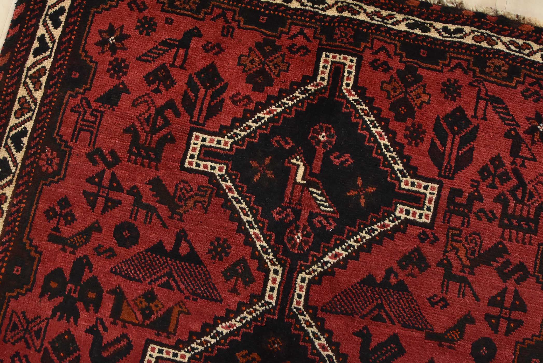 An authentic vintage tribal Shiraz rug hand-knotted with fine wool and natural dyes. This nomadic rug features geometric medallions surrounded by geometric motifs, including bird and animal figures. It has a full wool pile with no worn areas and is in very good condition.