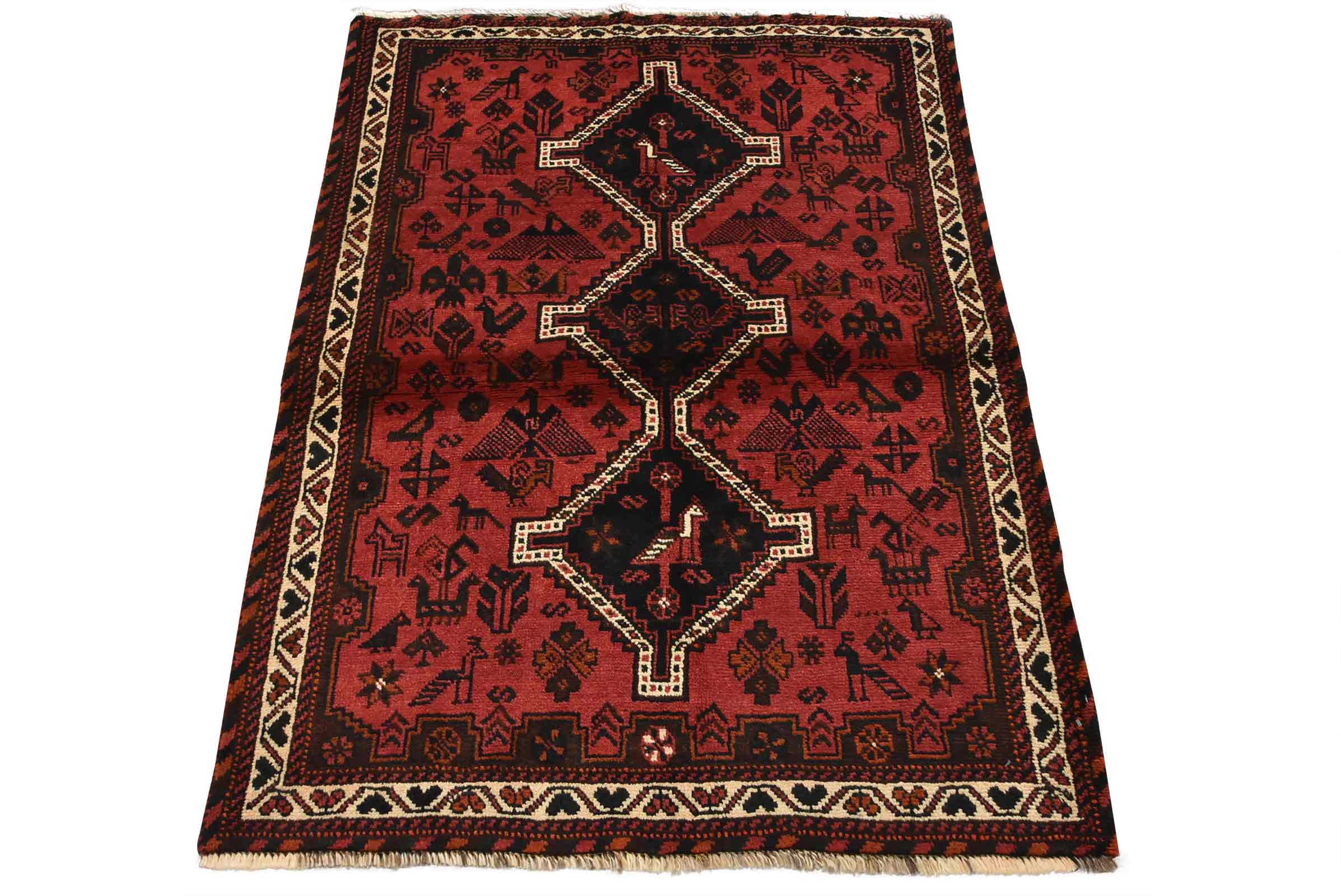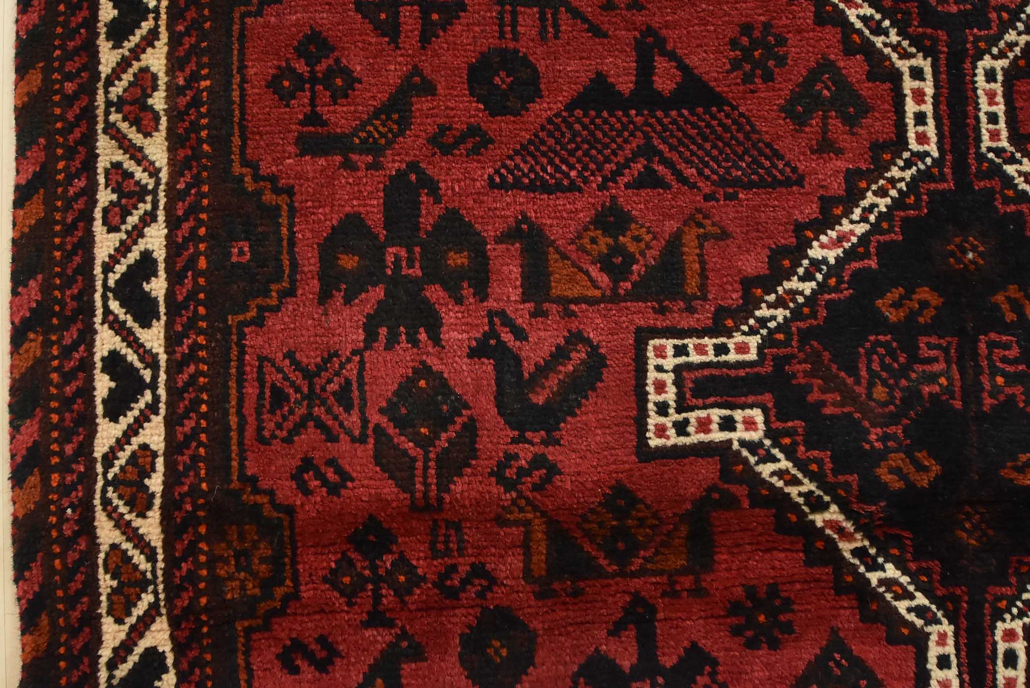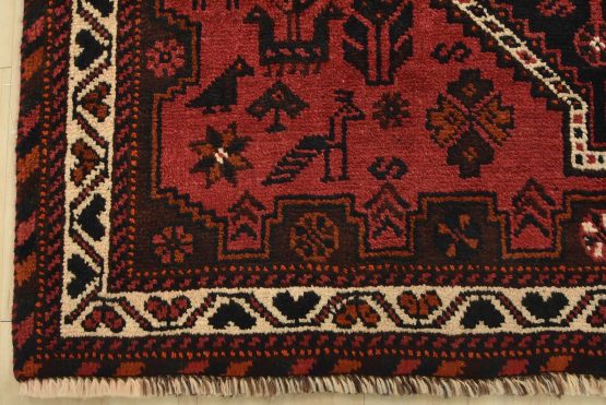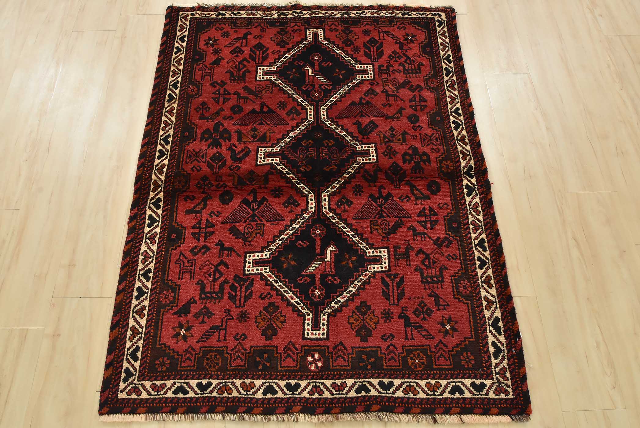 An authentic vintage tribal Shiraz rug hand-knotted with fine wool and natural dyes. This nomadic rug features geometric medallions surrounded by geometric motifs, including bird and animal figures. It has a full wool pile with no worn areas and is in very good condition.