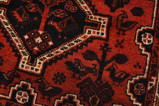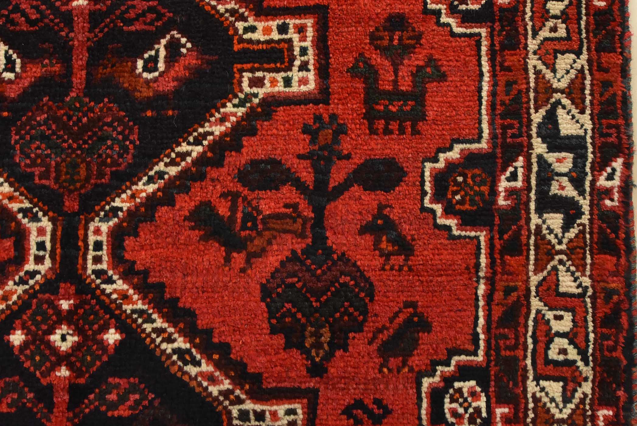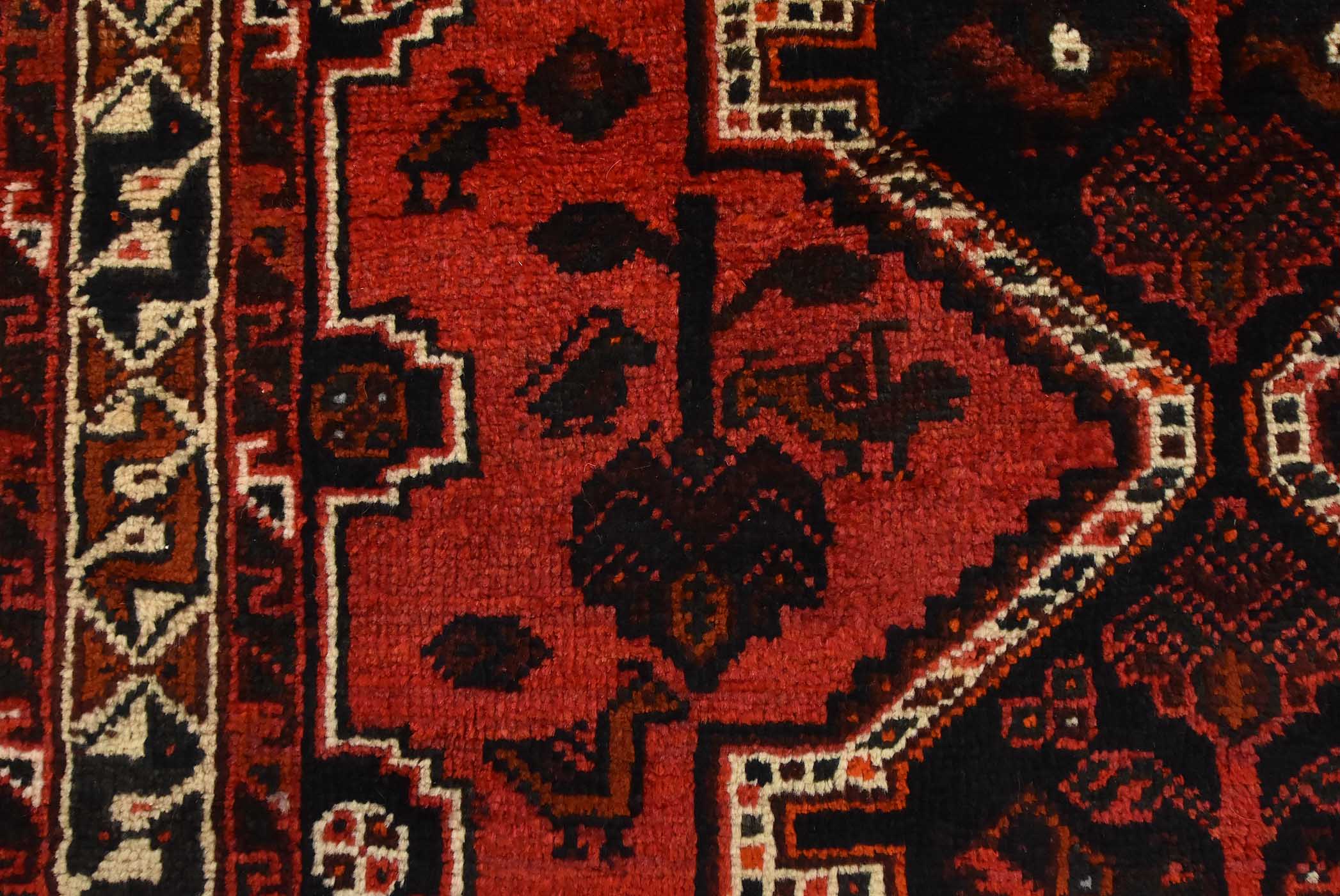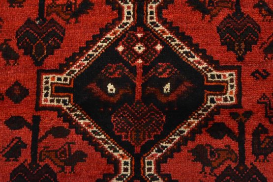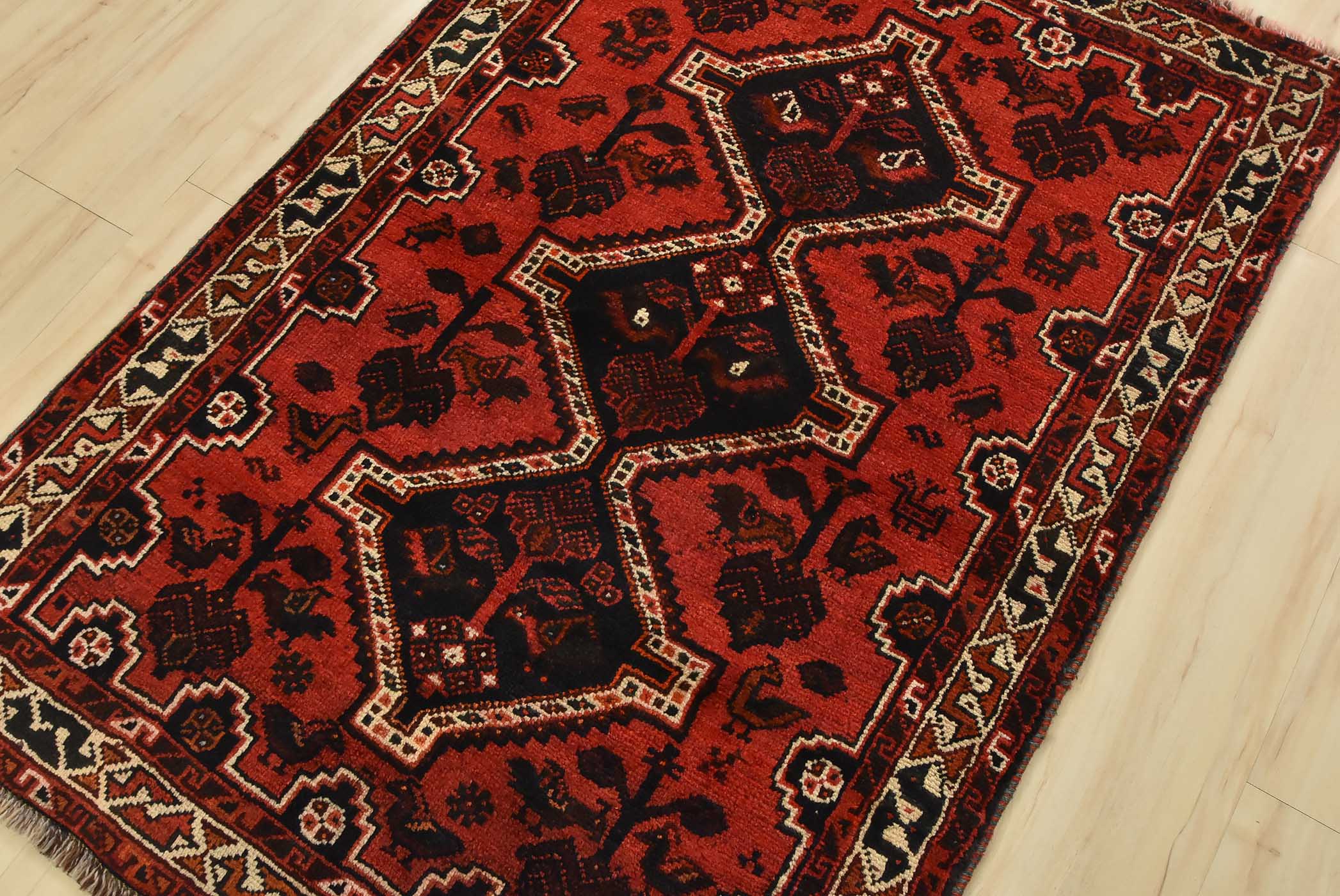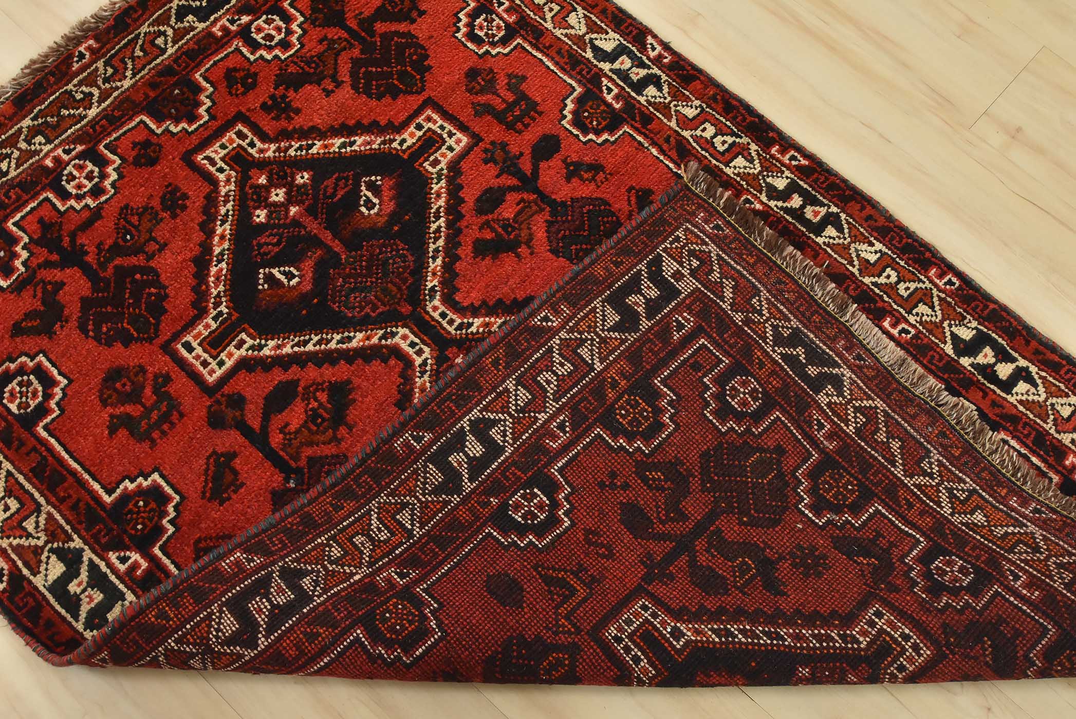 An authentic vintage tribal Shiraz rug hand-knotted with fine wool and natural dyes. This nomadic rug features geometric medallions surrounded by various motifs, including bird and animal figures, all set against a rich red background. It has a full pile with no worn areas and is in very good condition.
