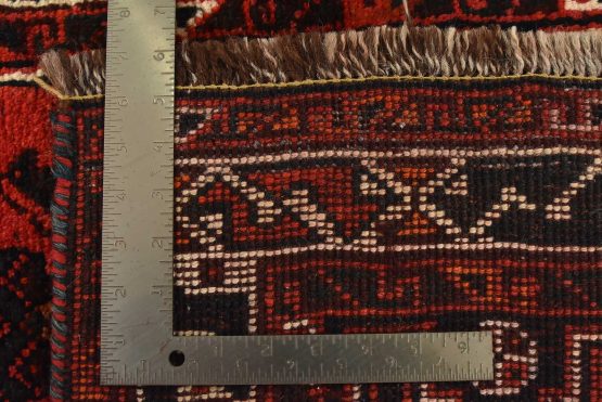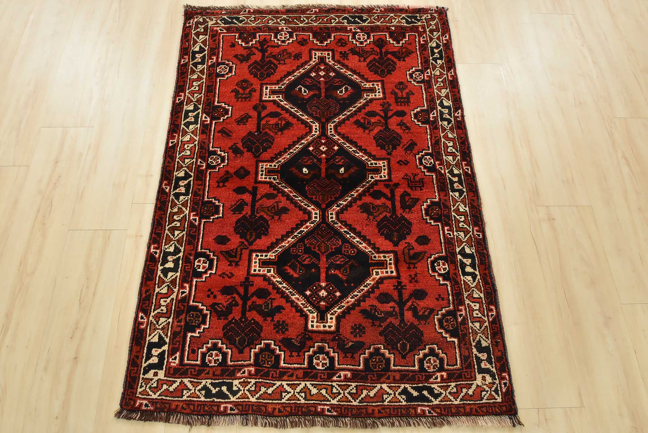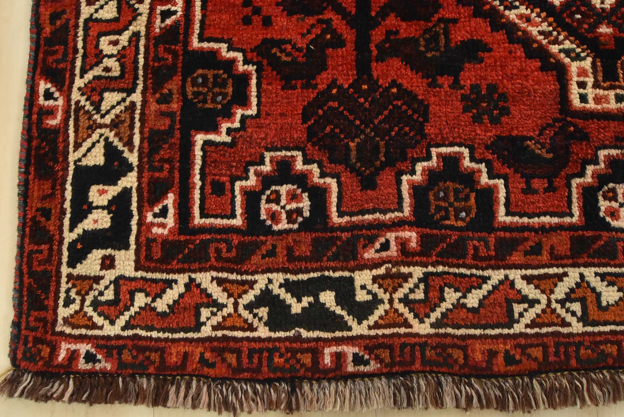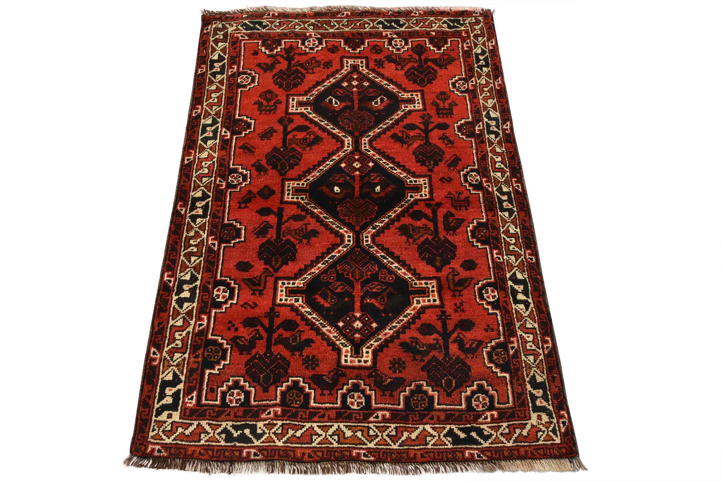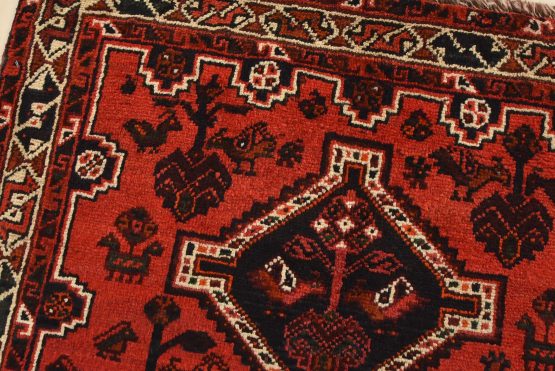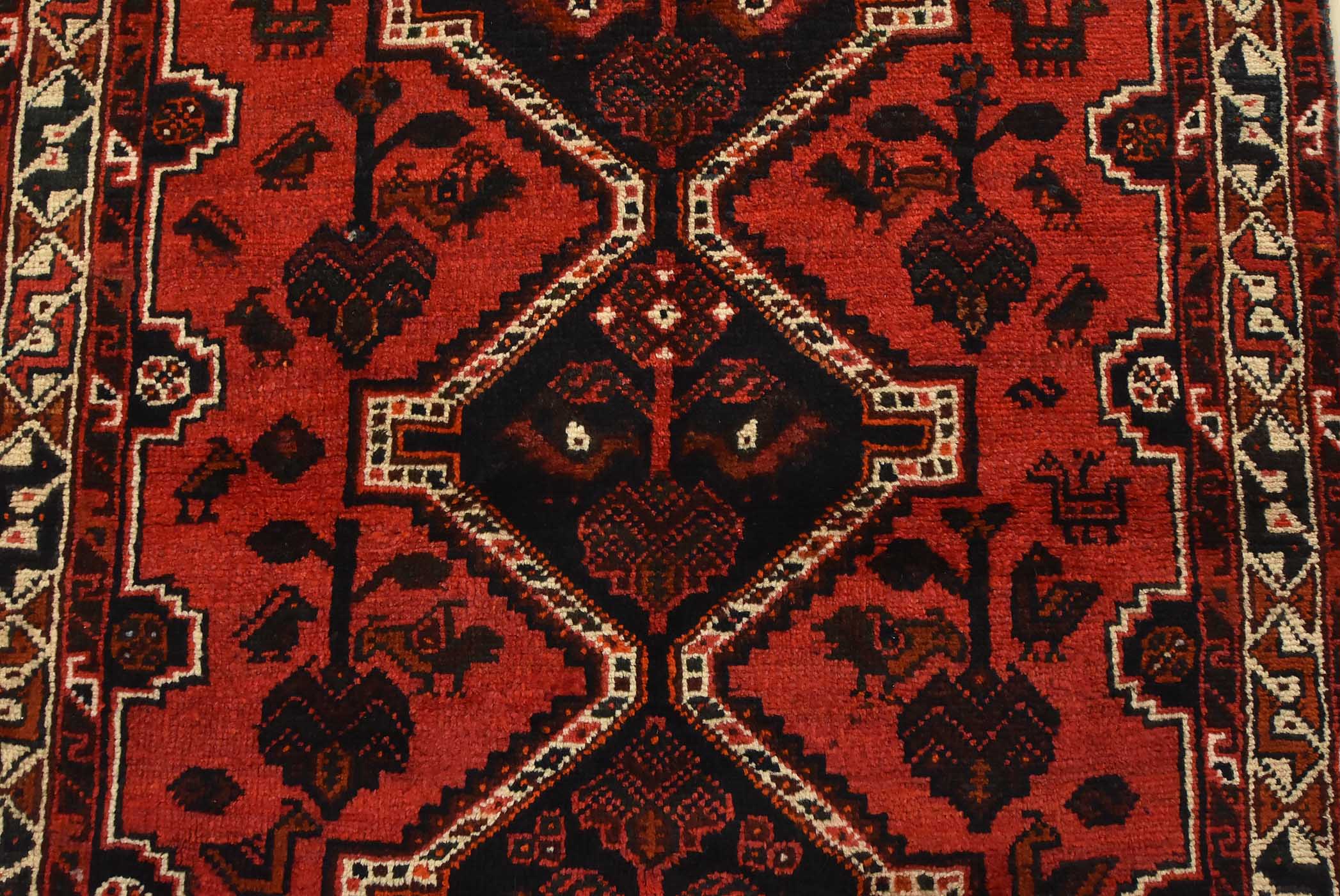 An authentic vintage tribal Shiraz rug hand-knotted with fine wool and natural dyes. This nomadic rug features geometric medallions surrounded by various motifs, including bird and animal figures, all set against a rich red background. It has a full pile with no worn areas and is in very good condition.