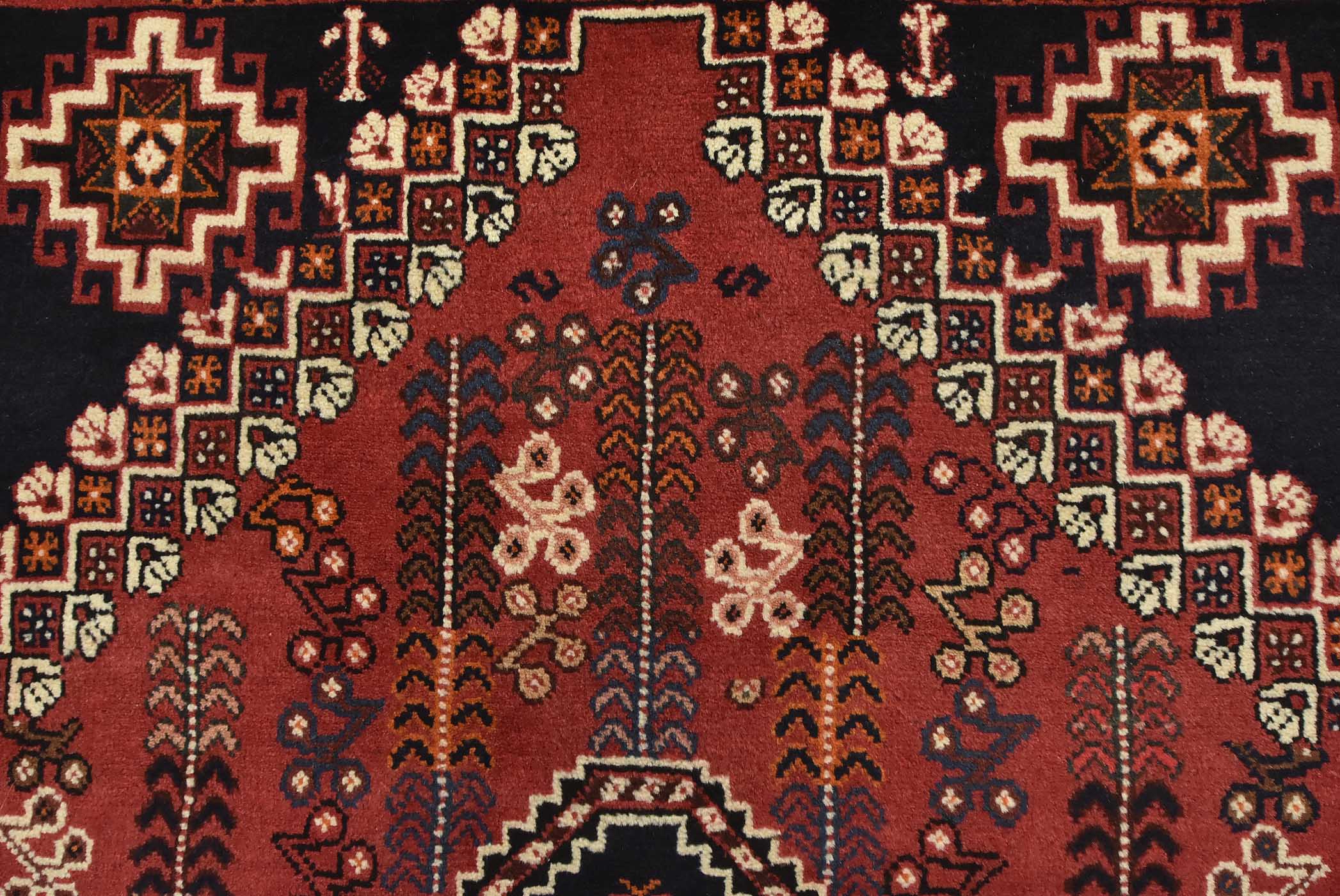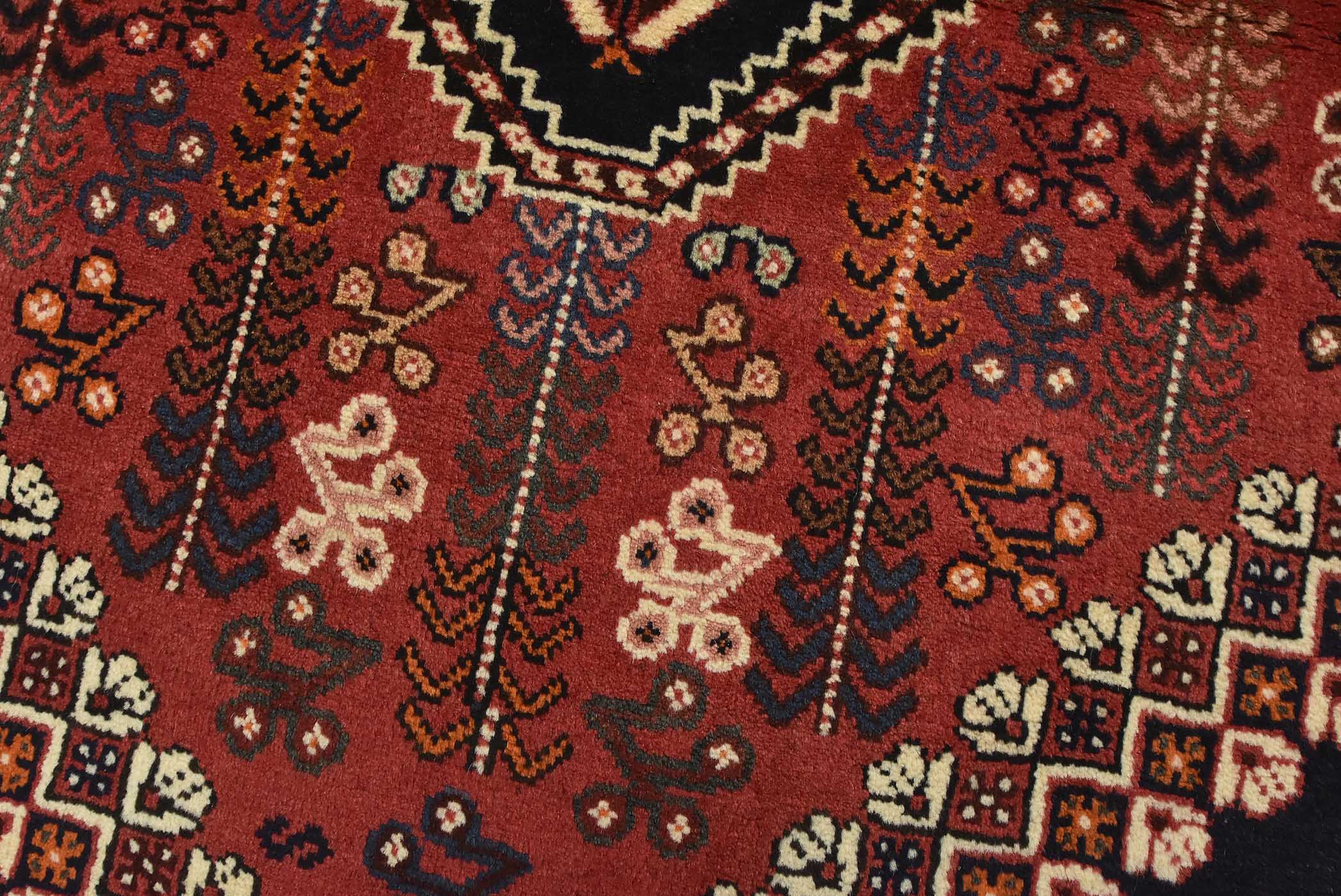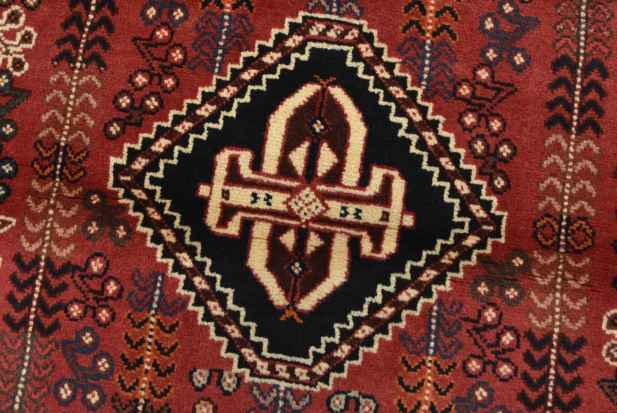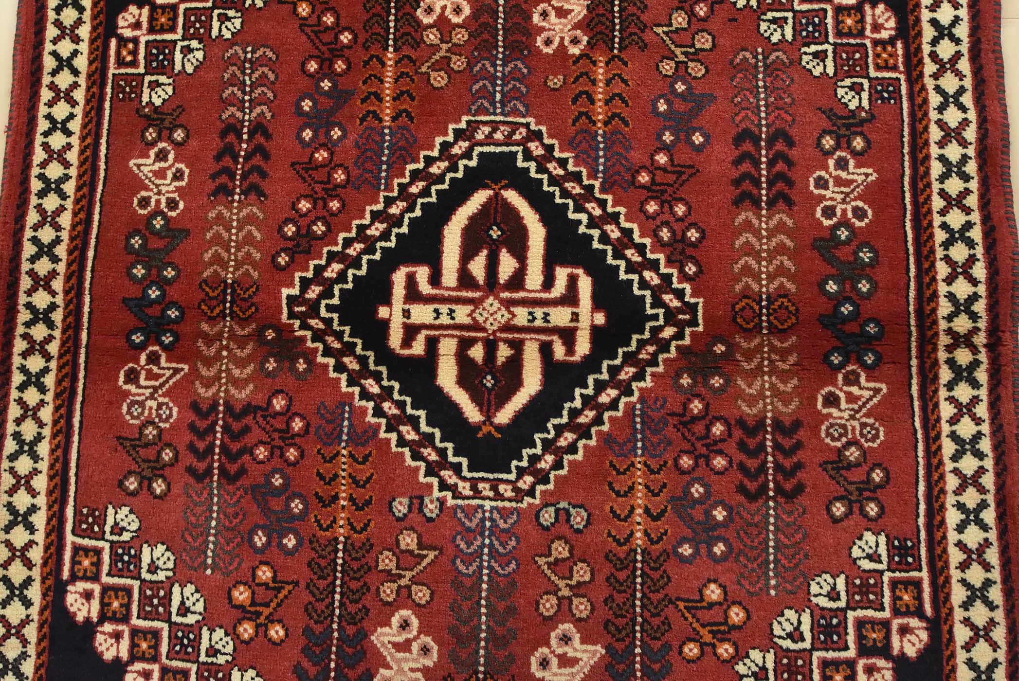 An authentic vintage tribal Shiraz rug hand-knotted with fine wool and natural dyes. This nomadic rug features a central geometric medallion surrounded by botanical motifs set against a red background. It has a full wool pile with no worn areas and is in very good condition.
