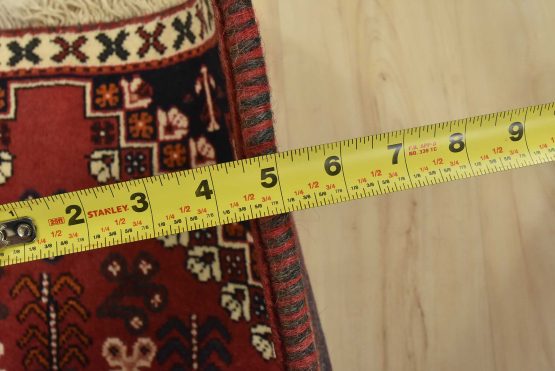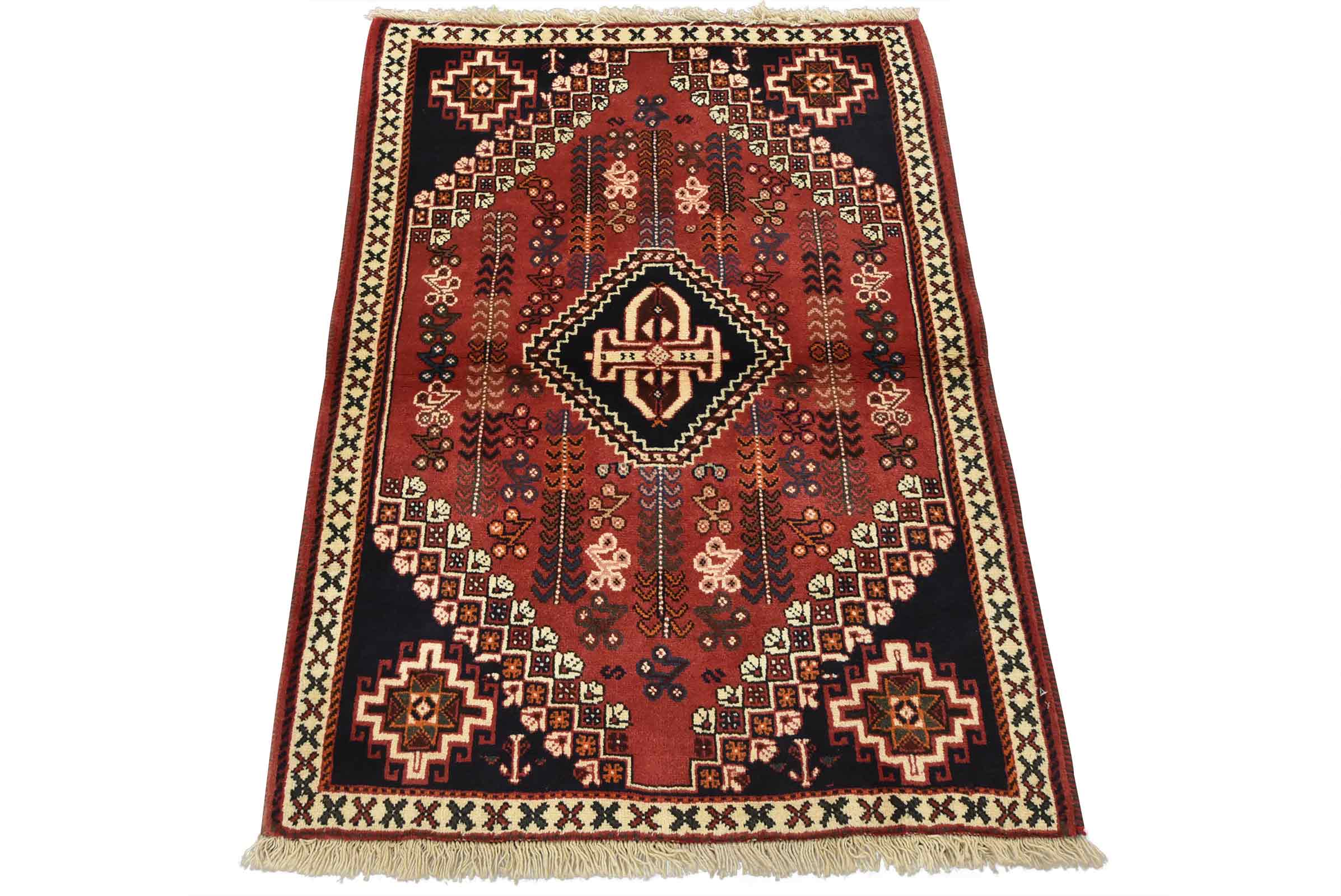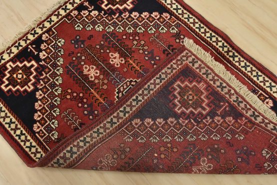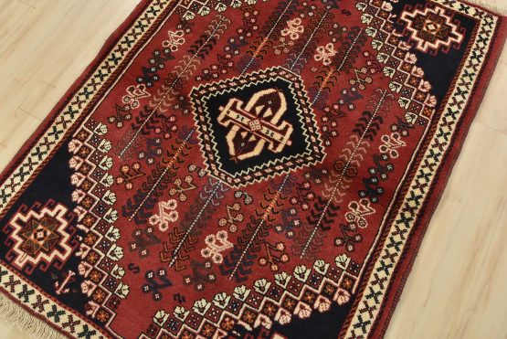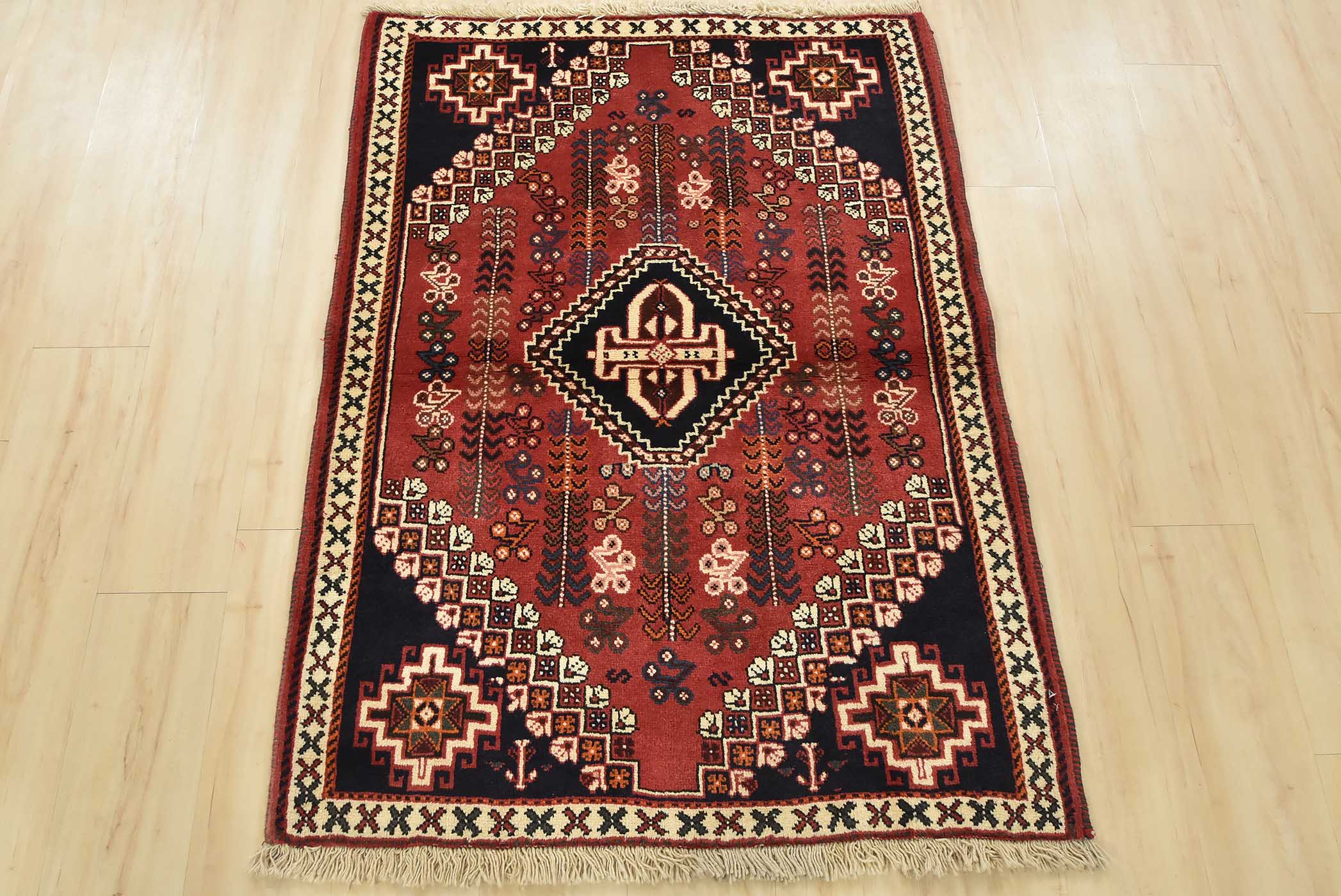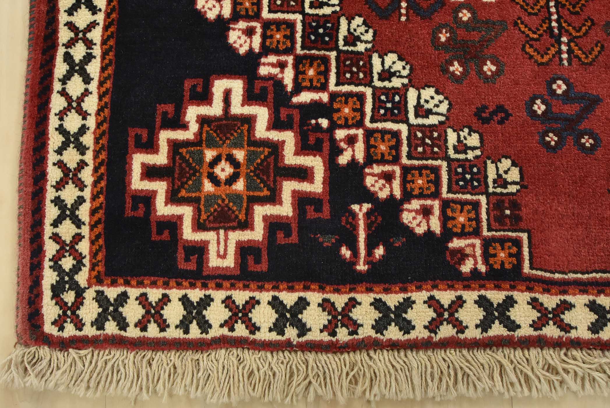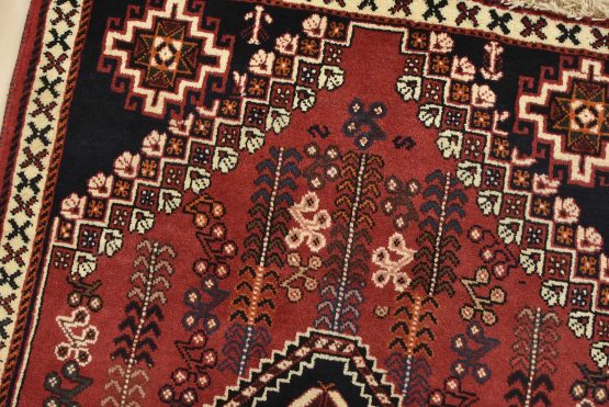 An authentic vintage tribal Shiraz rug hand-knotted with fine wool and natural dyes. This nomadic rug features a central geometric medallion surrounded by botanical motifs set against a red background. It has a full wool pile with no worn areas and is in very good condition.