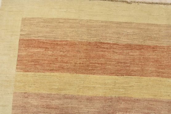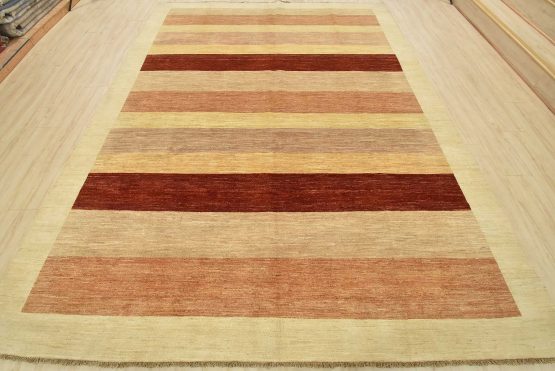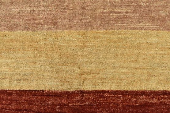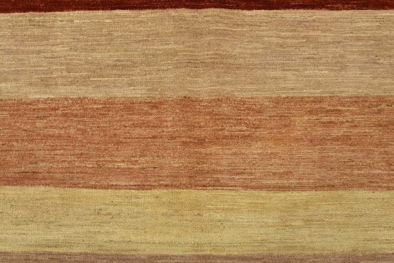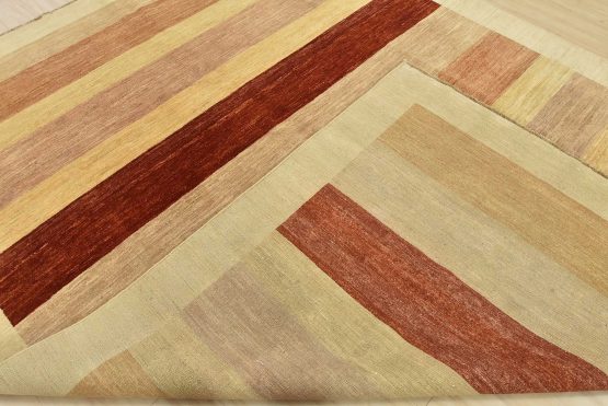 A contemporary Gabbeh rug hand-knotted with an all-wool pile on a cotton foundation. This area rug features a multicolored striped pattern. It is new and in excellent condition.