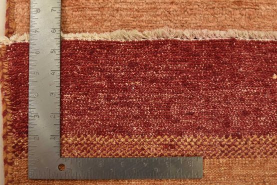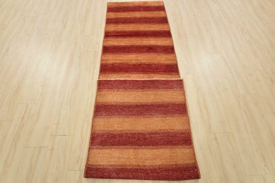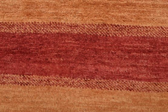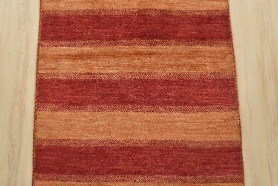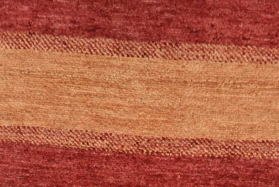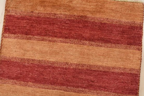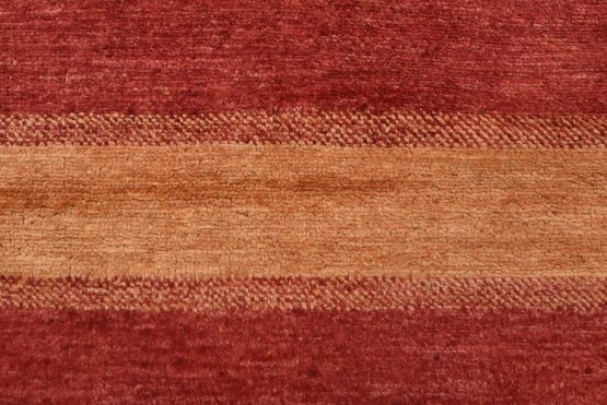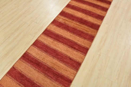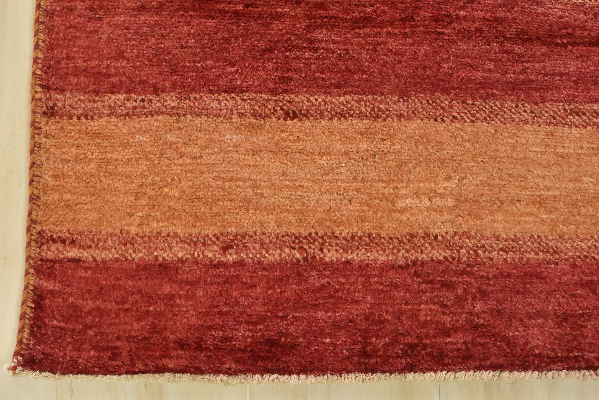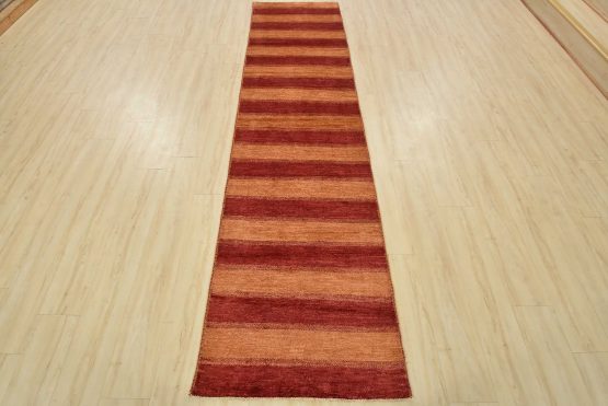 A contemporary Gabbeh runner hand-knotted with an all-wool pile on a cotton foundation. This oriental rug features gold and red horizontal stripes. It is new and in excellent condition.