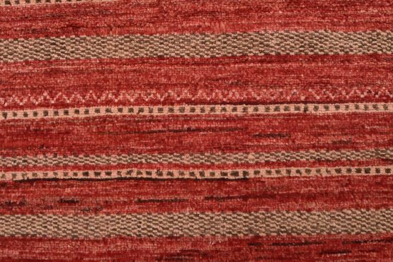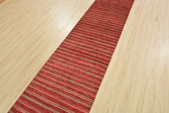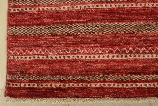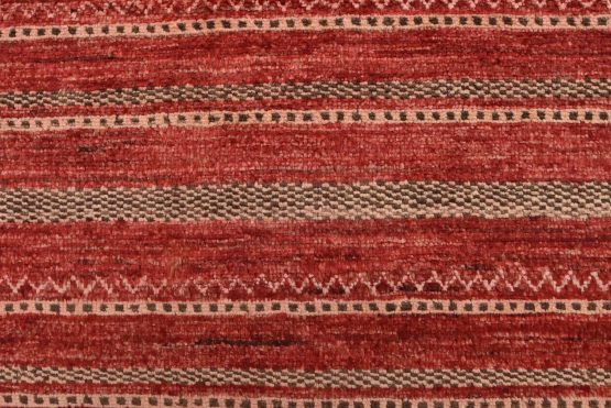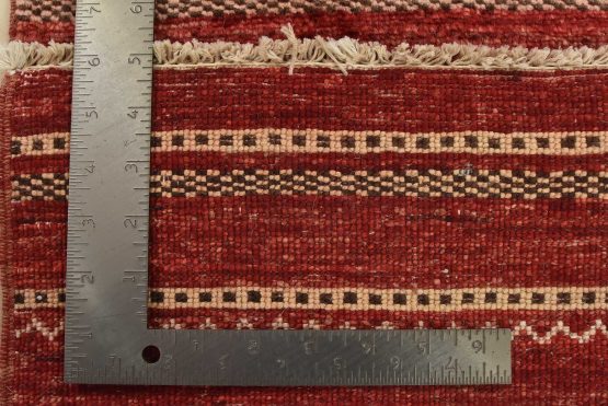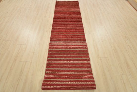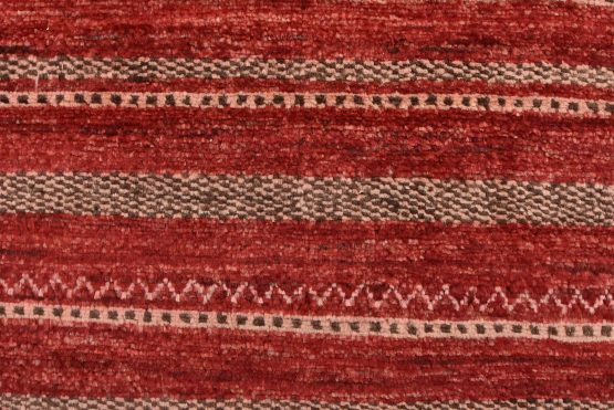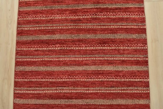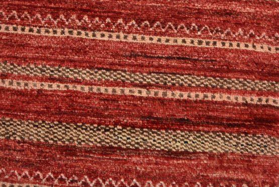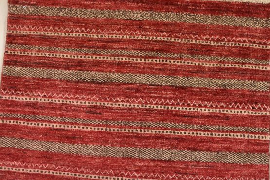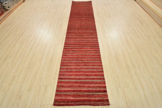 A contemporary Gabbeh runner hand-knotted with an all-wool pile on a cotton foundation. This oriental rug features stripes adorned with geometric patterns set against a red background. It is new and in excellent condition.