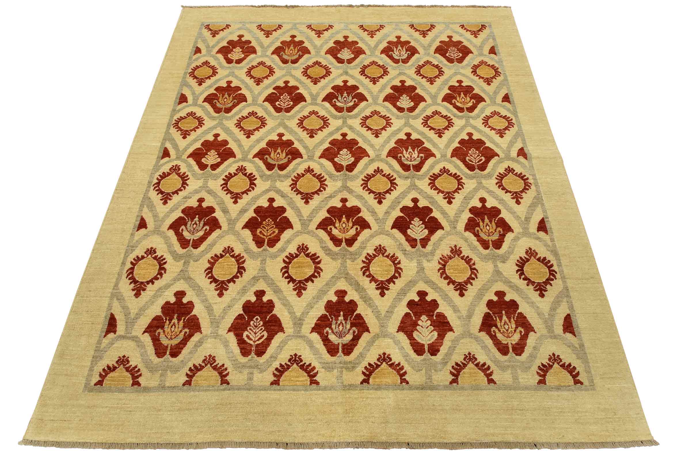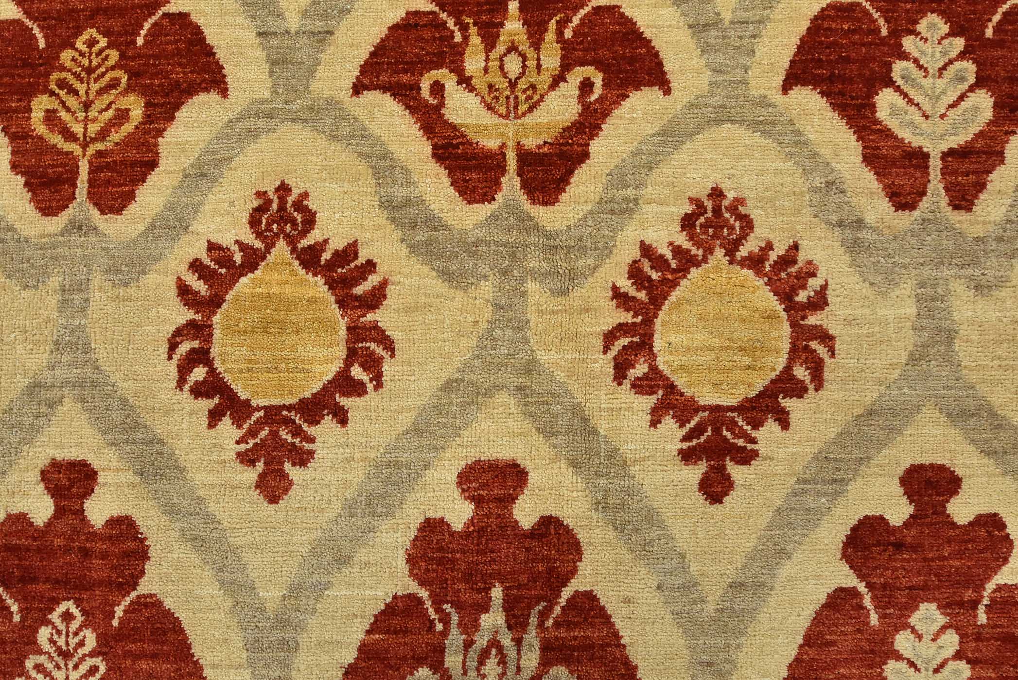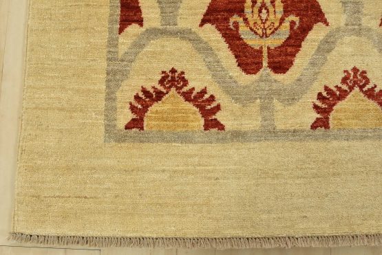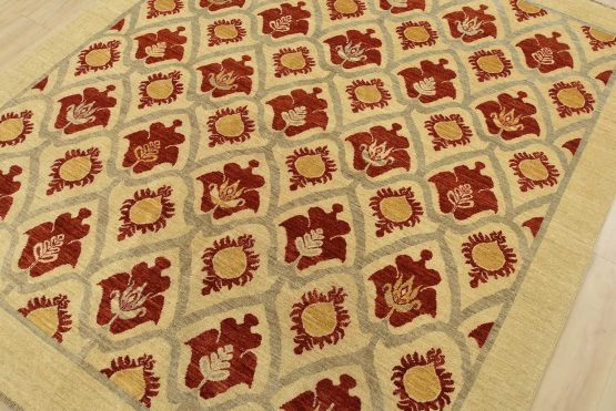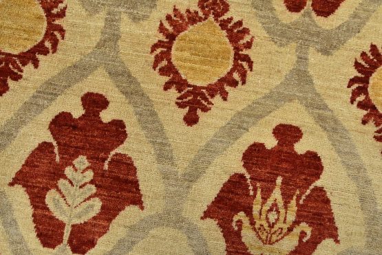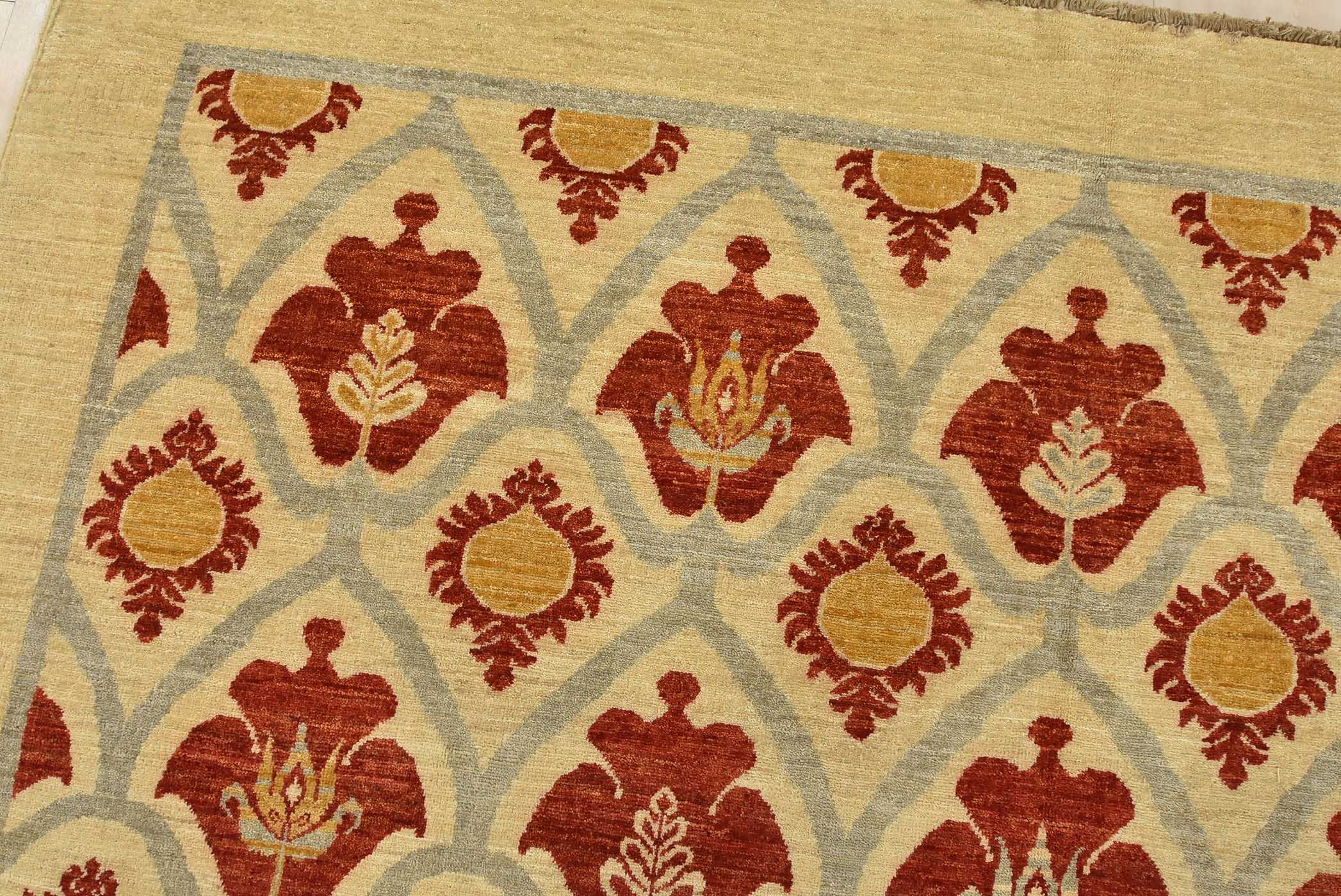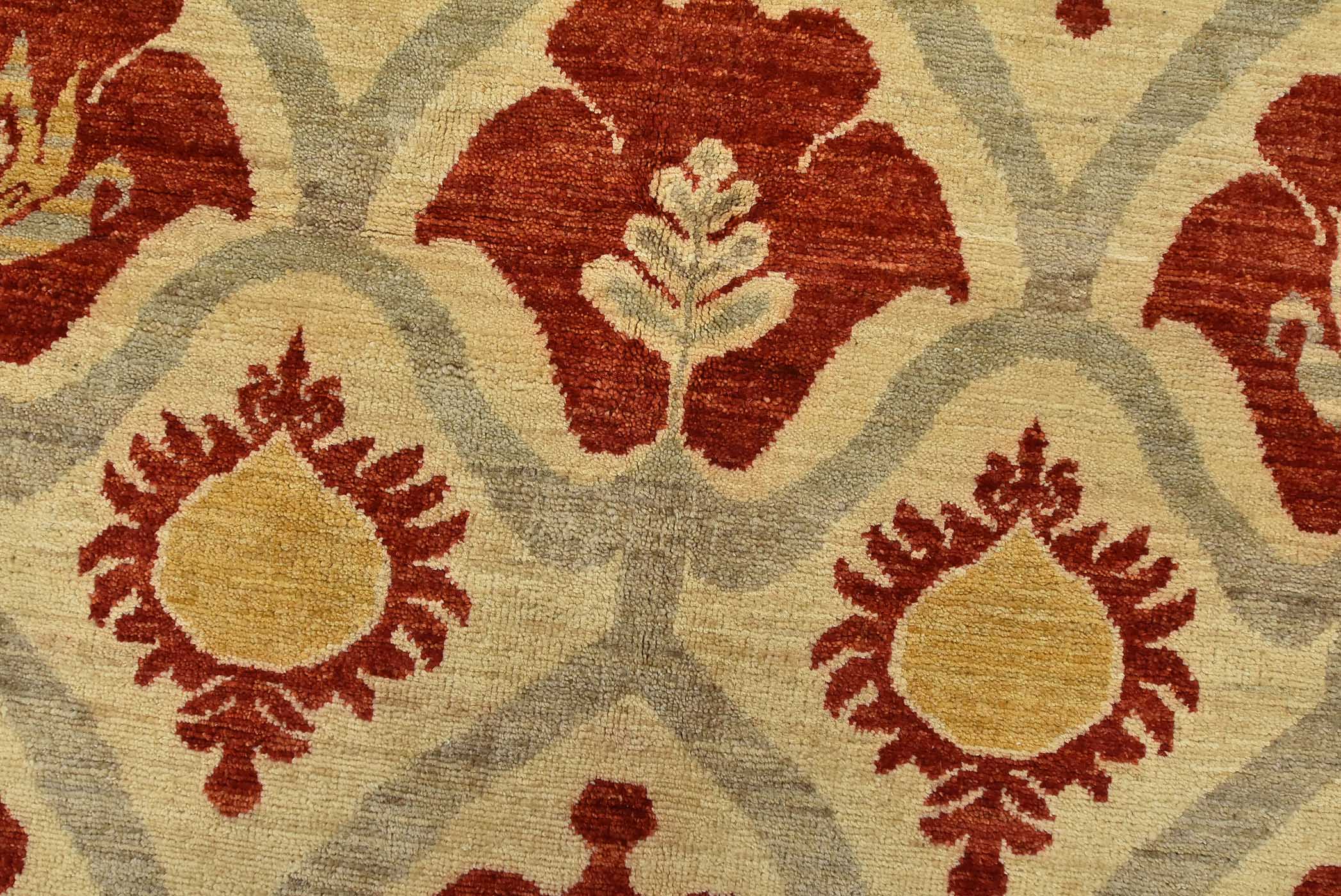A traditional Suzani rug hand-knotted with fine wool on a cotton foundation. This rug features an all over botanical pattern set against a beige background. It is new and in excellent condition.