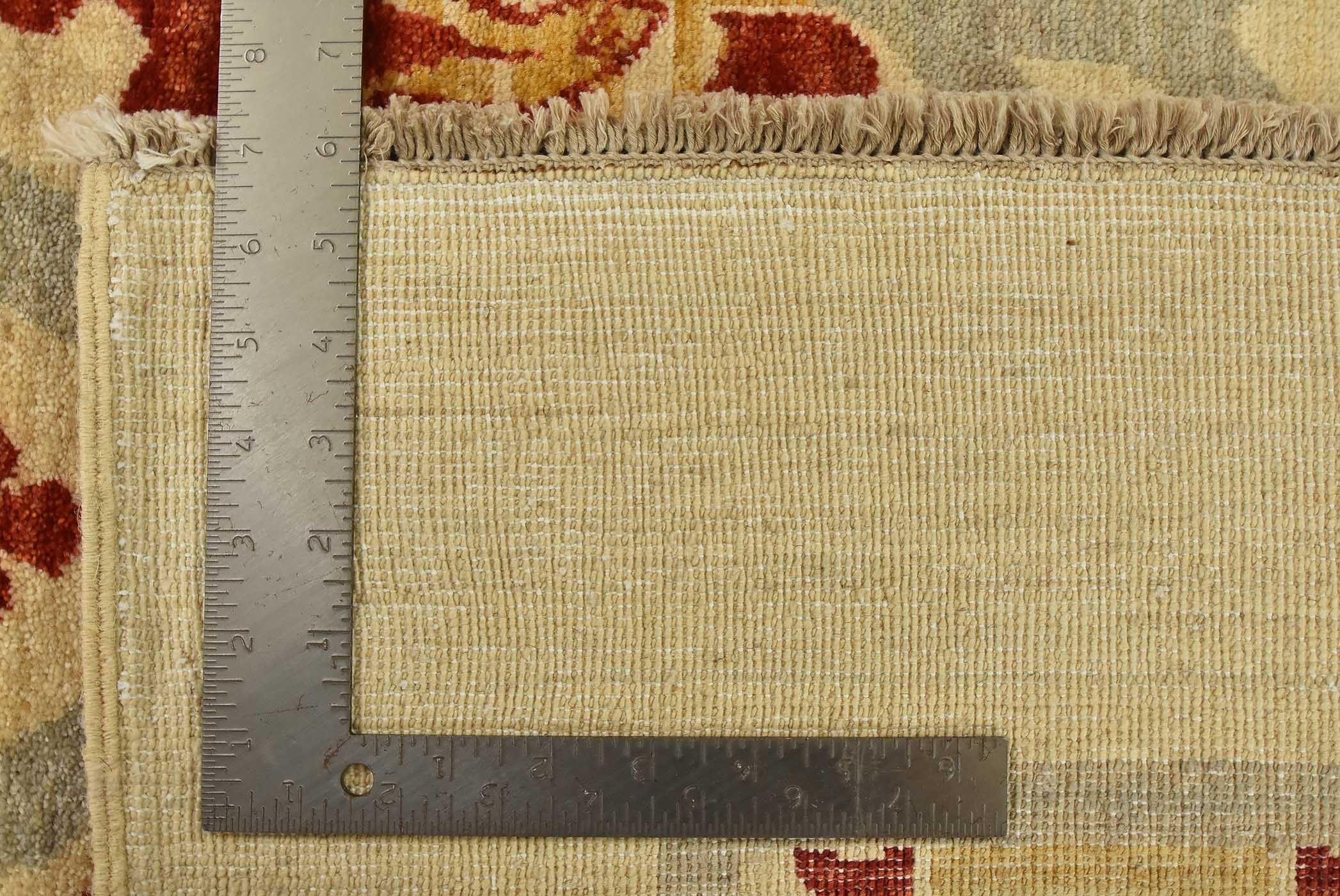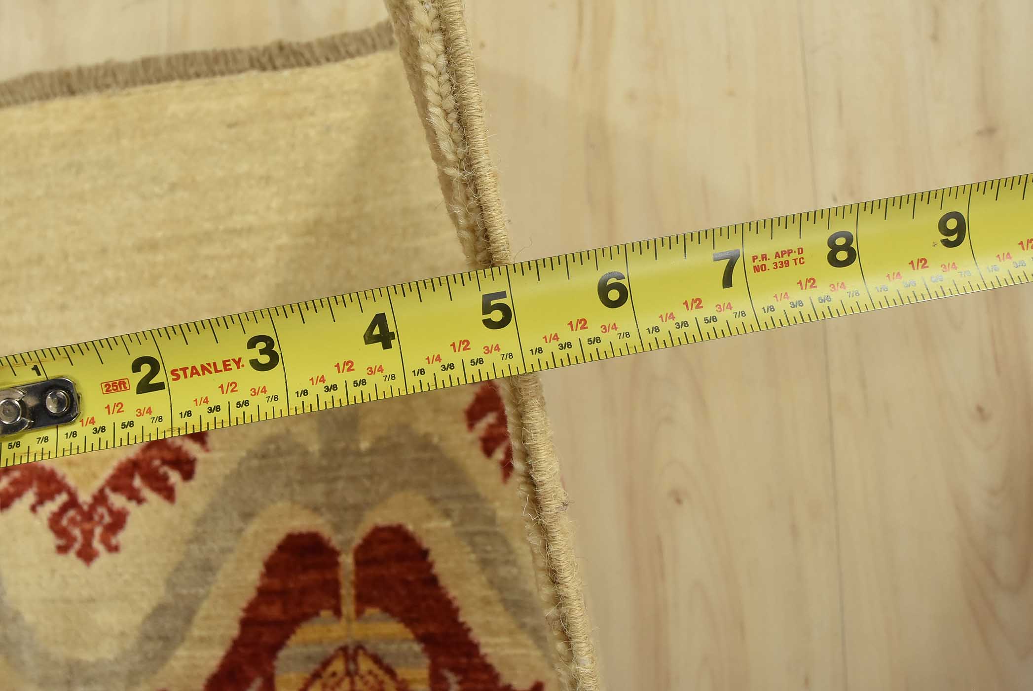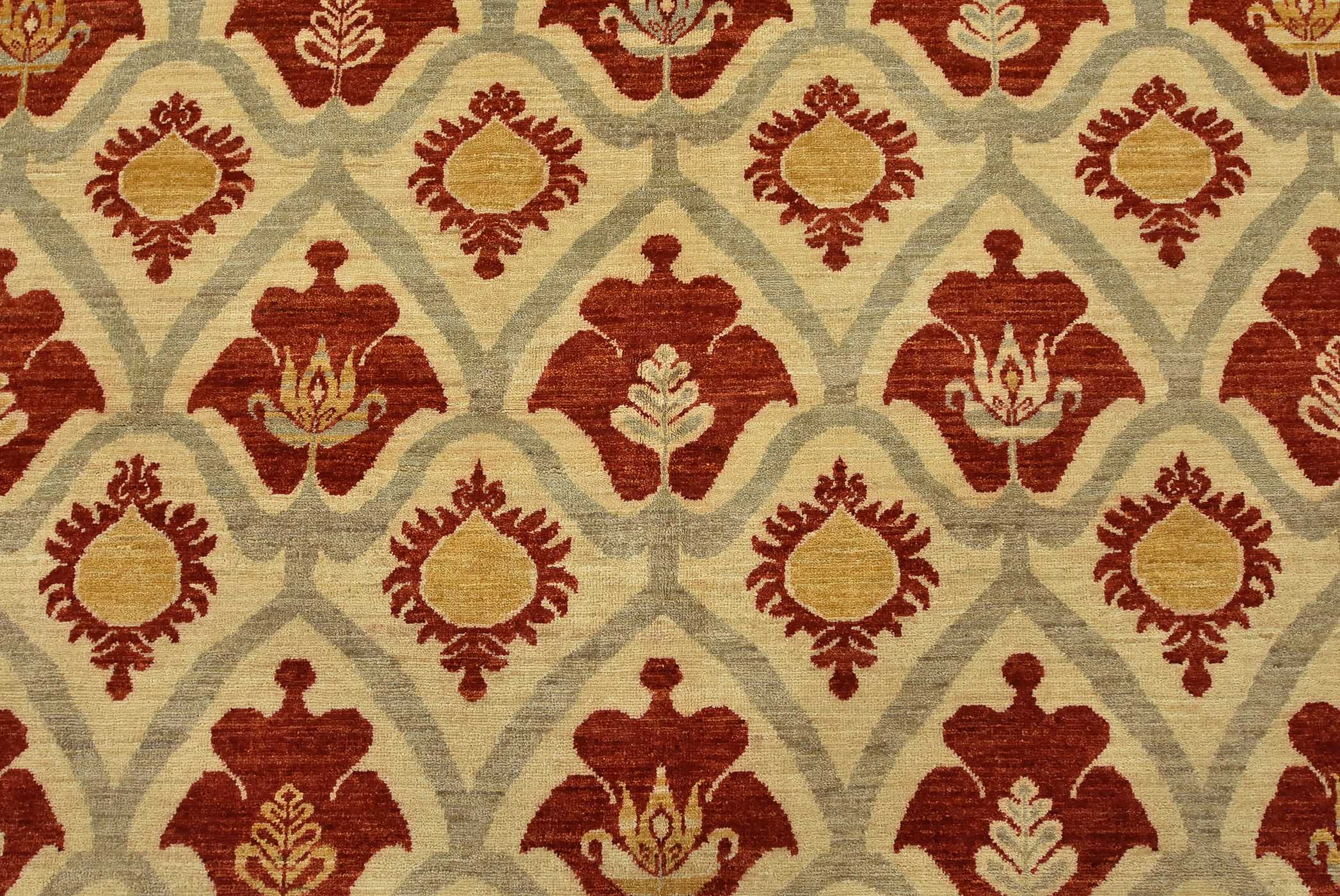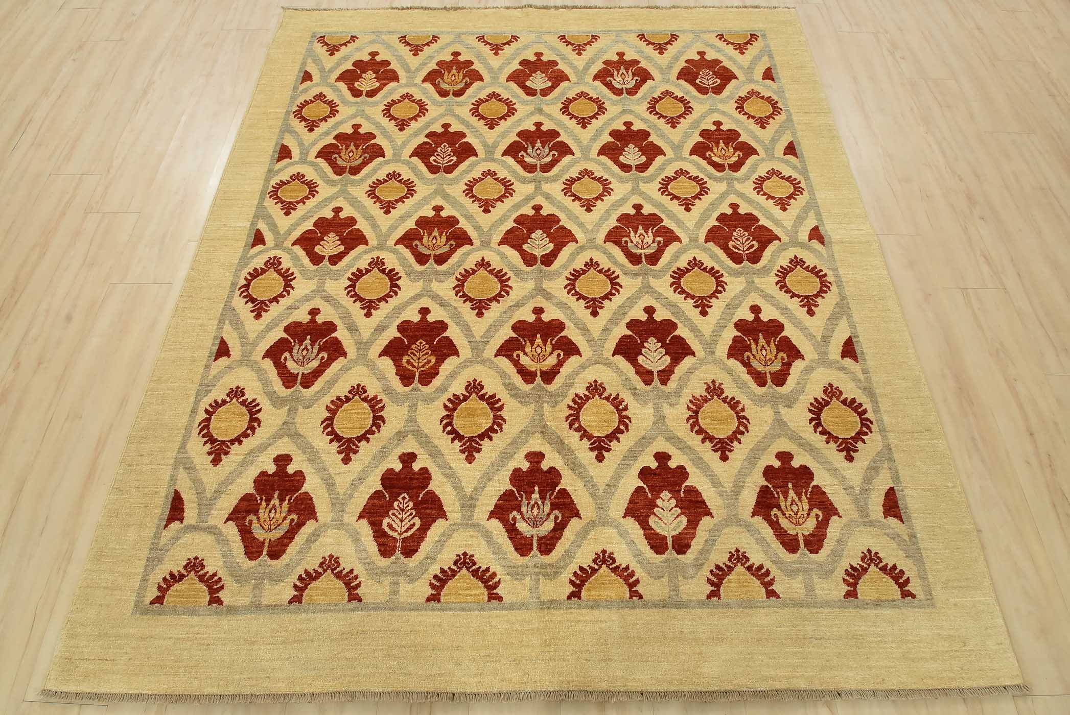 A traditional Suzani rug hand-knotted with fine wool on a cotton foundation. This rug features an all over botanical pattern set against a beige background. It is new and in excellent condition.