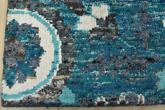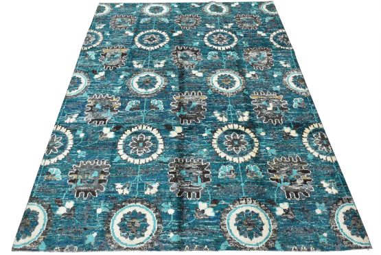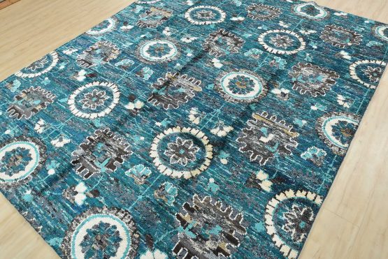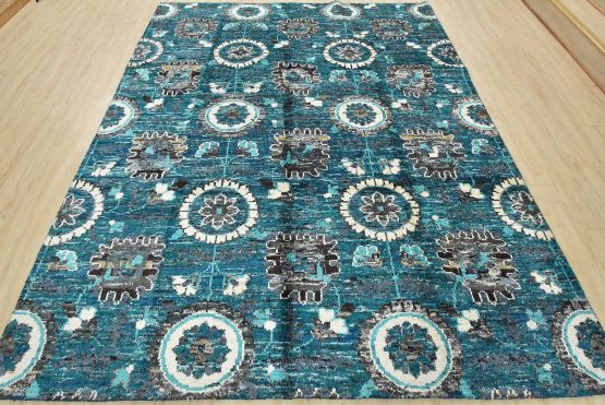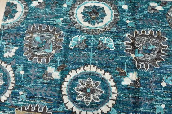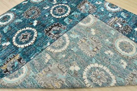 A modern Suzani rug hand-knotted with a viscose pile on a cotton foundation. This oriental rug features rows of circular medallions surrounded by botanical motifs set against a blue background. It is new and in excellent condition.