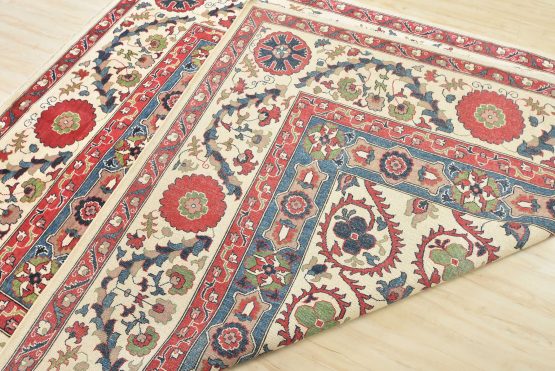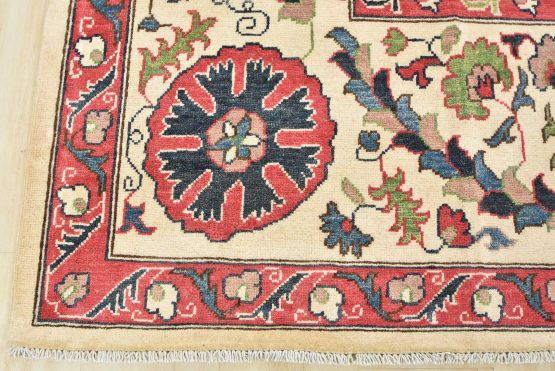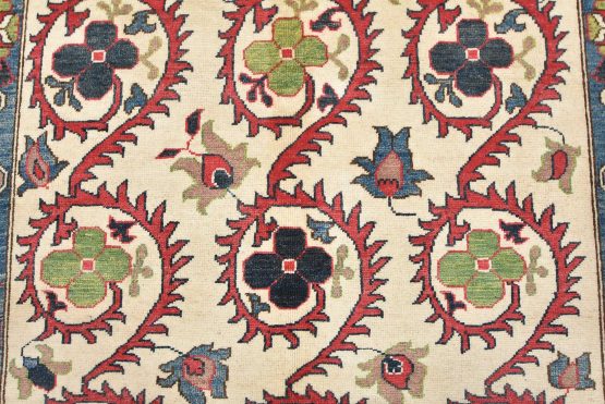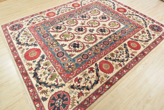 A traditional Suzani rug hand-knotted with an all-wool pile on a cotton foundation. This oriental rug features an all-over botanical design adorned with flowers set against a beige background. It is new and in excellent condition.